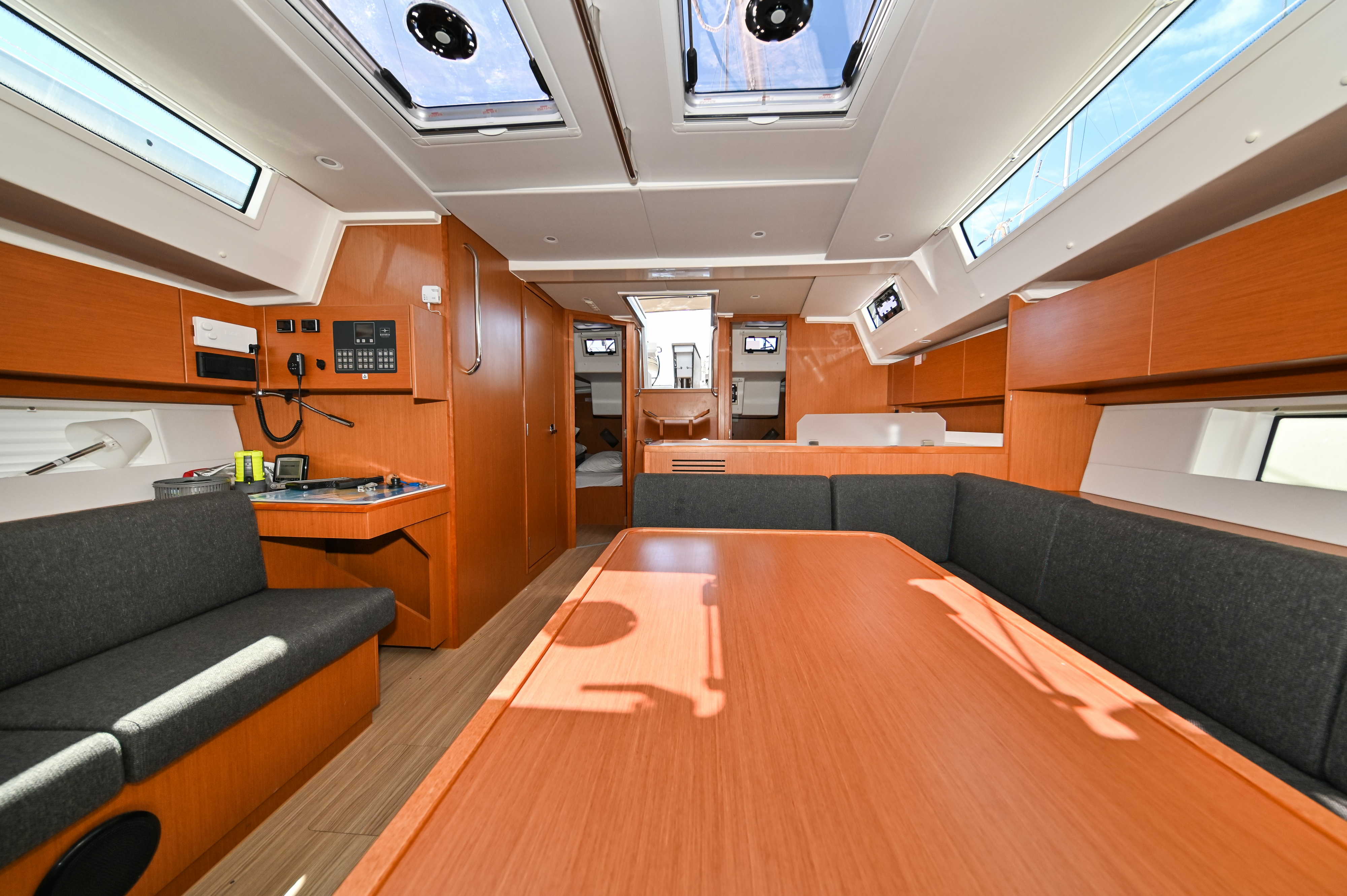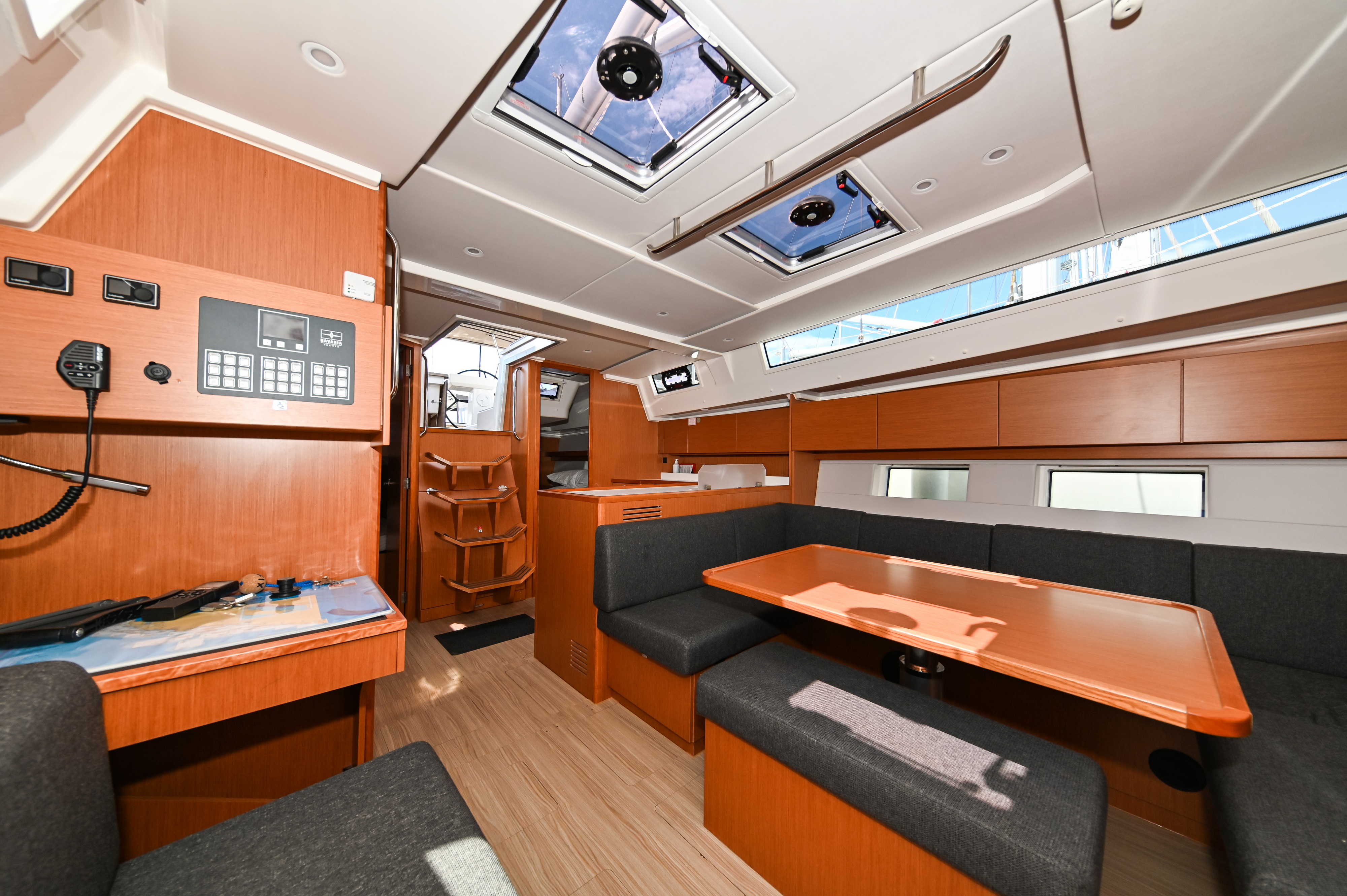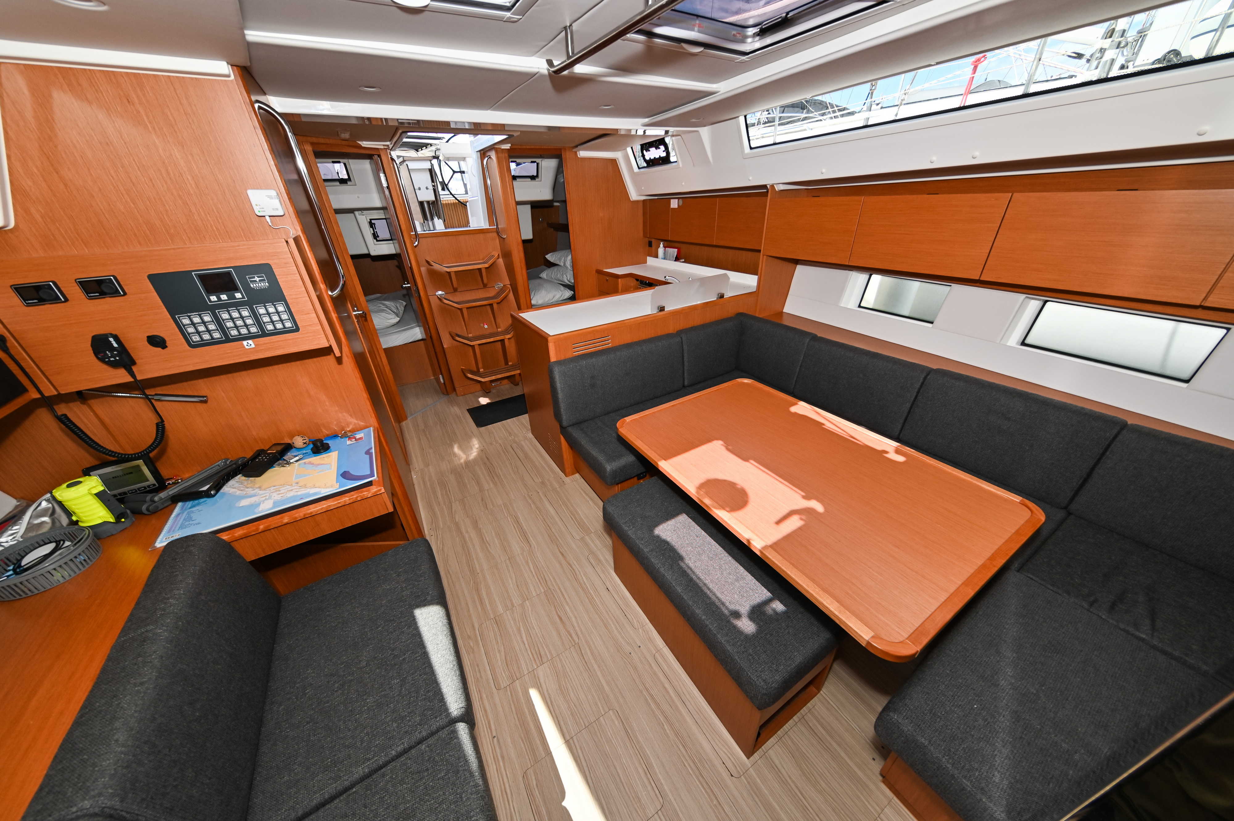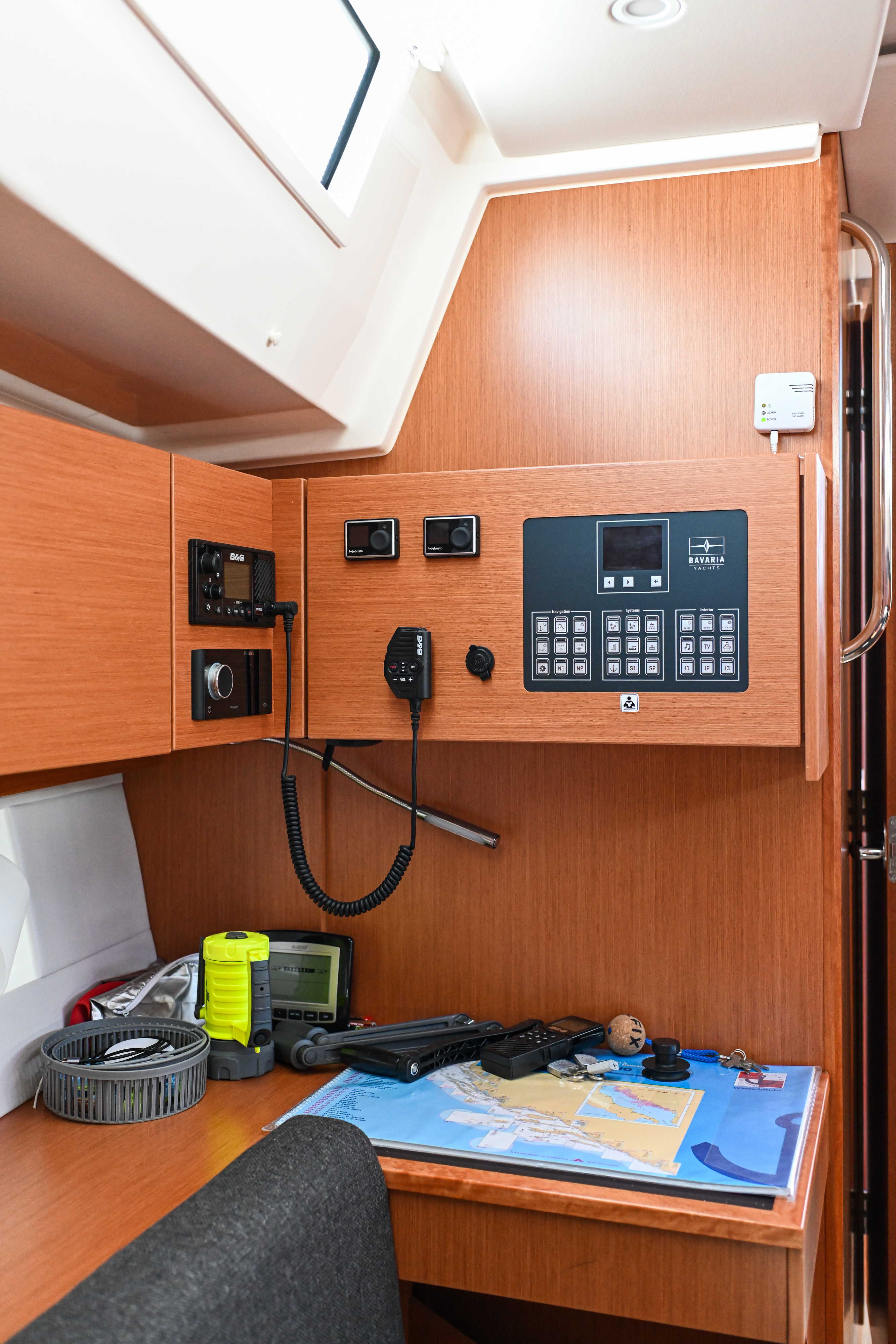 | Navigation | Barometer, GPS mit Kartenplotter im Cockpit, Hafenhandbücher, Handpeilkompass, Kompass, Navigationsbesteck, Seekarten, Sumlog, Windmesser |