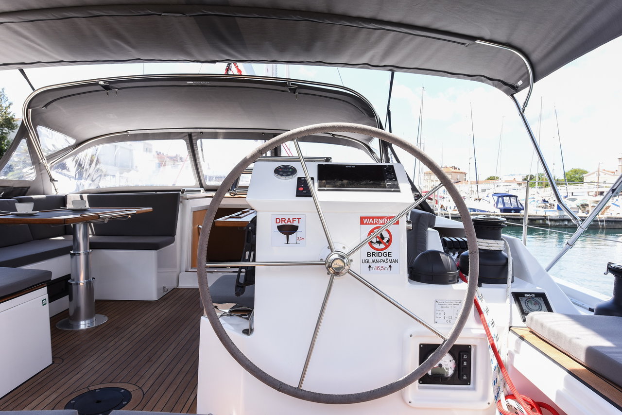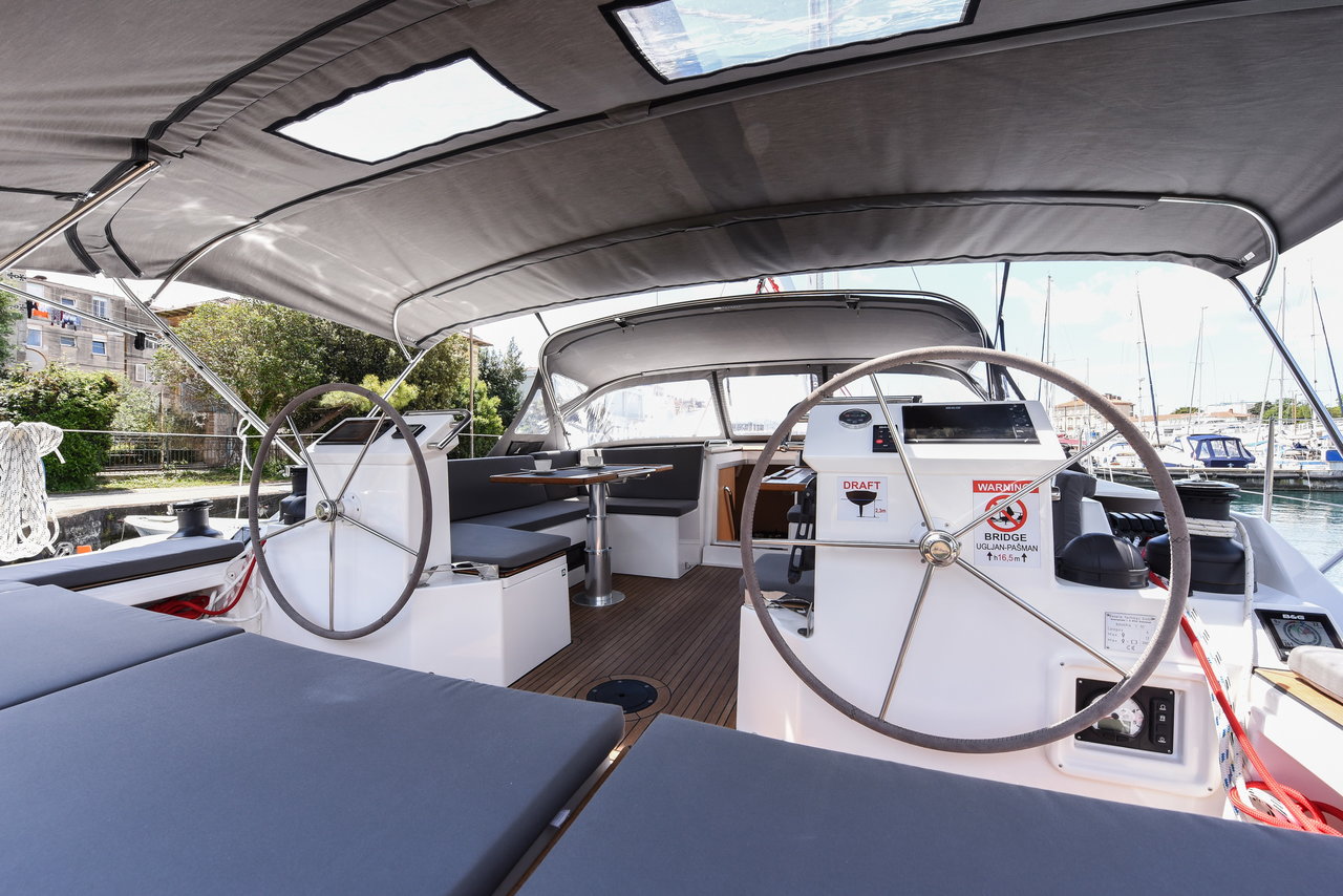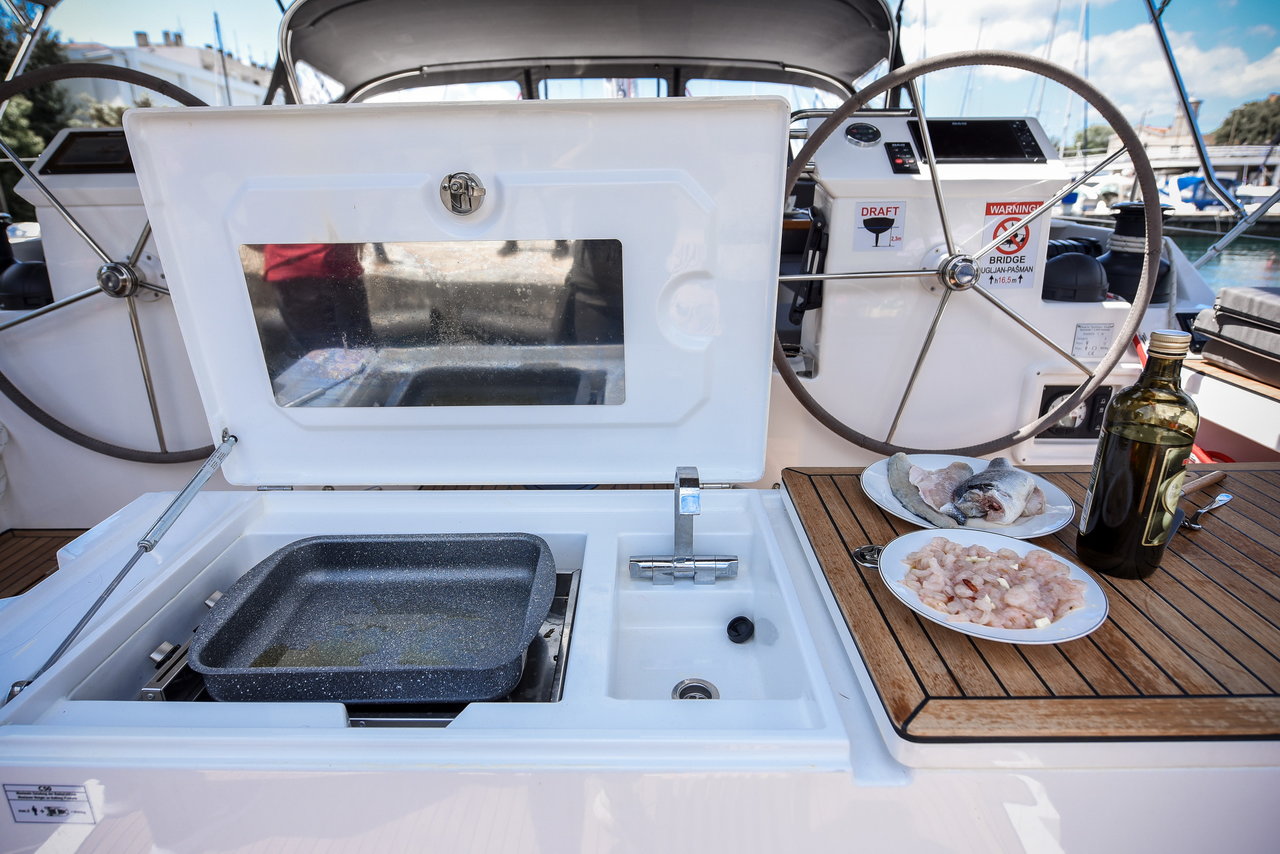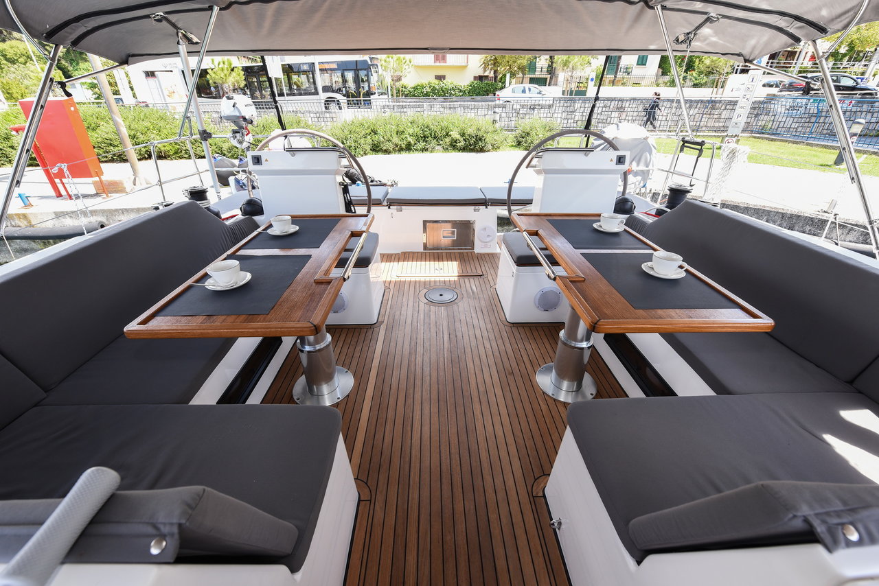 | Outside | Anker mit Kette, Badeleiter, Biminitop, Bootshaken, Cockpitdusche, Cockpitlautsprecher, Cockpitpolster, Cockpittisch (klappbar), elektr. Ankerwinsch, elektr. Winsch, Faltpropeller, Fender, Festmacherleinen, Gangway, Solaranlage, Sprayhood, Unterwasserbeleuchtung, Wasserschlauch, Windex |