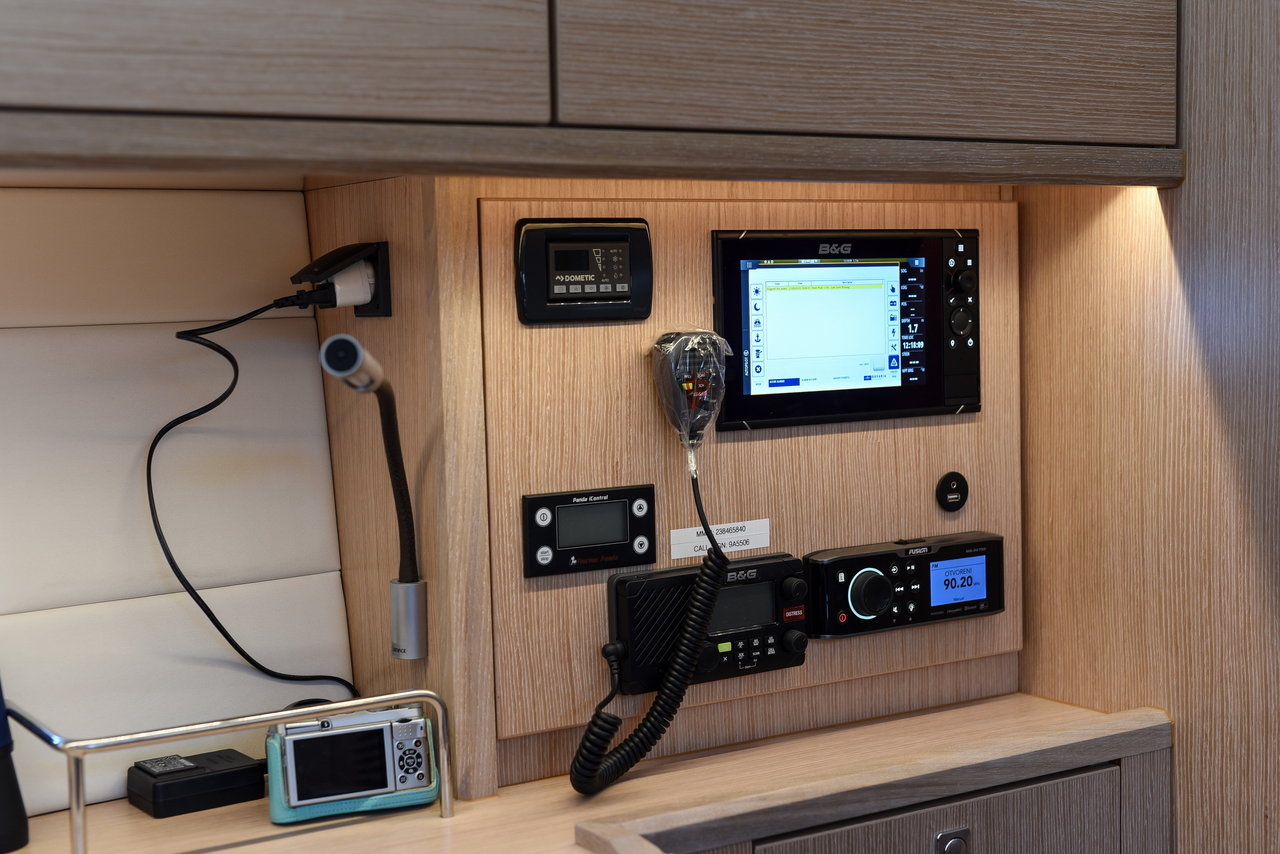 | Navigation | Echolot, elektr. Seekarten, Fernglas, GPS mit Kartenplotter, Hafenhandbücher, Handpeilkompass, Kompass, Navigationsbesteck, Radar, Seekarten, Sumlog, Windmesser |