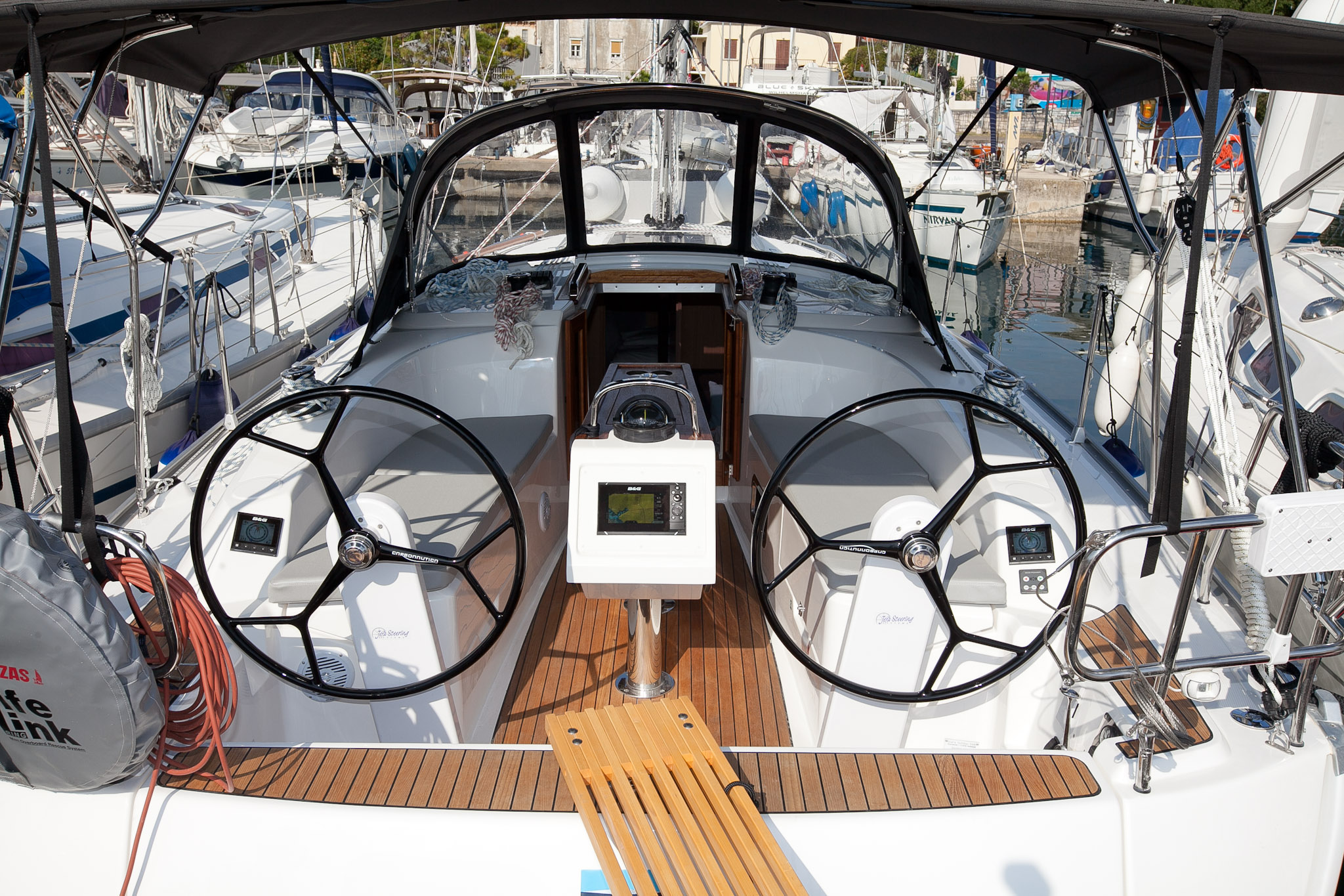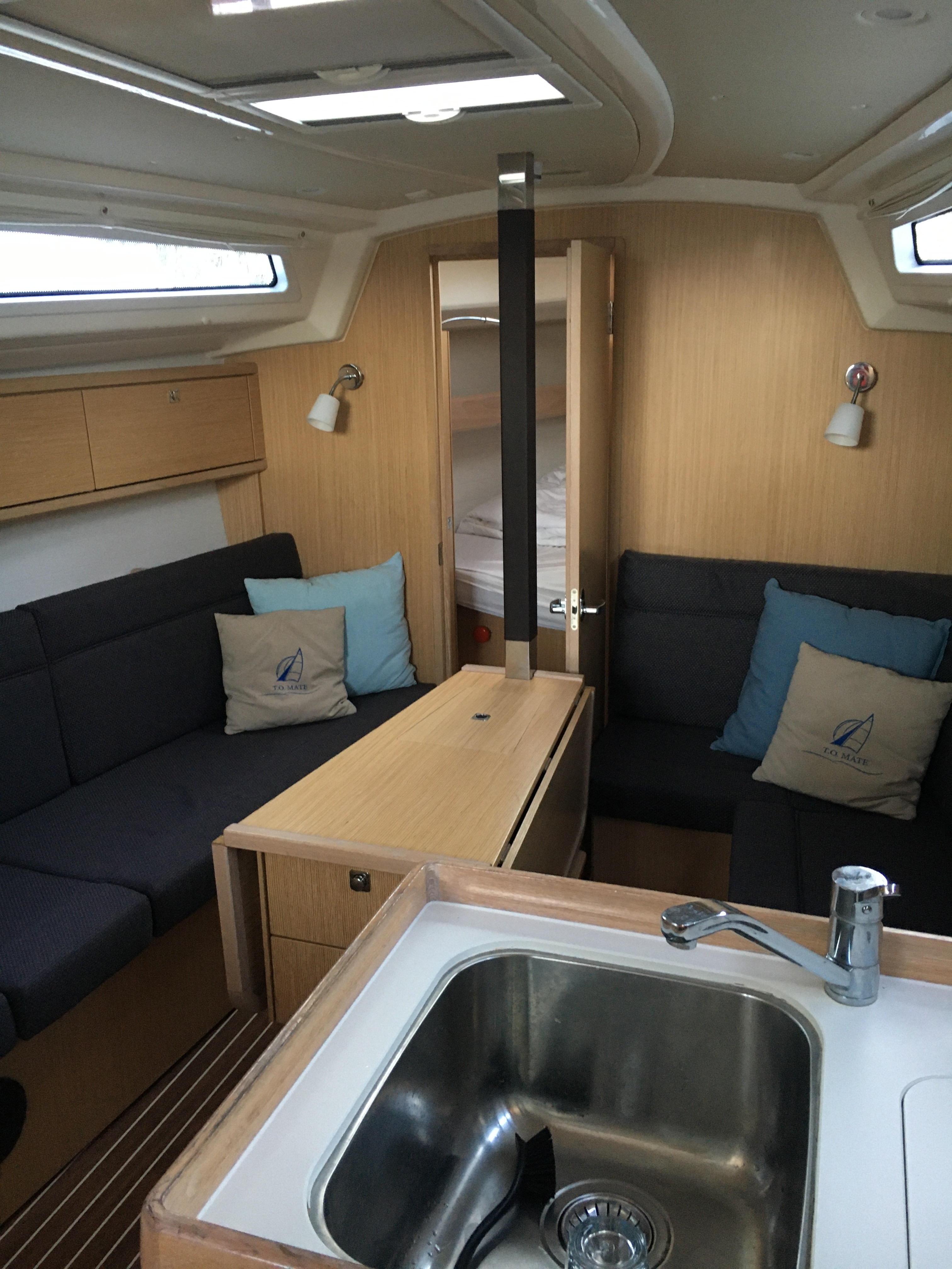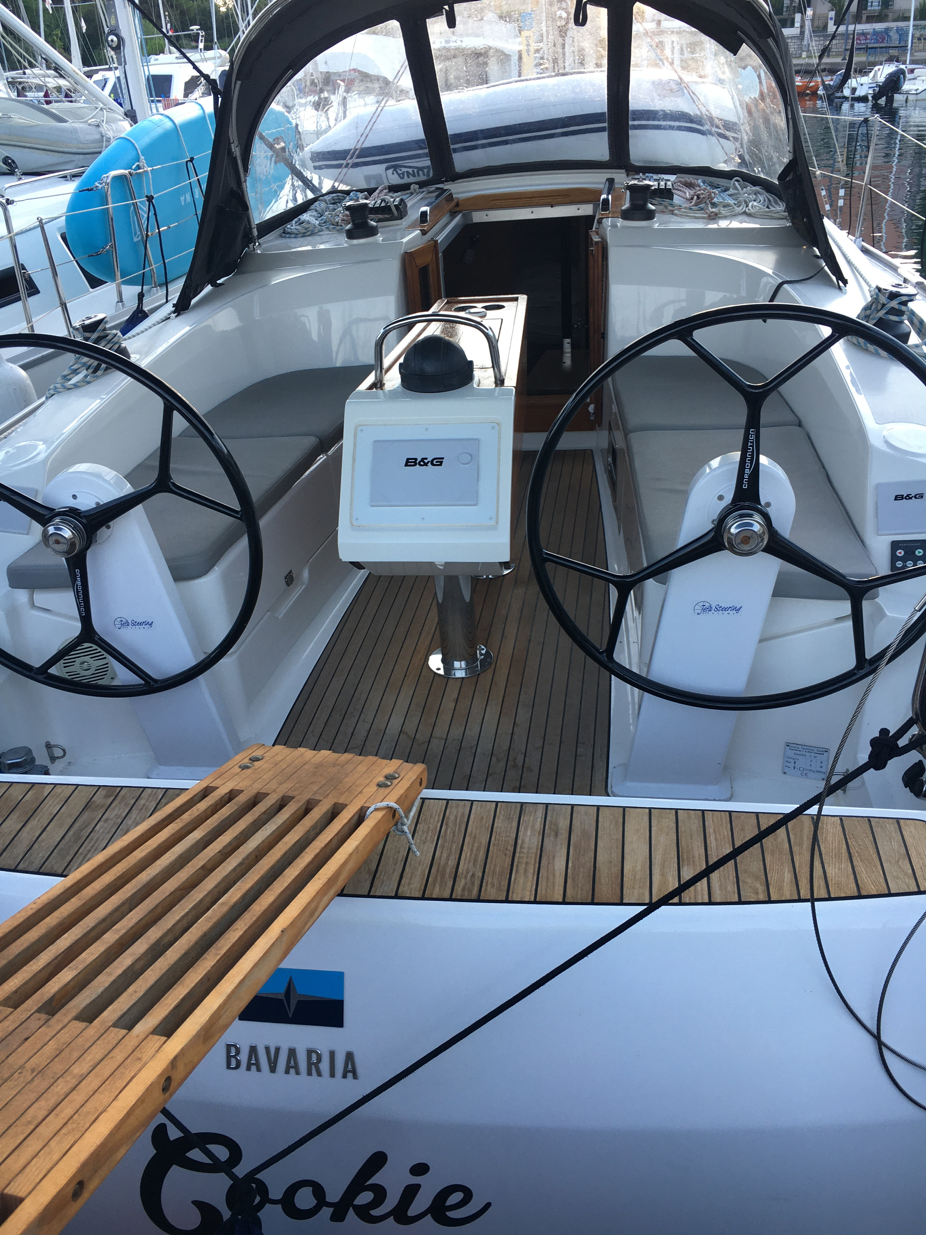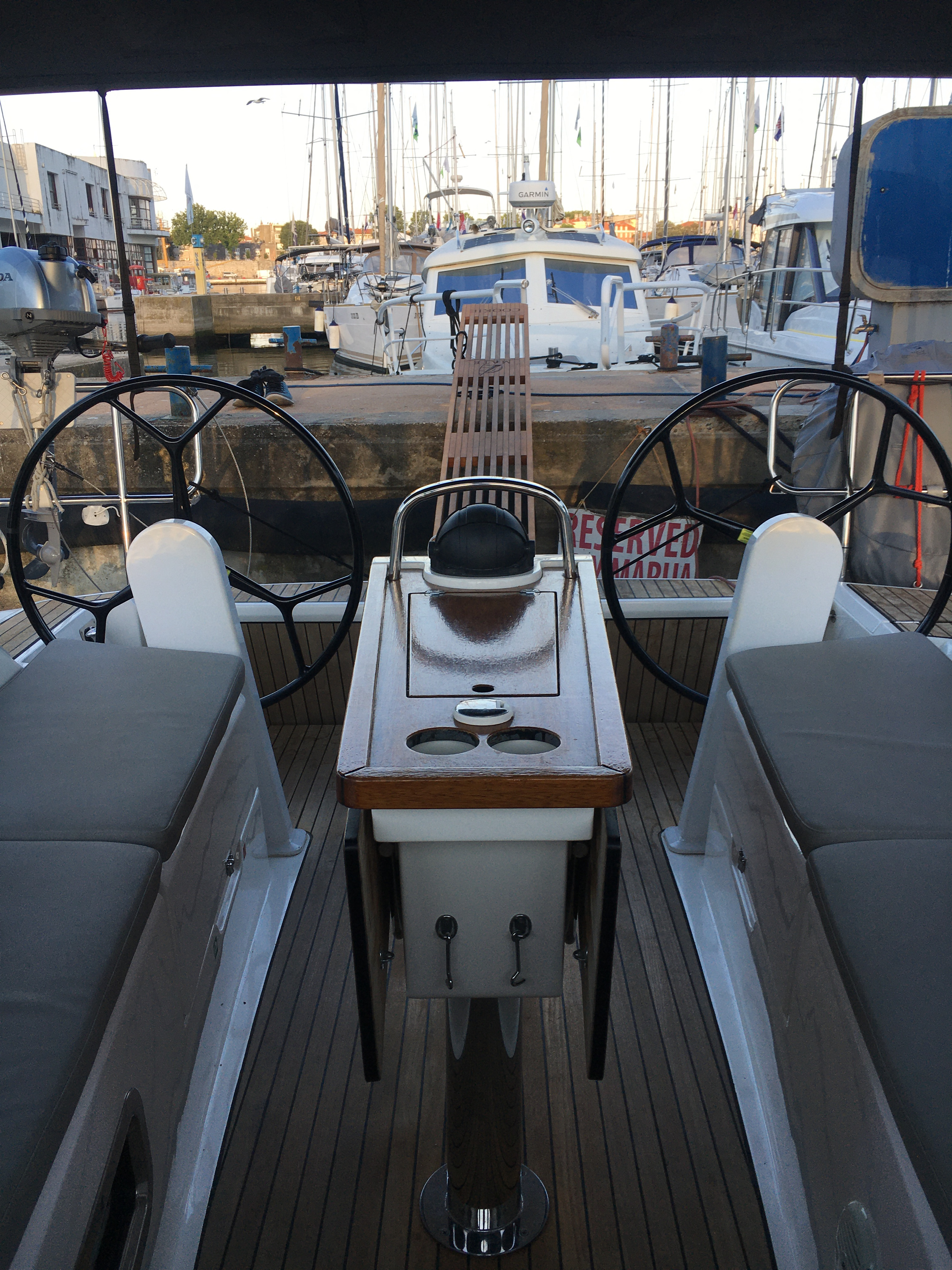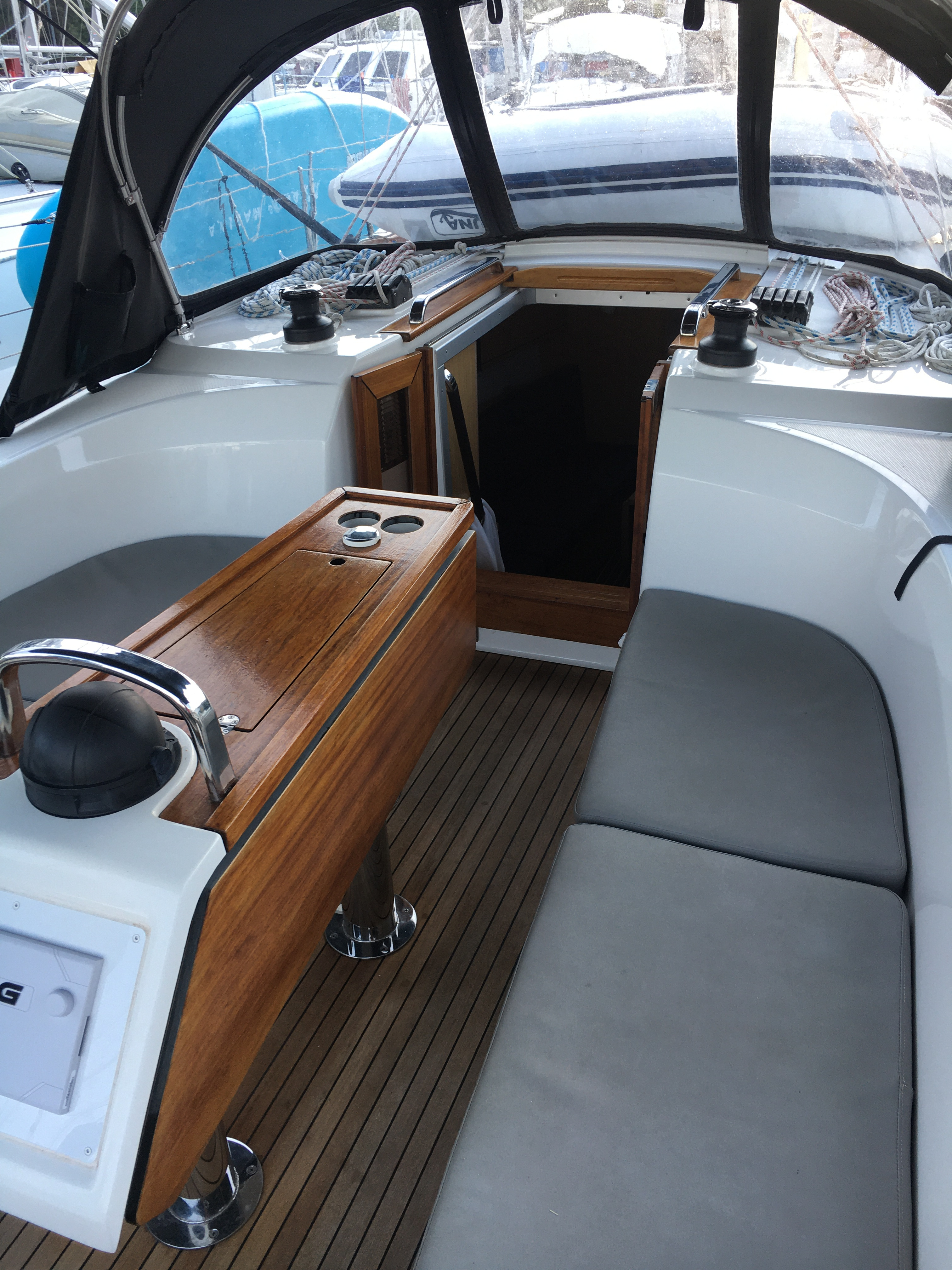 | Outside | Anker mit Kette, Ankerwinsch, Badeplattform, Biminitop, Bootshaken, Cockpitdusche, Cockpitpolster, Cockpittisch, Dieselkanister , elektr. Ankerwinsch, Fender, Jambo Anker, Solaranlage, Sprayhood, Teak im Cockpit, Wasserkanister |