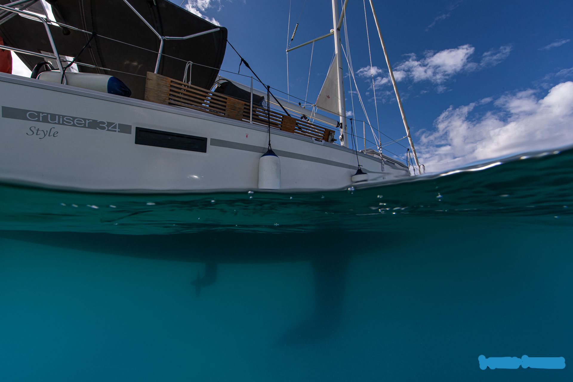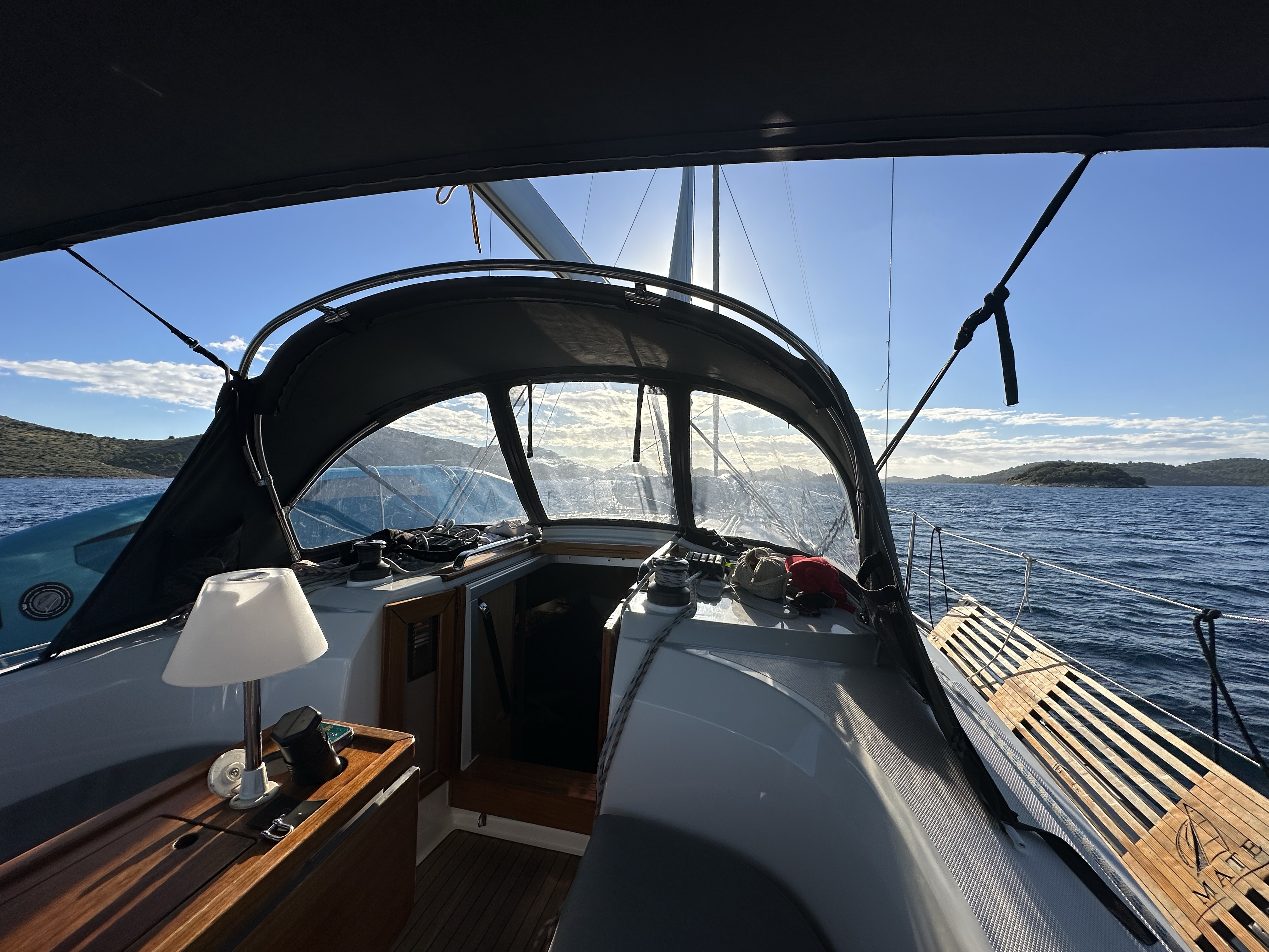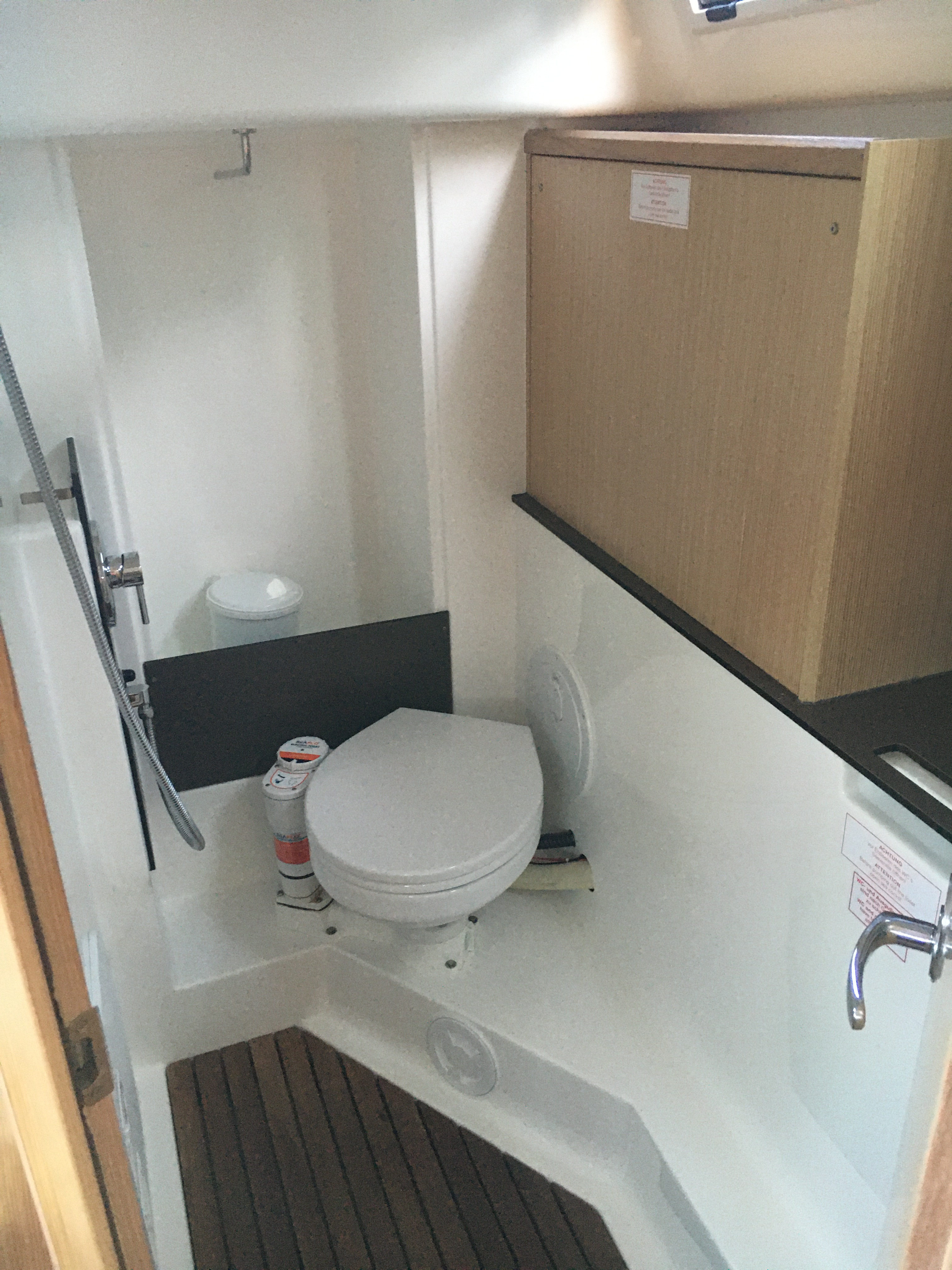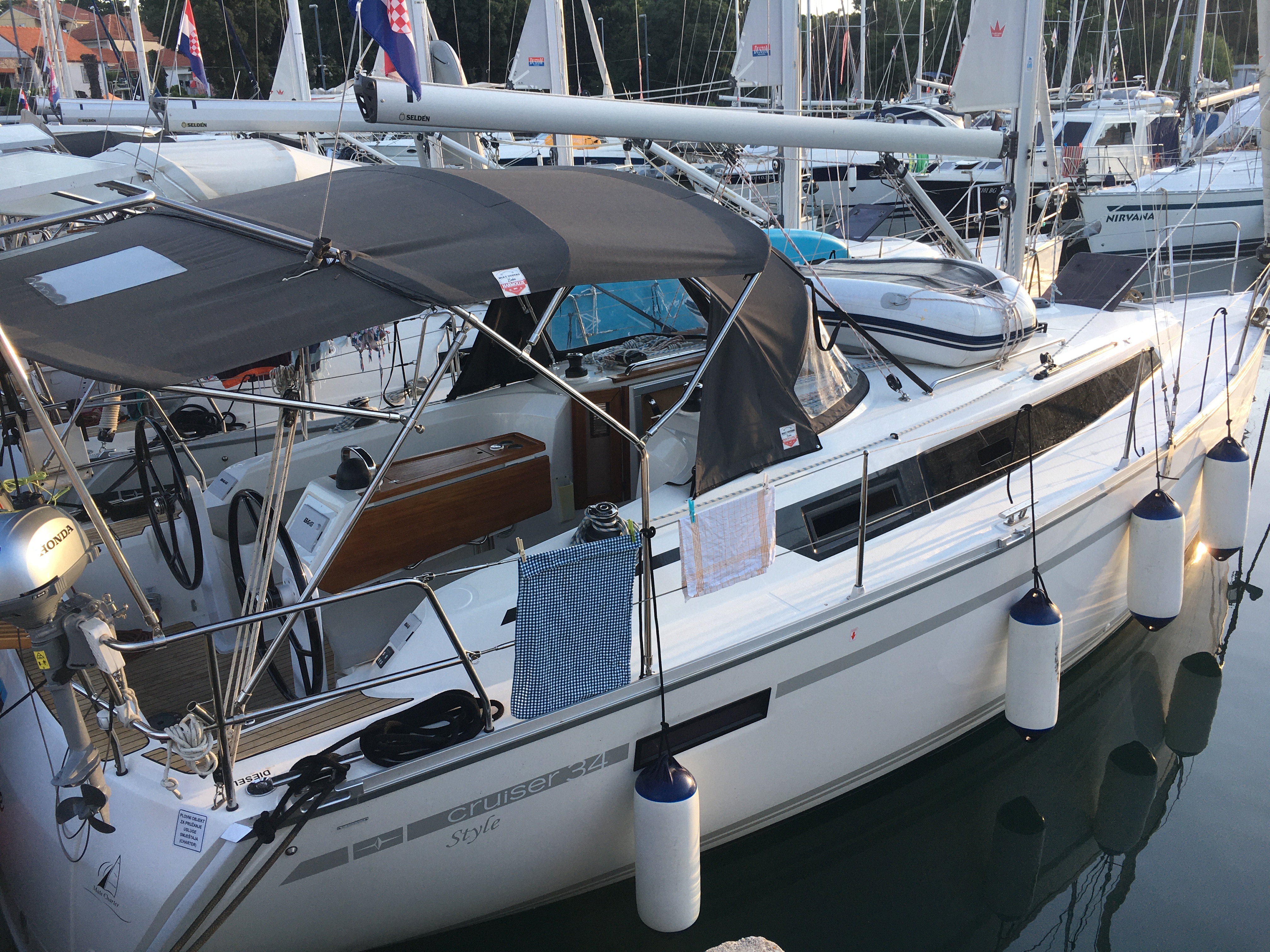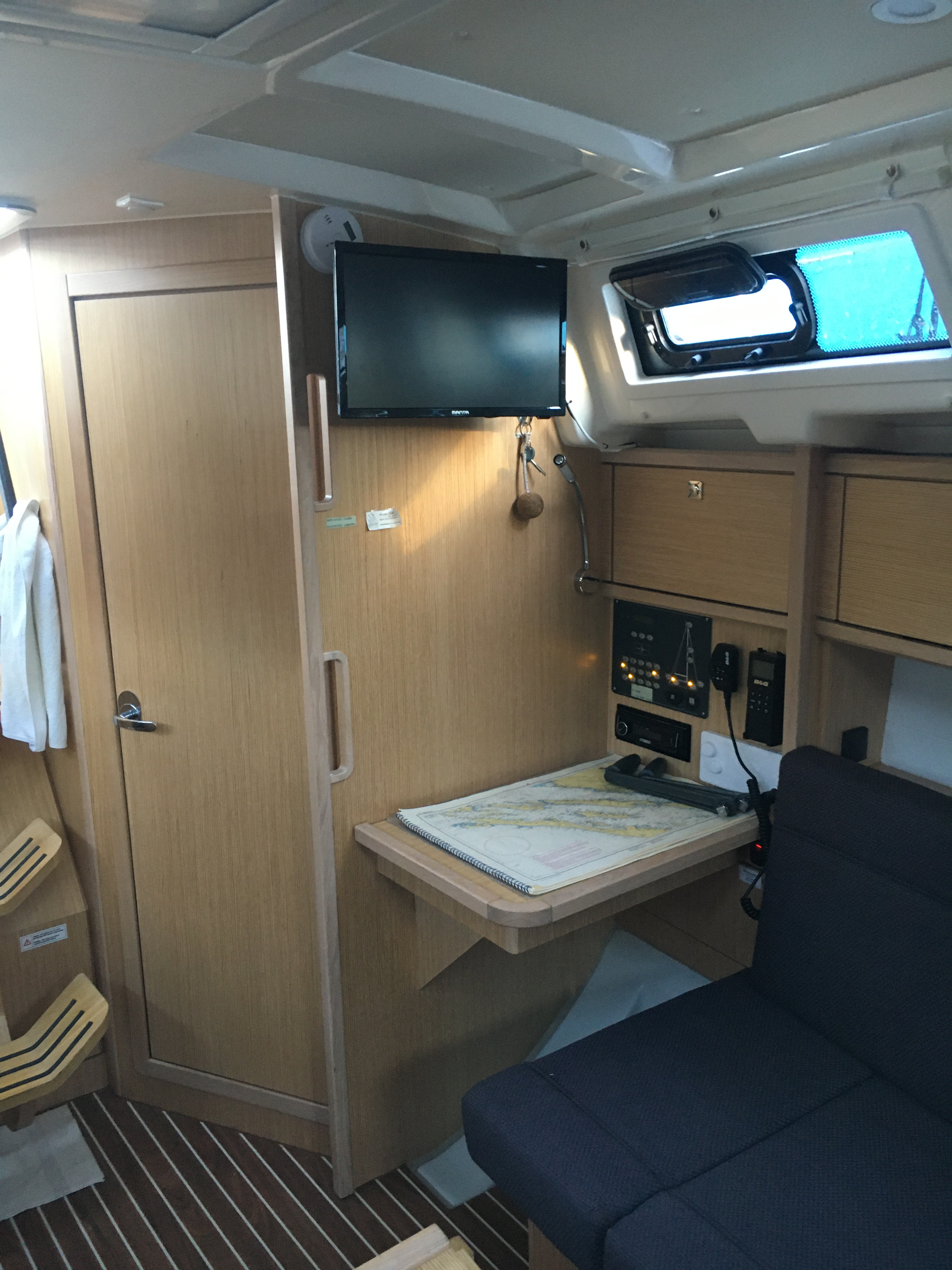 | Outside | Anker mit Kette, Ankerwinsch, Badeplattform, Biminitop, Bootshaken, Cockpitdusche, Cockpitpolster, Cockpittisch, Dieselkanister , elektr. Ankerwinsch, Fender, Jambo Anker, Solaranlage, Sprayhood, Teak im Cockpit, Wasserkanister |