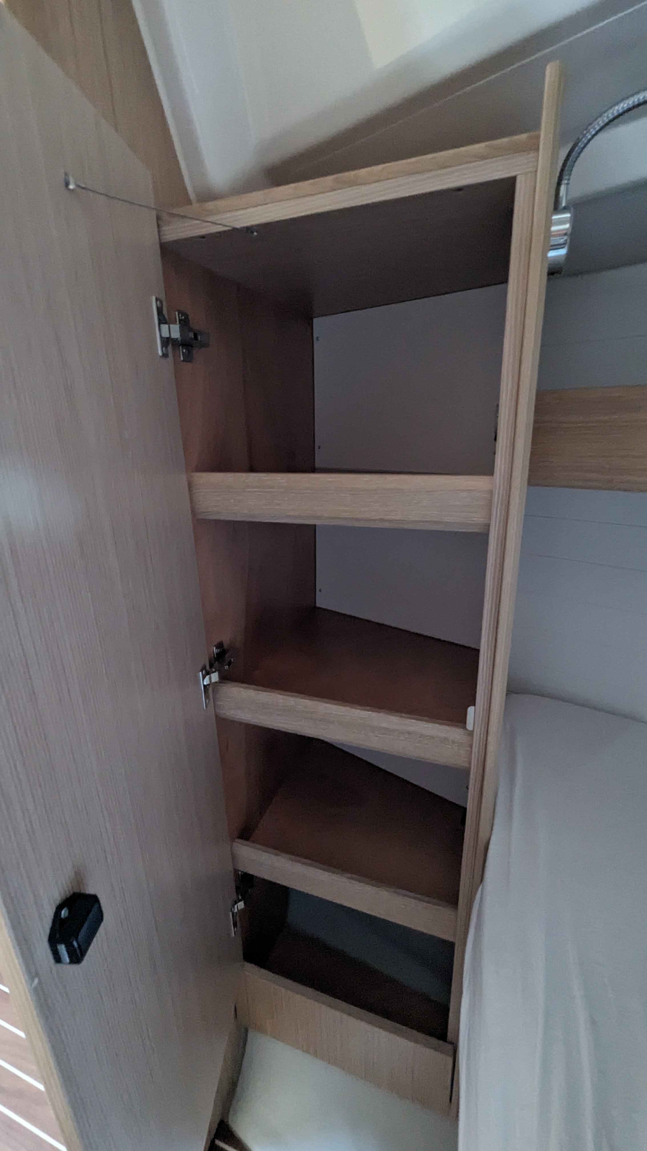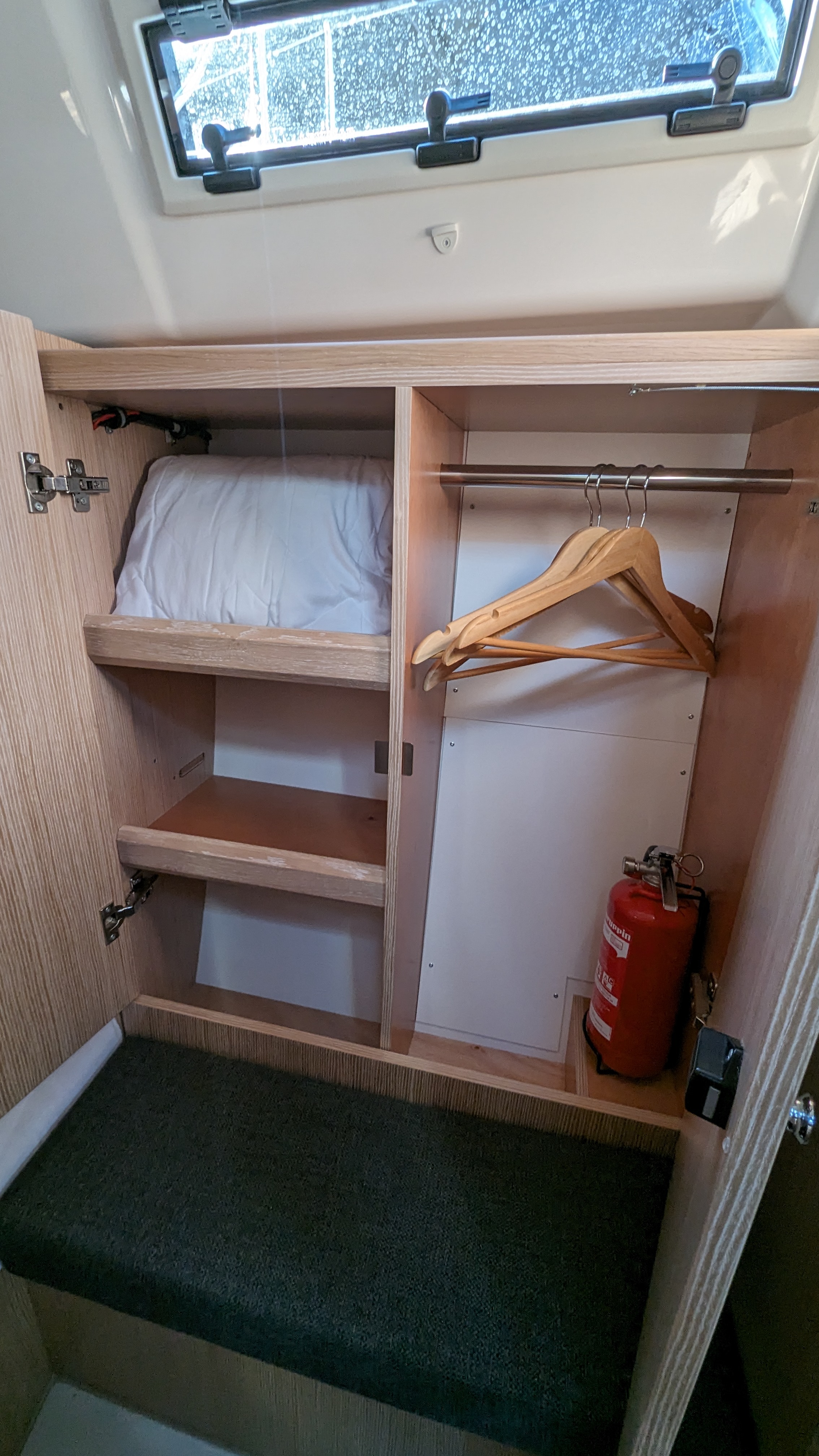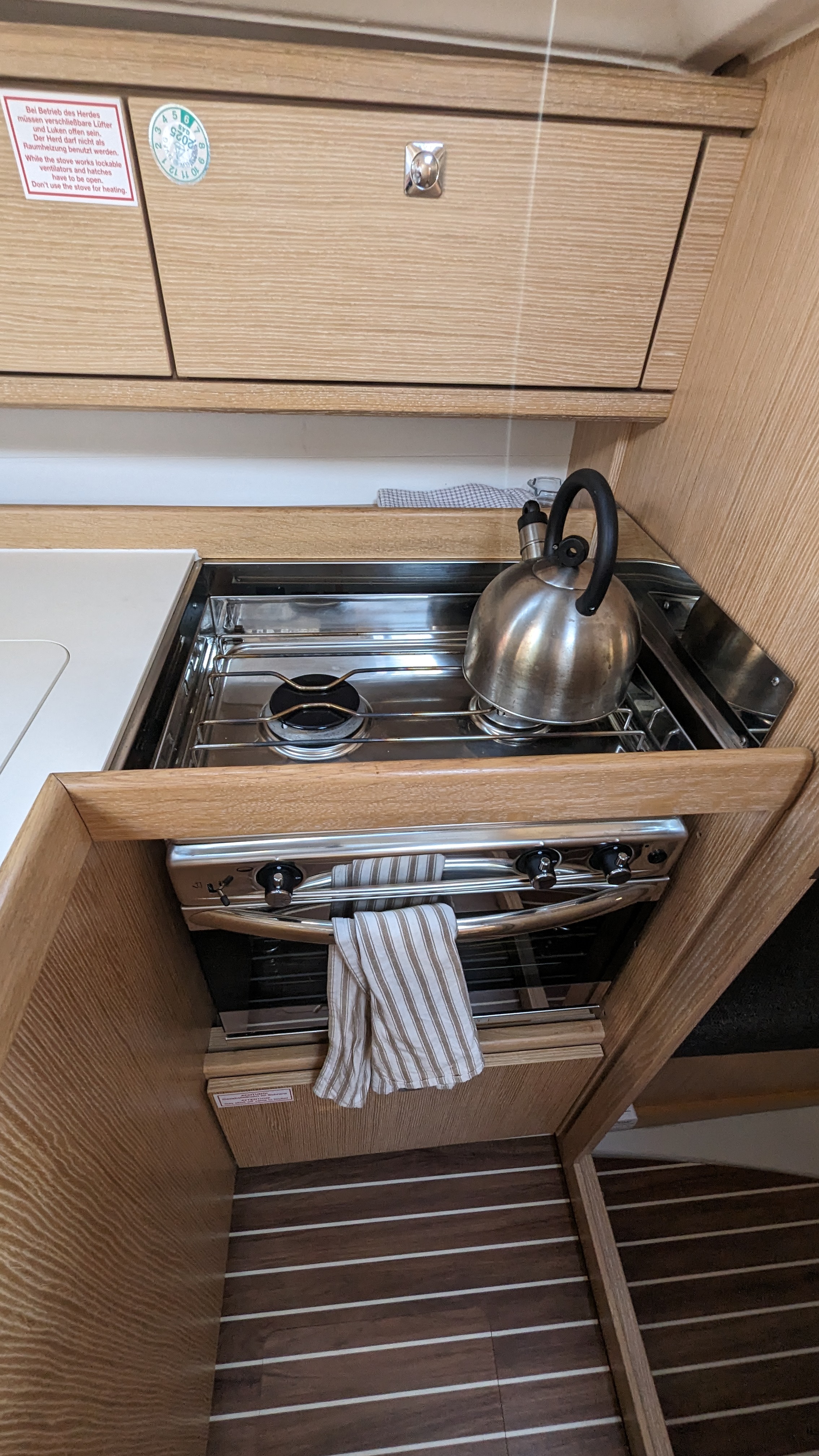 | Inside | Backofen, Borduhr, Fäkalientank, Gasherd, Inverter 12V/220V, Kleiderbügel, Klobürste, Kühlschrank, Ladegerät, Luftpumpe für Beiboot, Pantryausstattung, Radio mit CD, Trichter, Wasserkocher |