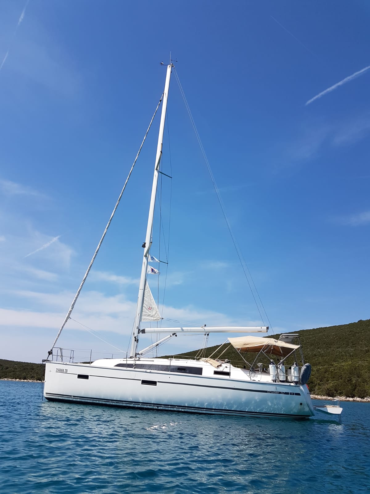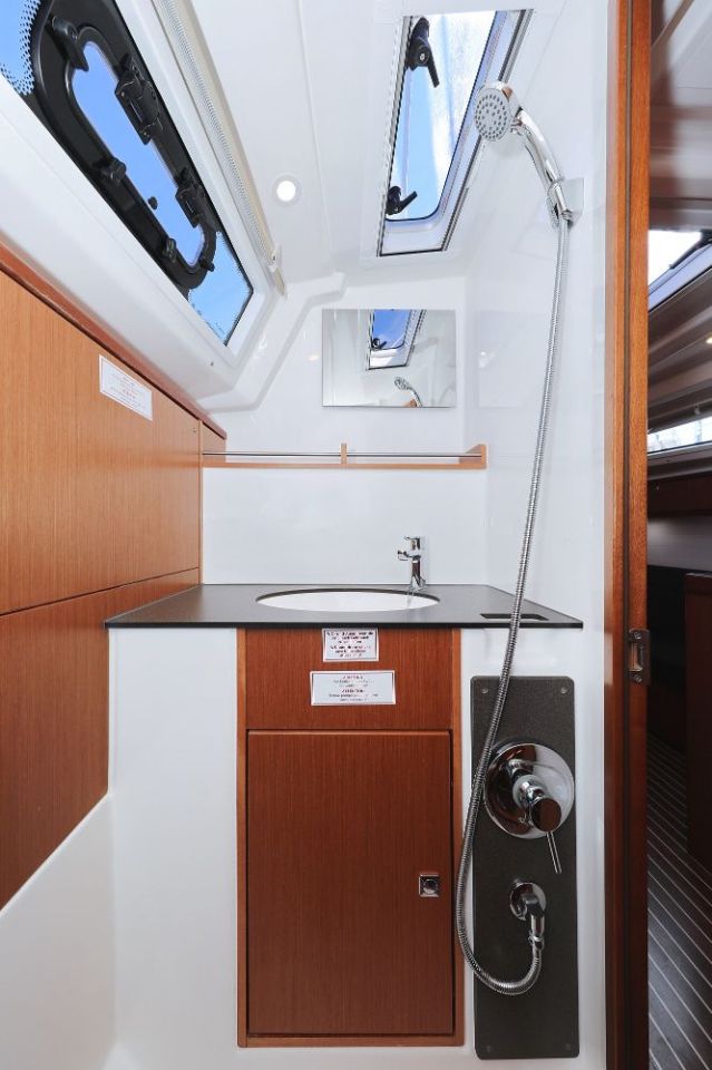 | Outside | 220 V-Landanschluss, Anker mit Kette, Anker mit Kette und Seil, Ankerwinsch, Badeplattform, Biminitop, Bootshaken, Cockpitdusche, Cockpitleuchte, Dieselkanister , elektr. Ankerwinsch, Fender, Festmacherleinen, Solaranlage, Sprayhood, Teak im Cockpit, Vorhängeschloss, Wasserschlauch, Windex |