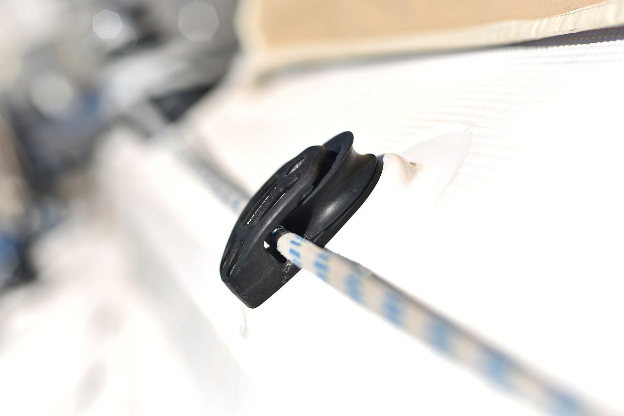 Bei einer plötzlichen Zunahme der Windstärke wollten wir die Segel einholen. Dabei löste sich eine Schraube an der Umlenkrolle der Rückholleine für das Focksegel. Diese war offensichtlich nicht fest angezogen. Bei Böen bis 35 Kt mussten wir also eine kleine Reparatur vornehmen.