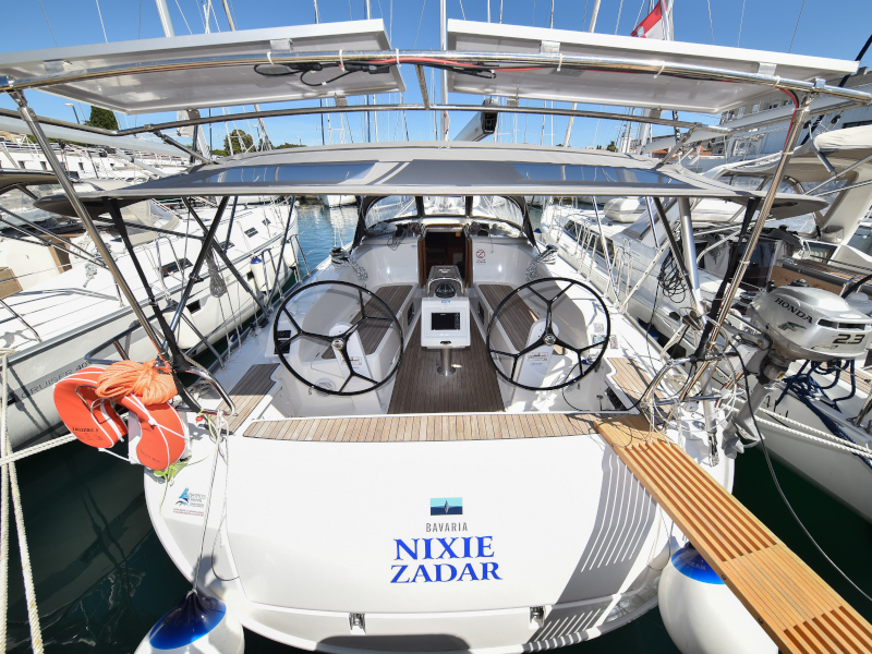 | Outside | 220 V-Landanschluss, Anker mit Kette, Anker mit Kette und Seil, Ankerwinsch, Badeplattform, Biminitop, Bootshaken, Cockpitdusche, Cockpitleuchte, Dieselkanister , elektr. Ankerwinsch, Fender, Festmacherleinen, Solaranlage, Sprayhood, Teak im Cockpit, Vorhängeschloss, Wasserschlauch, Windex |