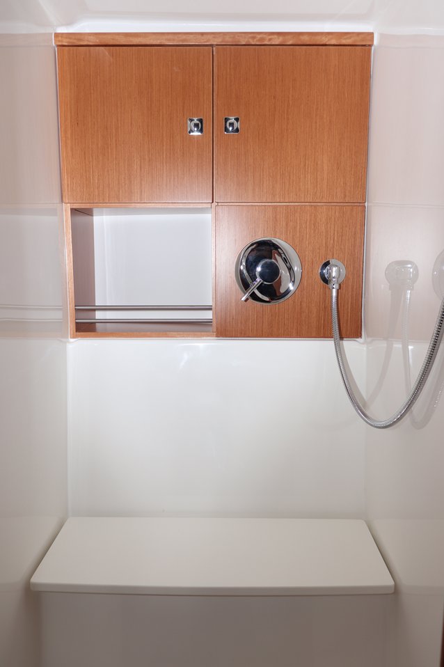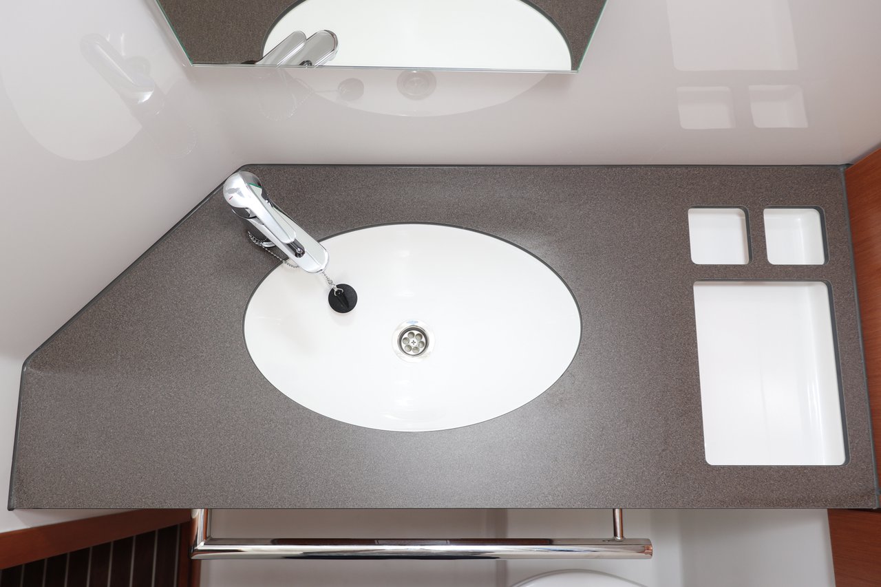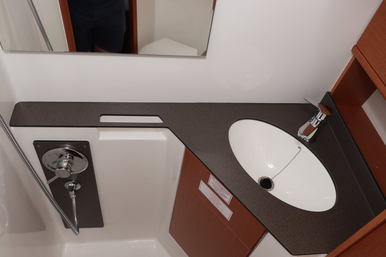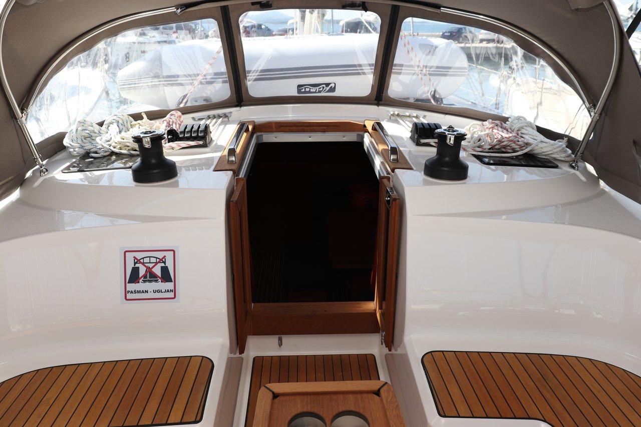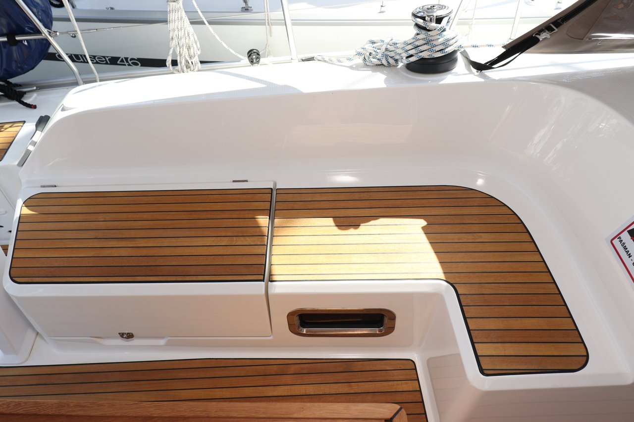 | Outside | 220 V-Landanschluss, Anker mit Kette, Badeplattform, Biminitop, Cockpitdusche, Cockpitlautsprecher, Cockpitpolster, Cockpittisch (klappbar), elektr. Ankerwinsch, Fender, Festmacherleinen, Seereling, Solaranlage, Sprayhood, Teak im Cockpit, Treibanker, Windex |