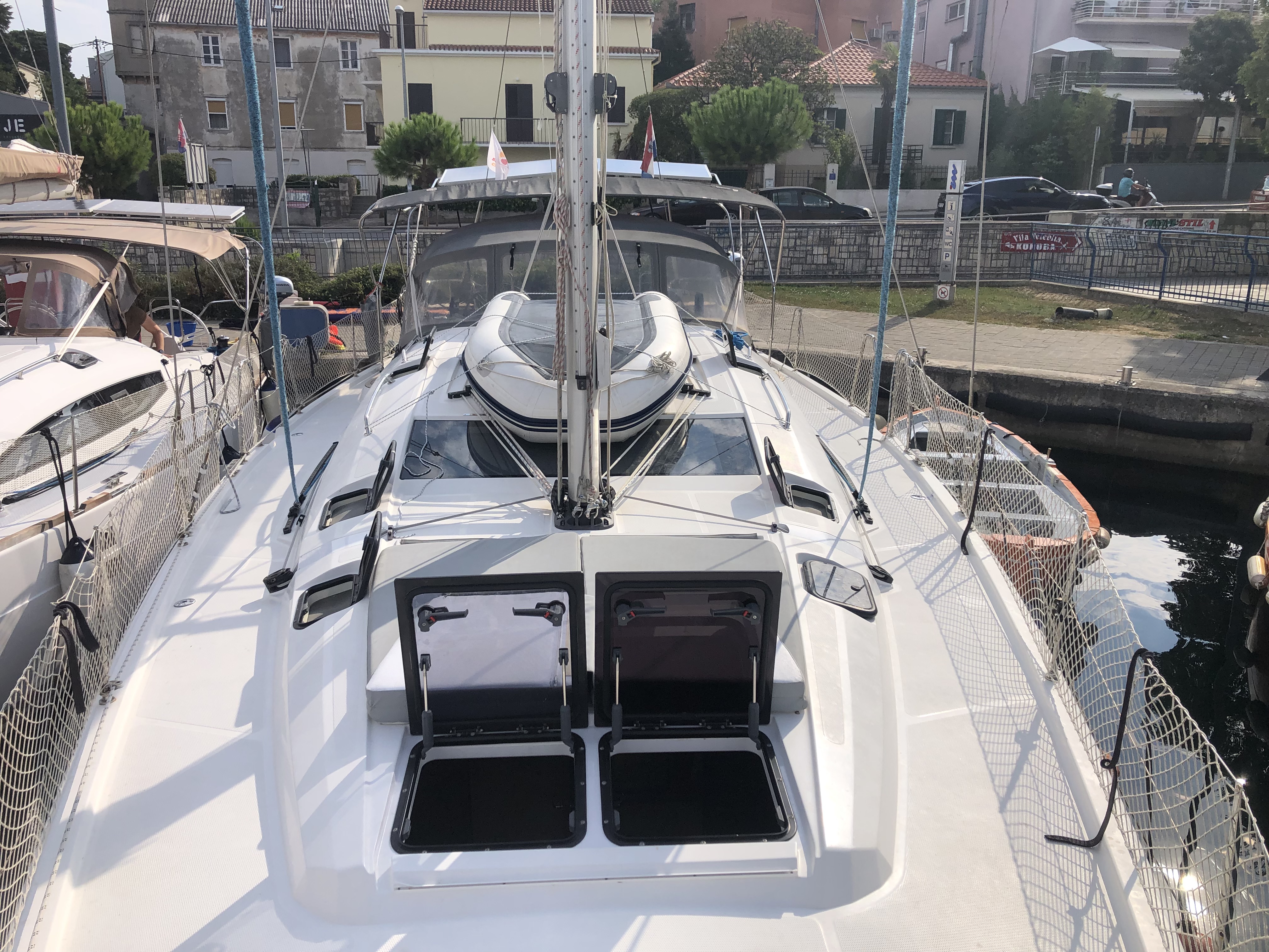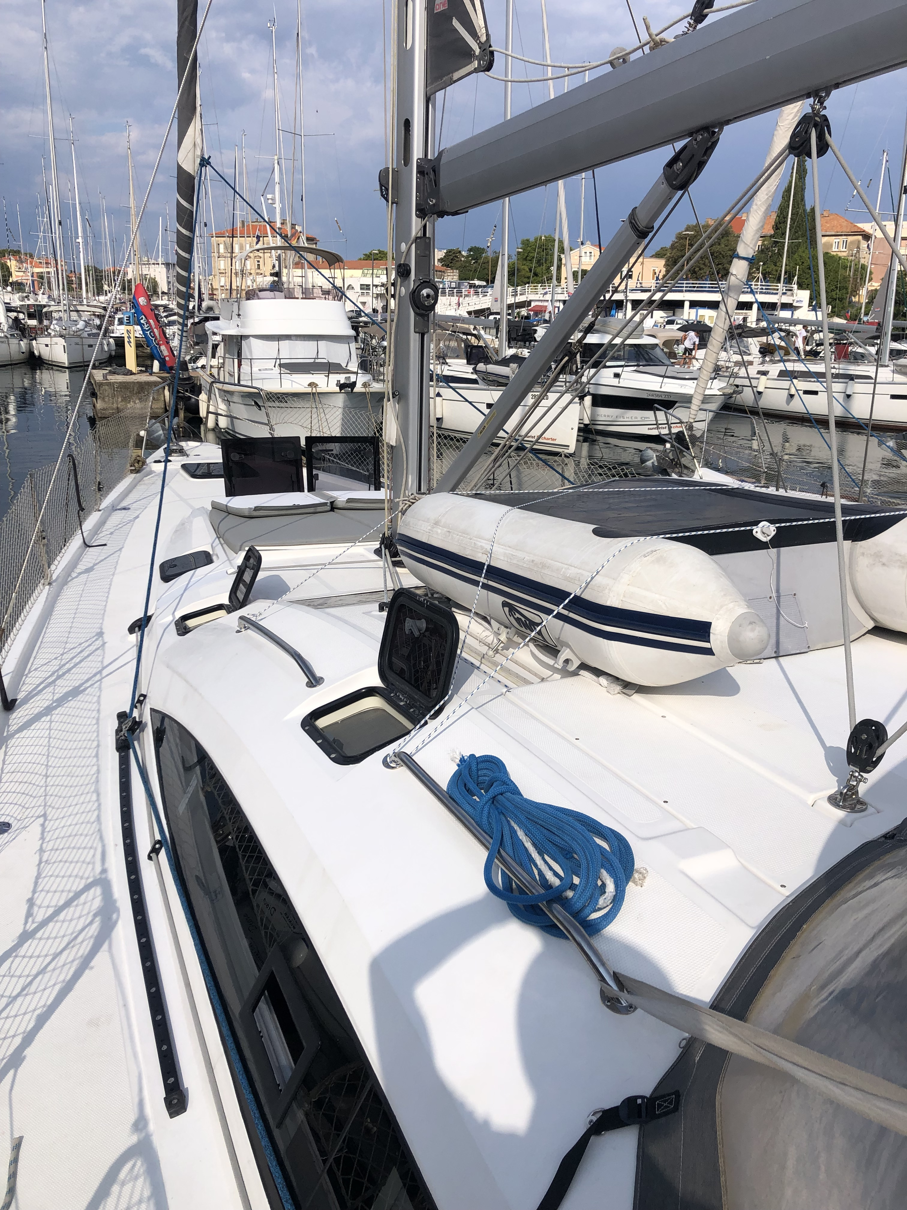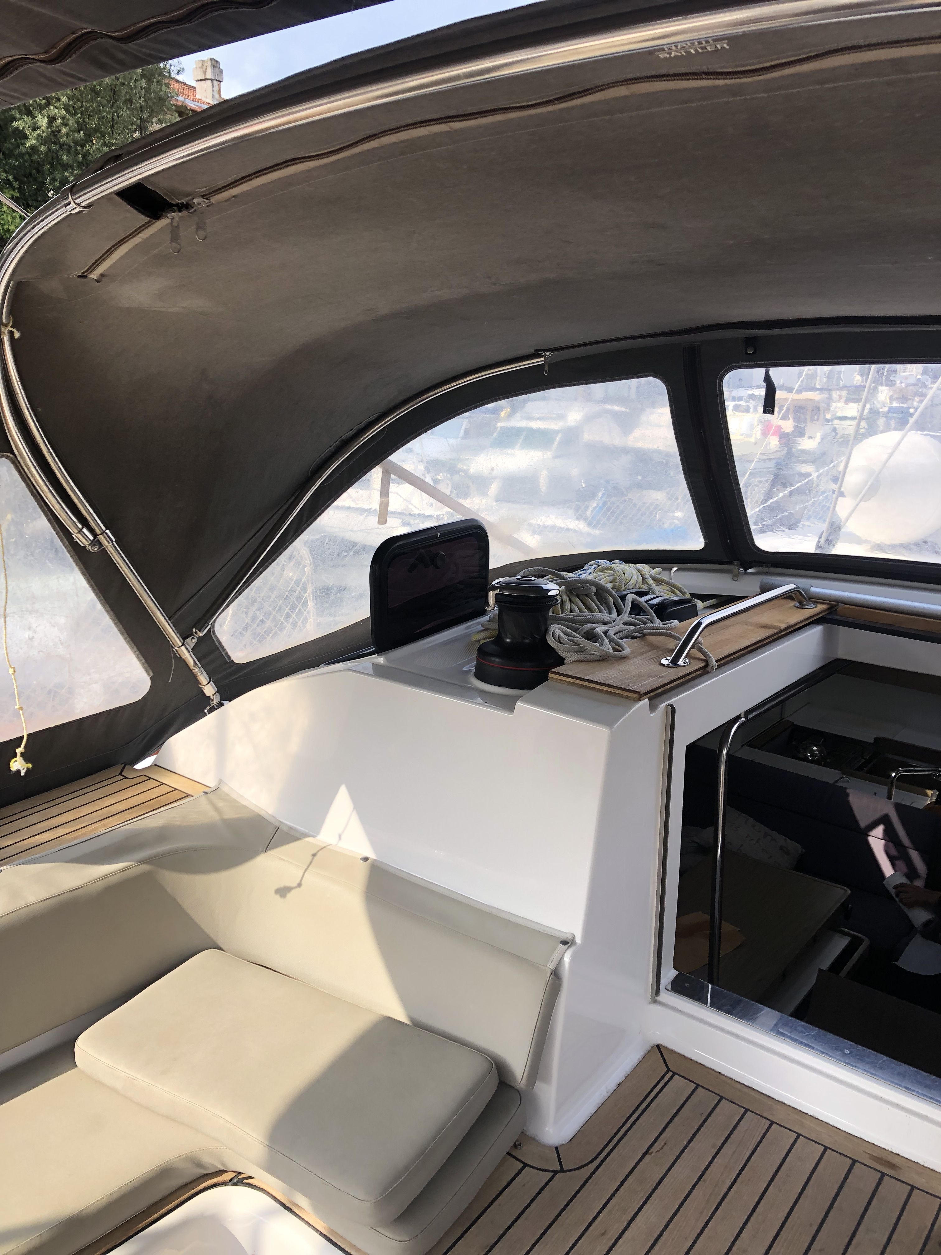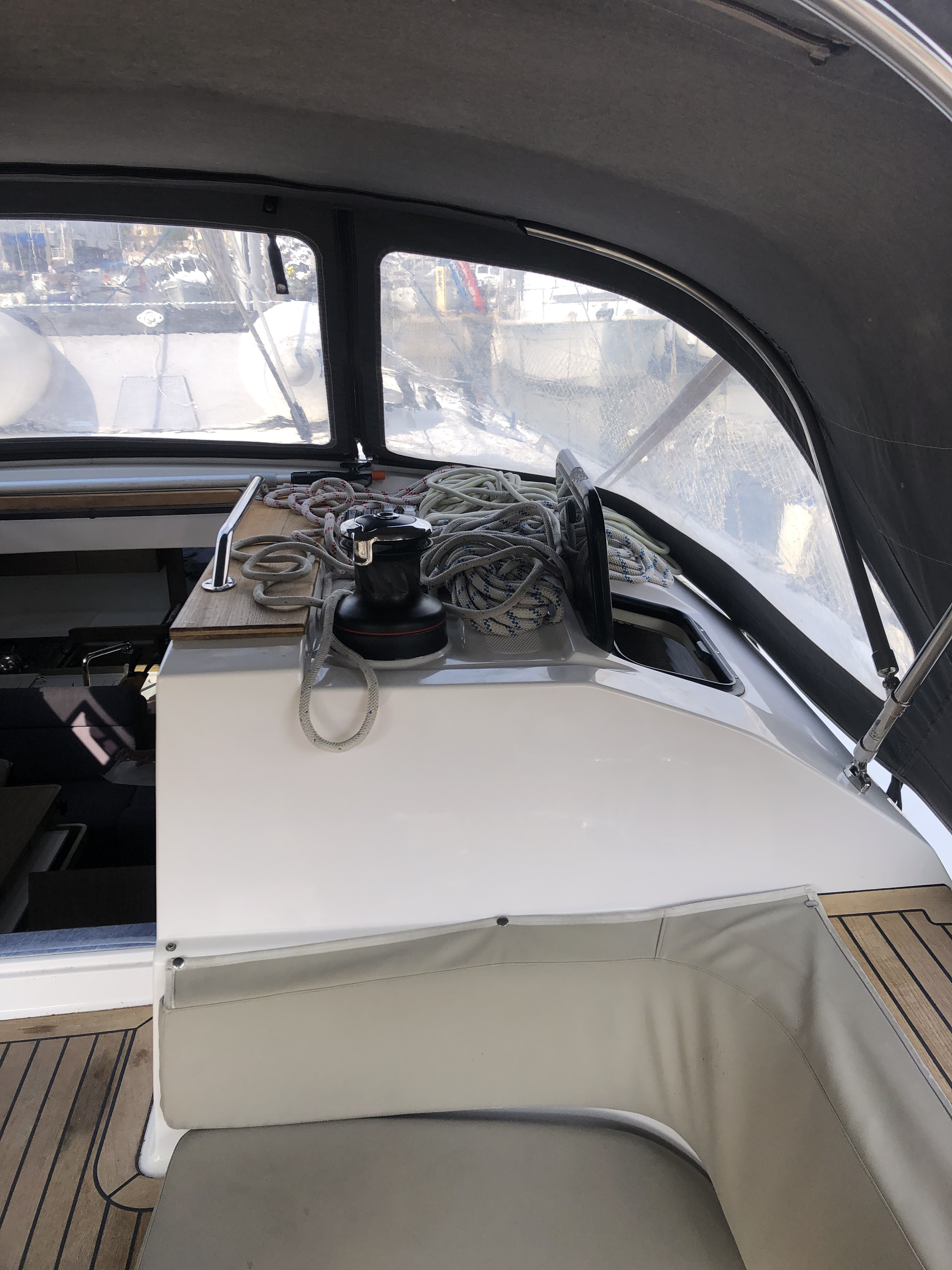 | Outside | Anker mit Seil, Badeleiter, Biminitop, Bootshaken, Cockpitdusche, Cockpitlautsprecher, Cockpittisch, elektr. Ankerwinsch, Faltpropeller, Fender, Festmacherleinen, Gangway, Solaranlage, Sprayhood, Wasserschlauch, Windex |