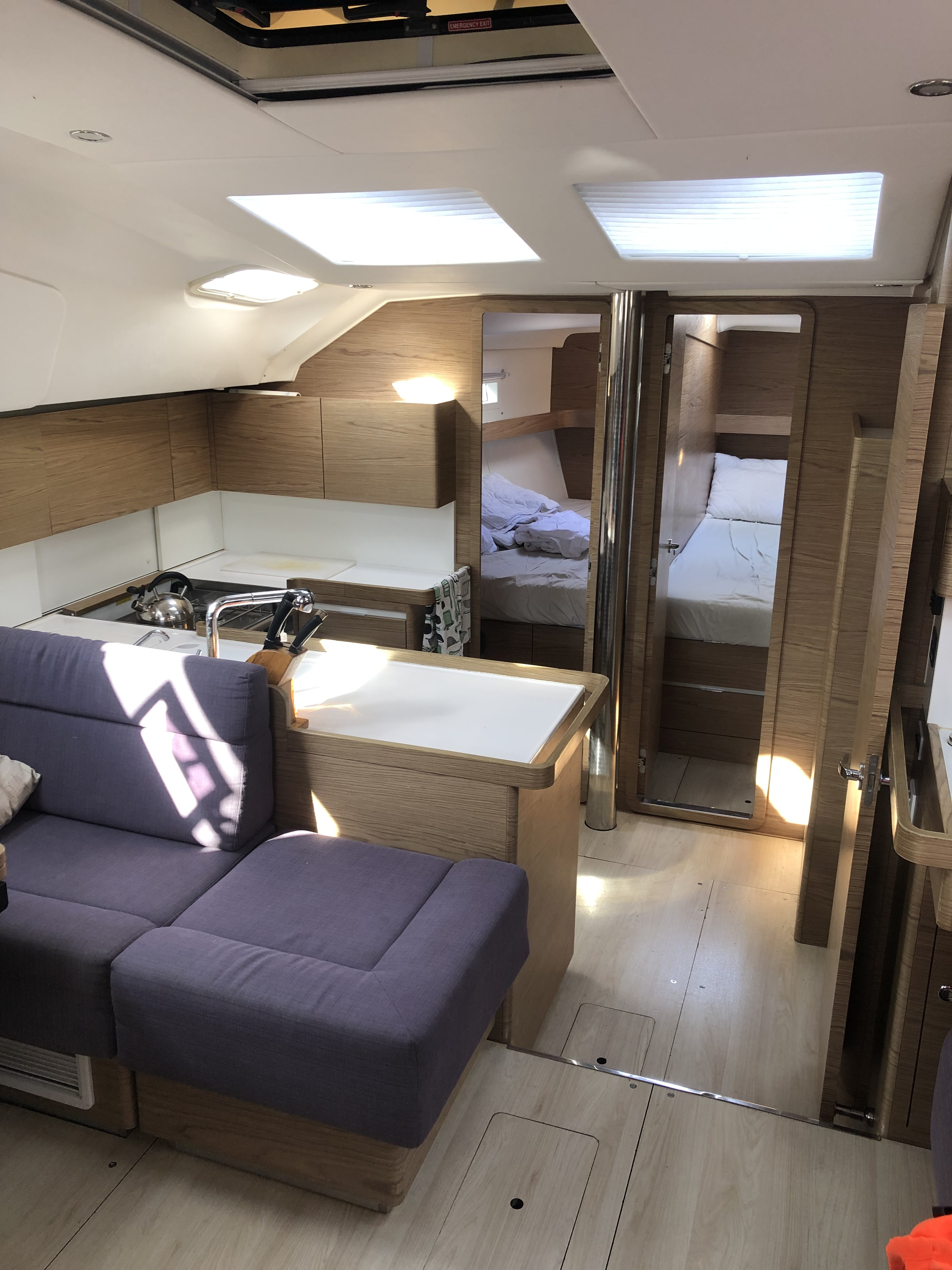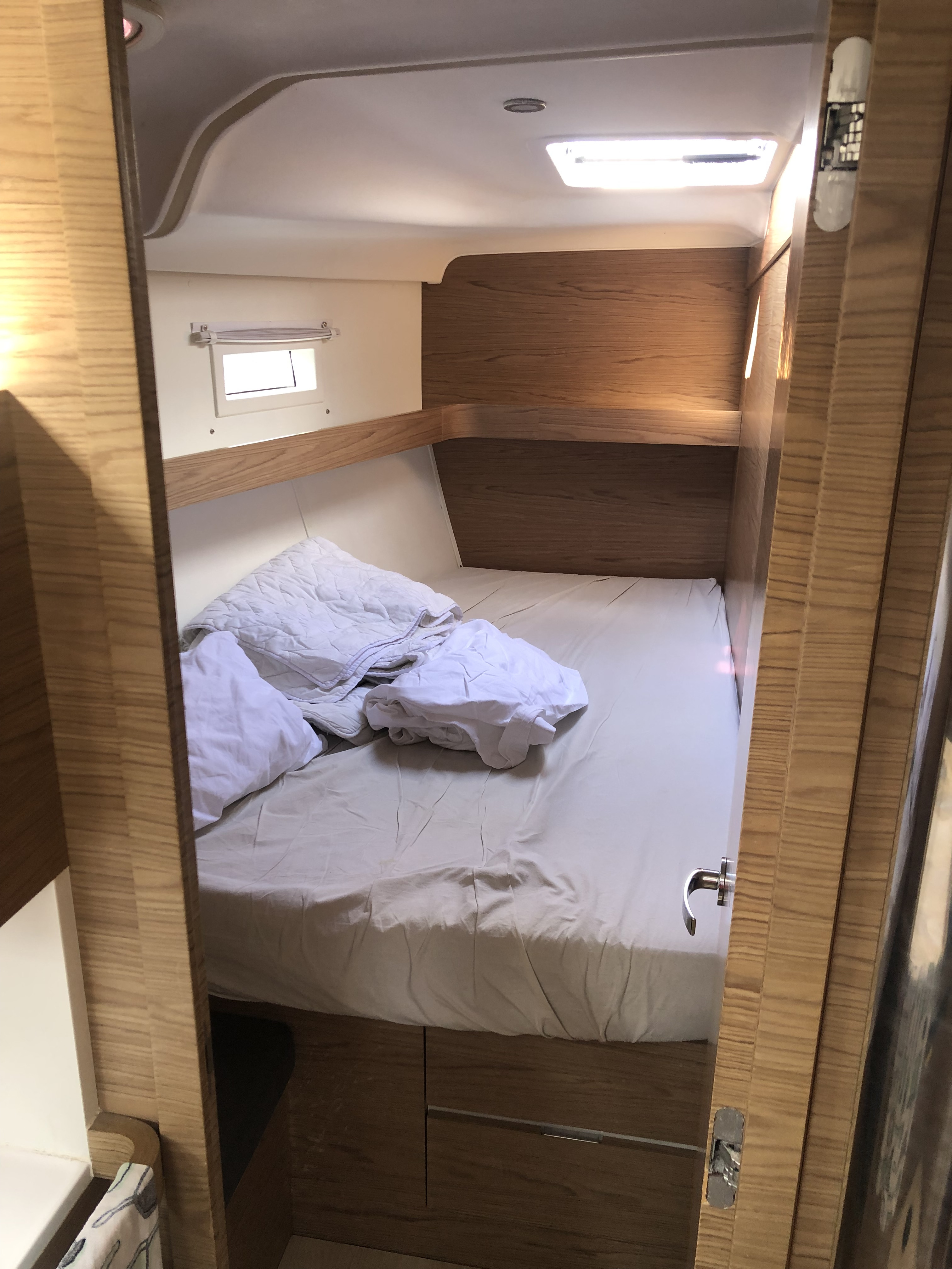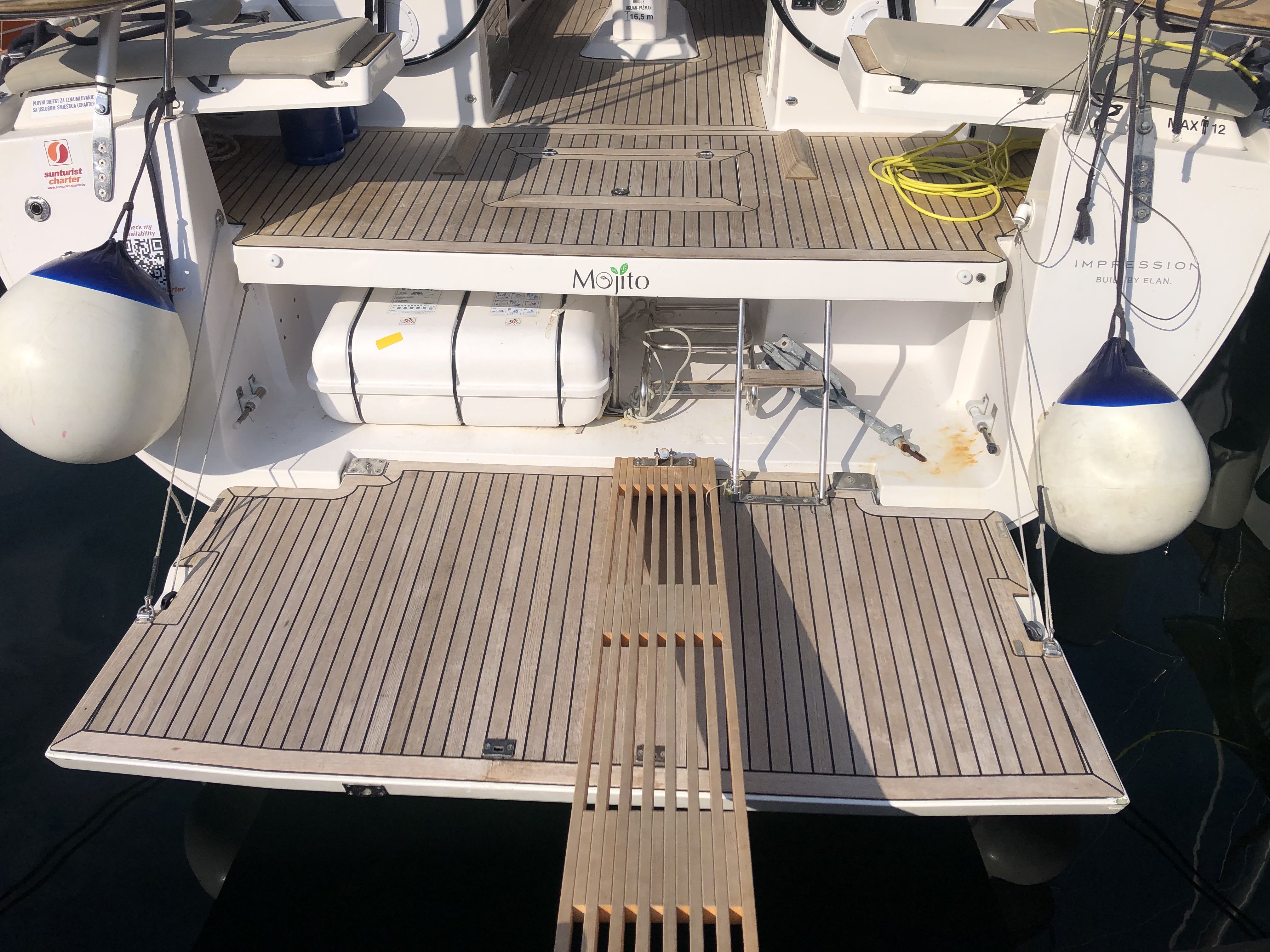 | Outside | Anker mit Seil, Badeleiter, Biminitop, Bootshaken, Cockpitdusche, Cockpitlautsprecher, Cockpittisch, elektr. Ankerwinsch, Faltpropeller, Fender, Festmacherleinen, Gangway, Solaranlage, Sprayhood, Wasserschlauch, Windex |