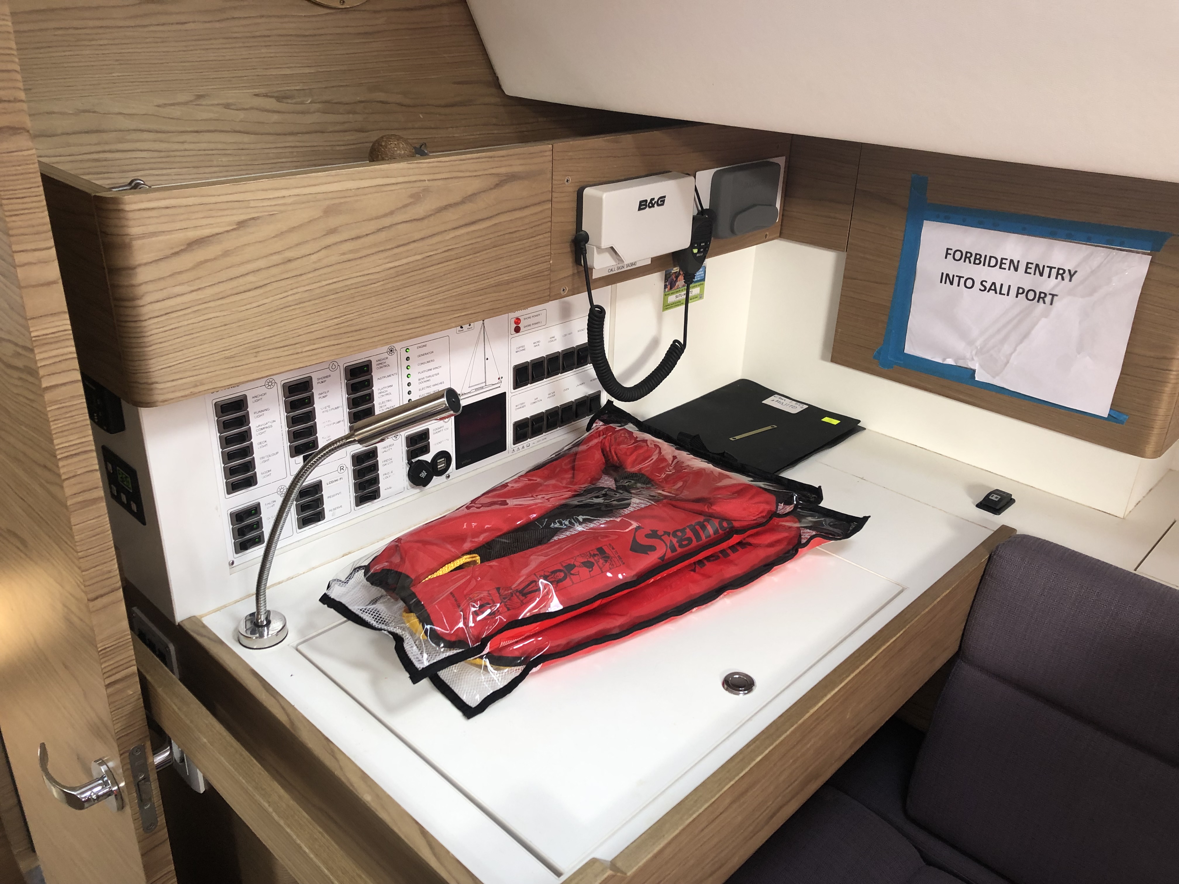 | Safety | Autopilot, Bordapotheke, Bordwerkzeug, Bugstrahlruder, elektr. Bilgepumpe, Feststoffschwimmwesten, Feuerlöscher, Leuchtboje, Lifebelts, Motor-Ersatzteile, Navigationslichter, Notsignale, Rettungskragen, Sicherheitsausrüstung, Taschenlampe, UKW-Funk, Zweitanker |