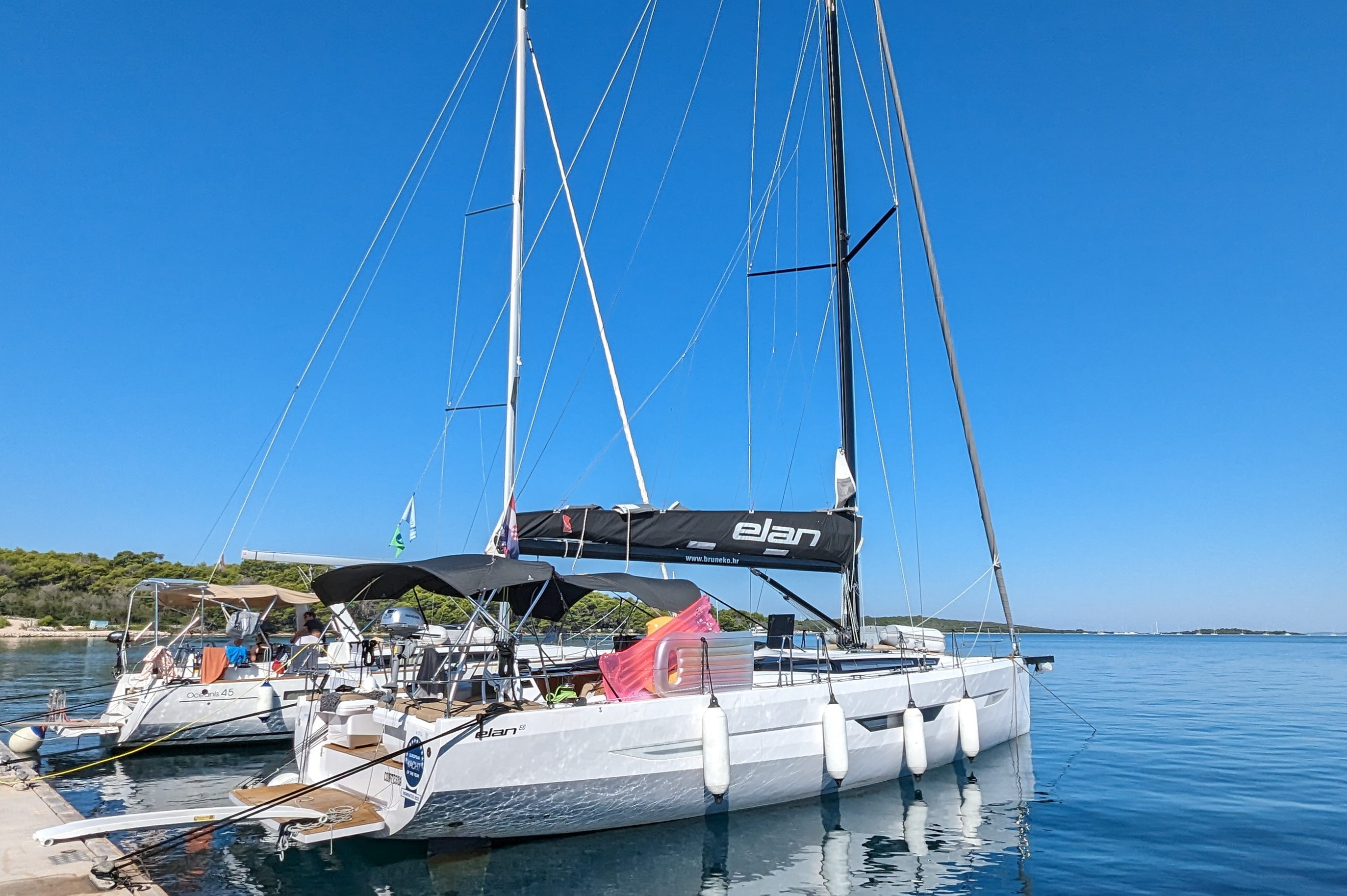 | Outside | 220 V-Landanschluss, Anker mit Kette, Badeleiter, Badeplattform, Biminitop, Cockpitdusche, Cockpitkühlschrank, Cockpitlautsprecher, Cockpitpolster, Cockpittisch, elektr. Ankerwinsch, Fender, Festmacherleinen, Gangway, Sprayhood, Teak im Cockpit, Wasserschlauch, Windex |