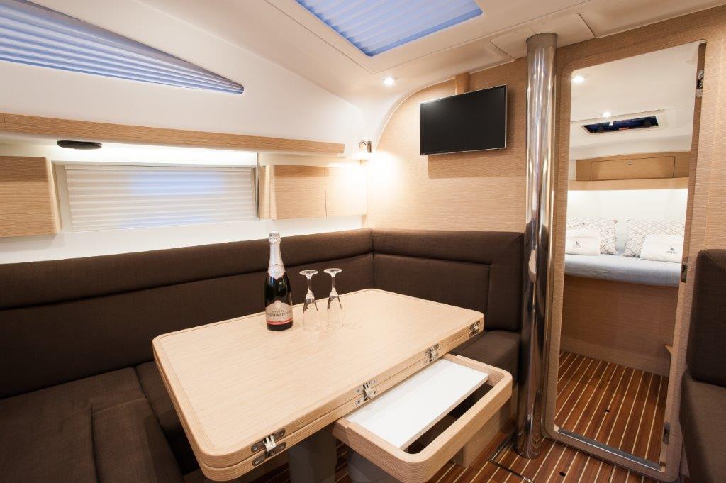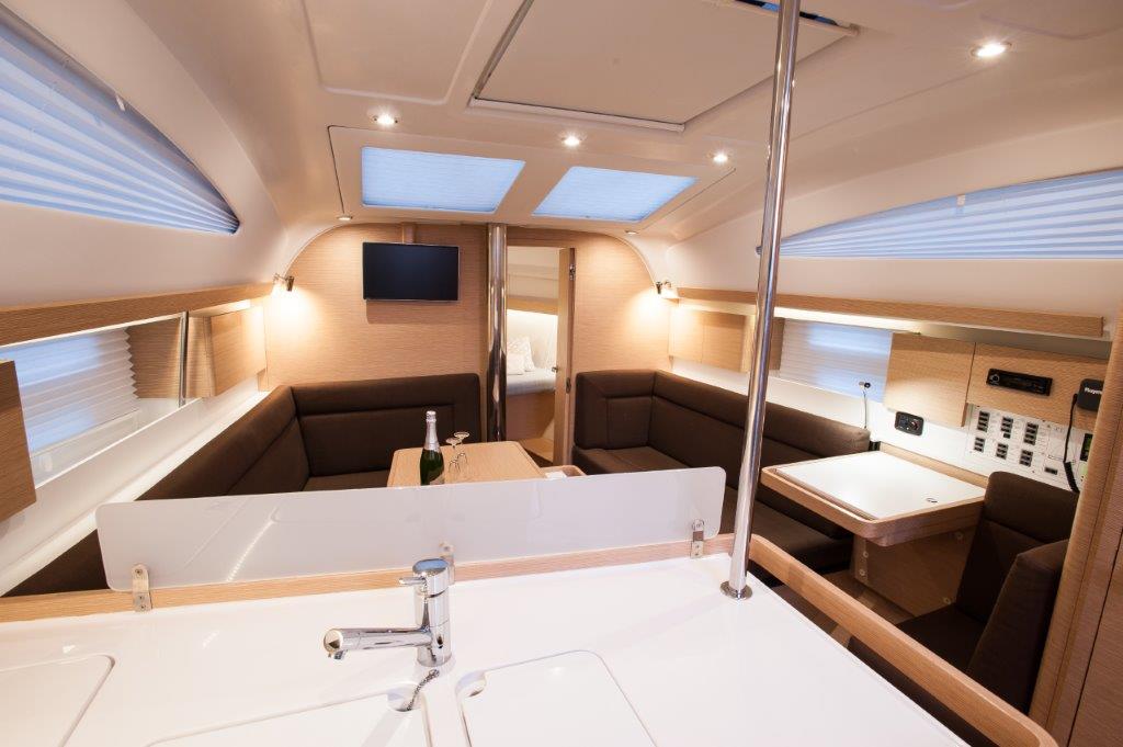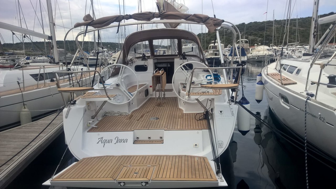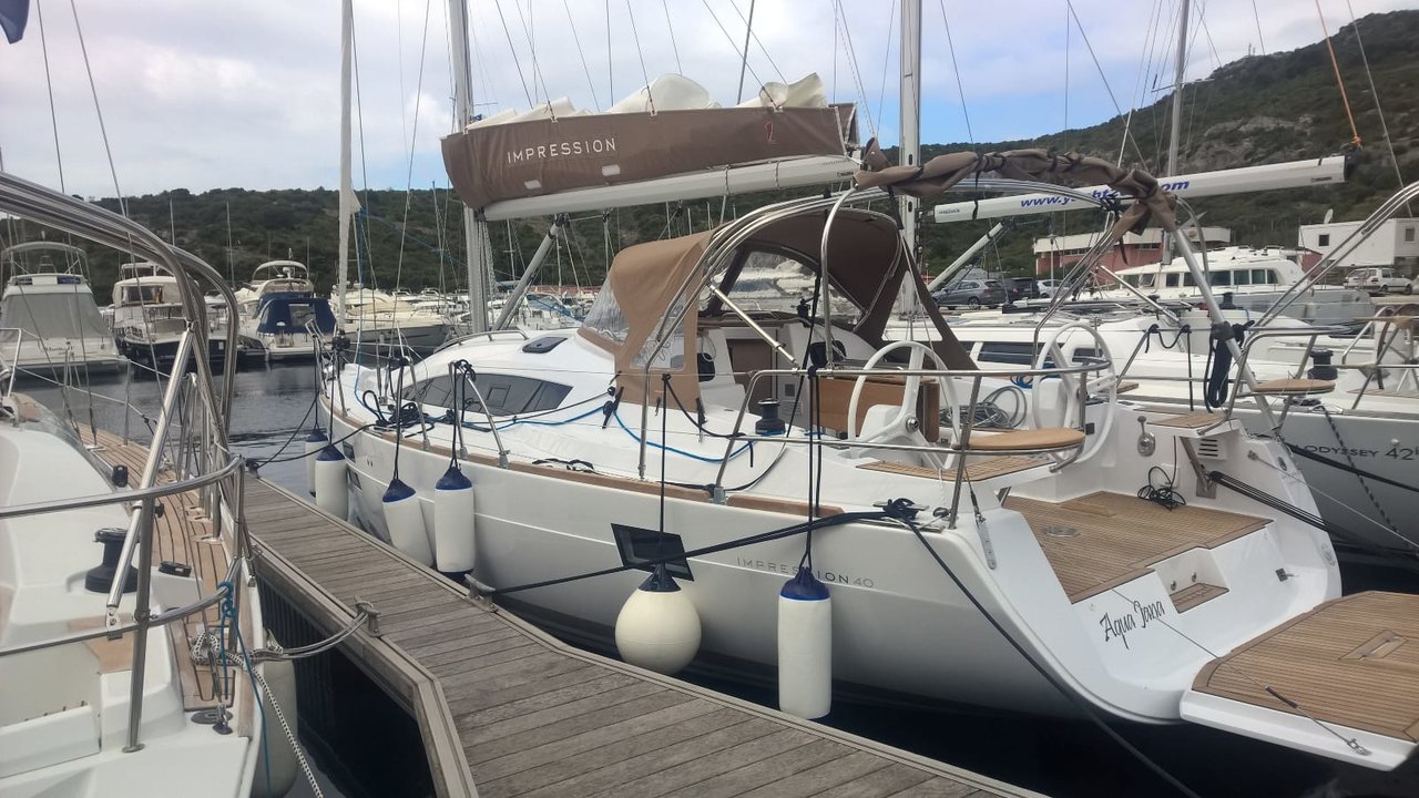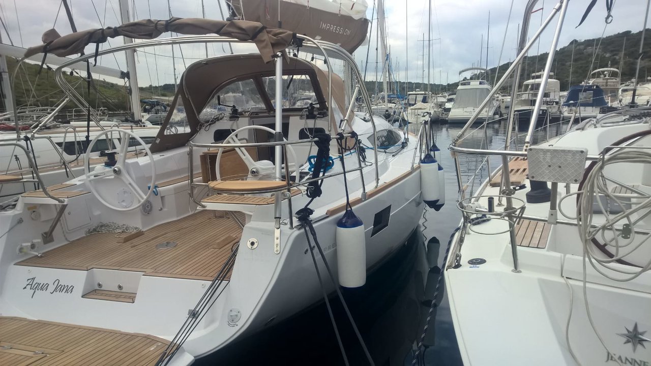 | Outside | Anker mit Kette, Badeleiter, Badeplattform, Biminitop, Bootshaken, Cockpitdusche, Cockpitkühlschrank, Cockpitlautsprecher, Cockpitpolster, Cockpittisch, Deckpolster, elektr. Ankerwinsch, Faltpropeller, Fender, Festmacherleinen, Gangway, Sprayhood, Teak im Cockpit, Unterwasserbeleuchtung, Wasserschlauch, Windex |