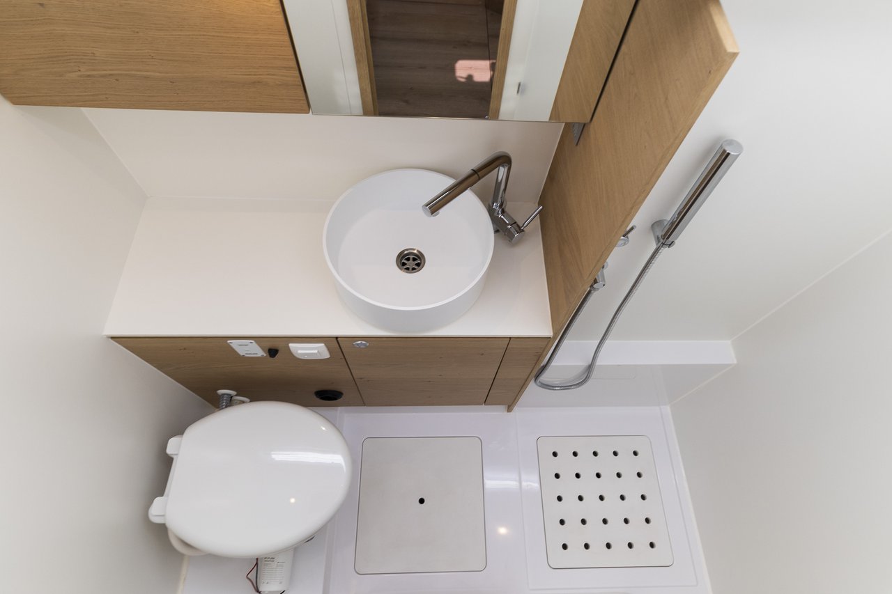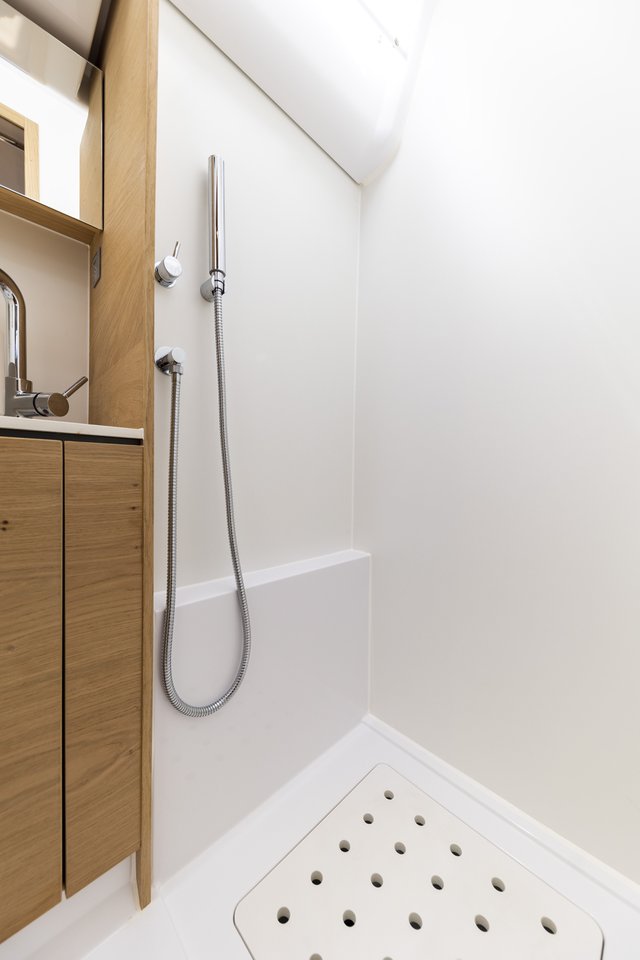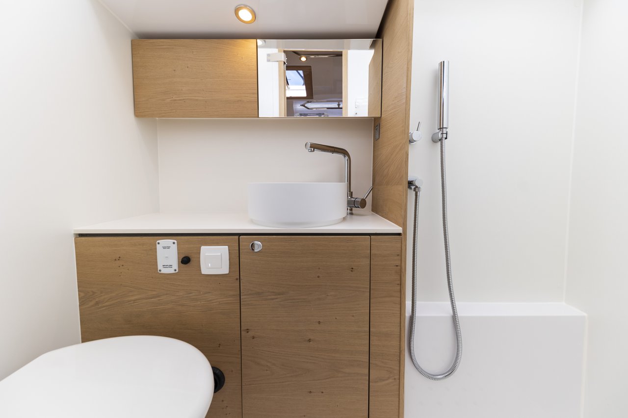 | Outside | 12 V-Anschluss, Anker mit Kette, Badeleiter, Badeplattform, Biminitop, Cockpitdusche, Cockpitlautsprecher, Cockpitpolster, Cockpittisch absenkbar, Deckbeleuchtung, elektr. Ankerwinsch, Gangway, Grill, Solaranlage, Sprayhood, Windex |