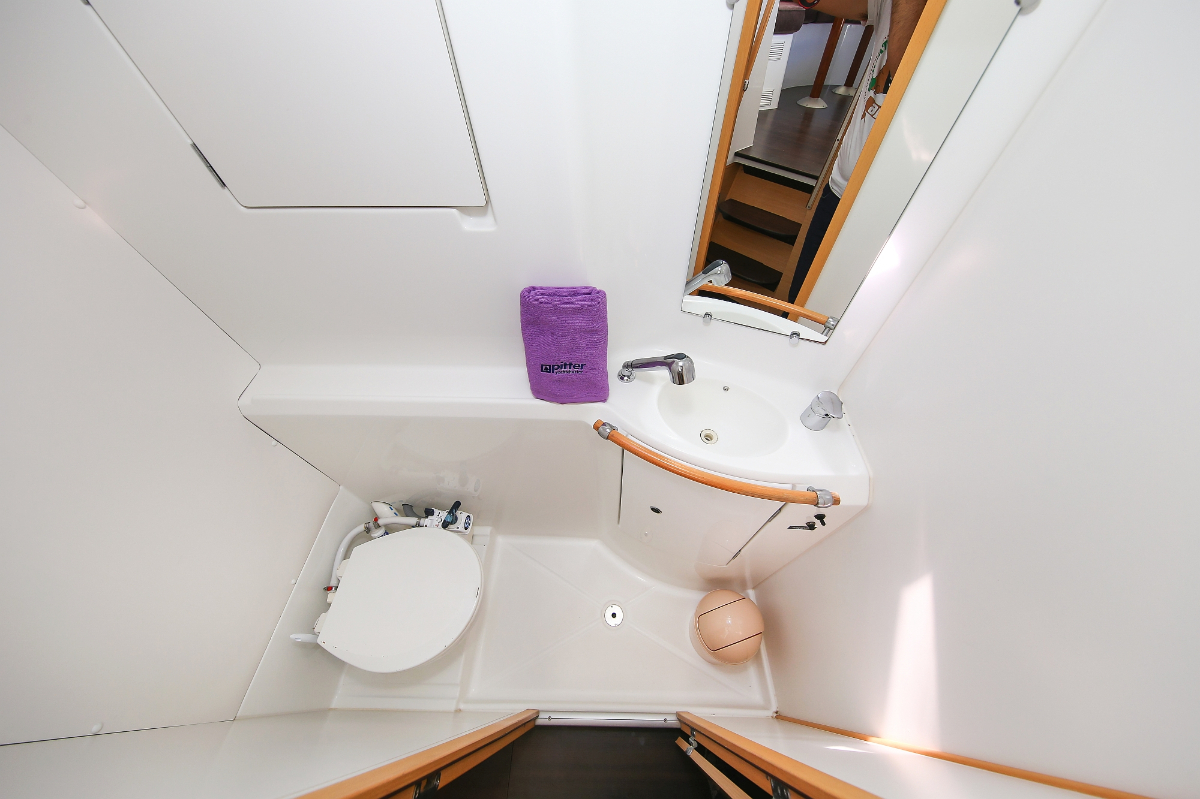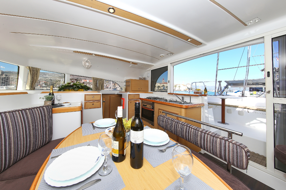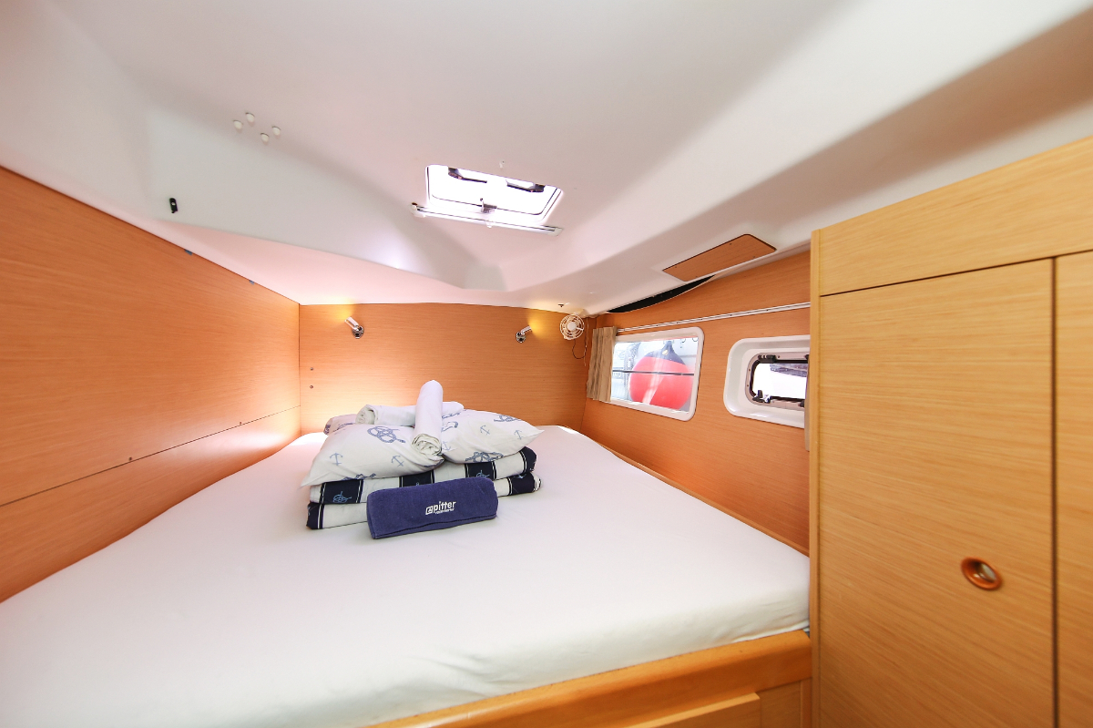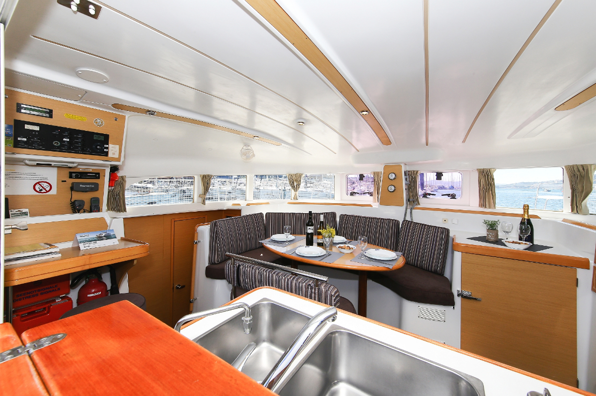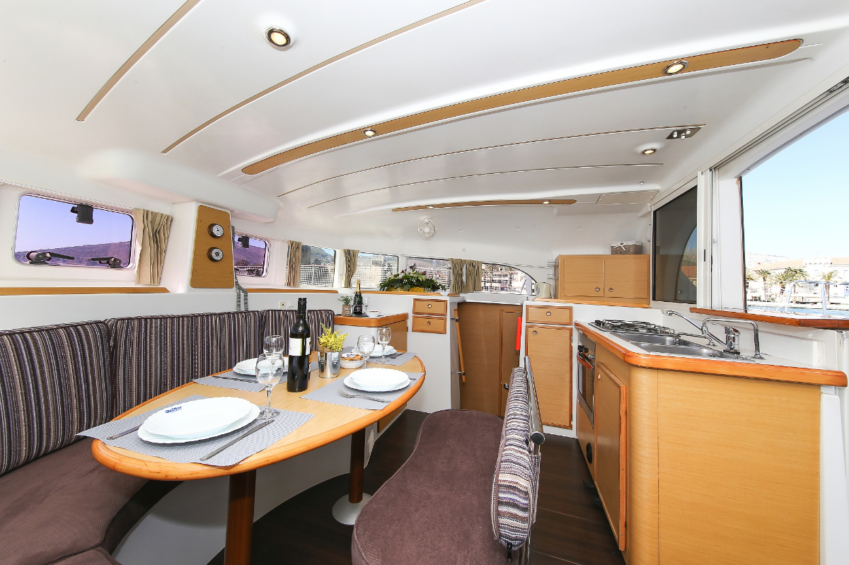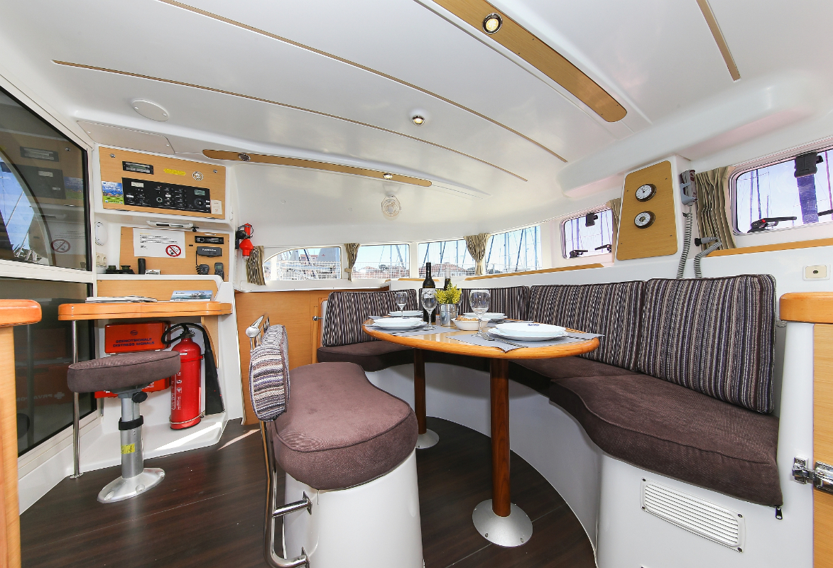 | Inside | Borduhr, Dusche, Eisbox, Heizung, Inverter 12V/220V, Kühlschrank, Ladegerät, Luftpumpe für Beiboot, Pantryausstattung, Radio mit CD, AUX und USB, Salontisch absenkbar, USB Steckdose, Ventilatoren in Kabinen, Warmwasser |
