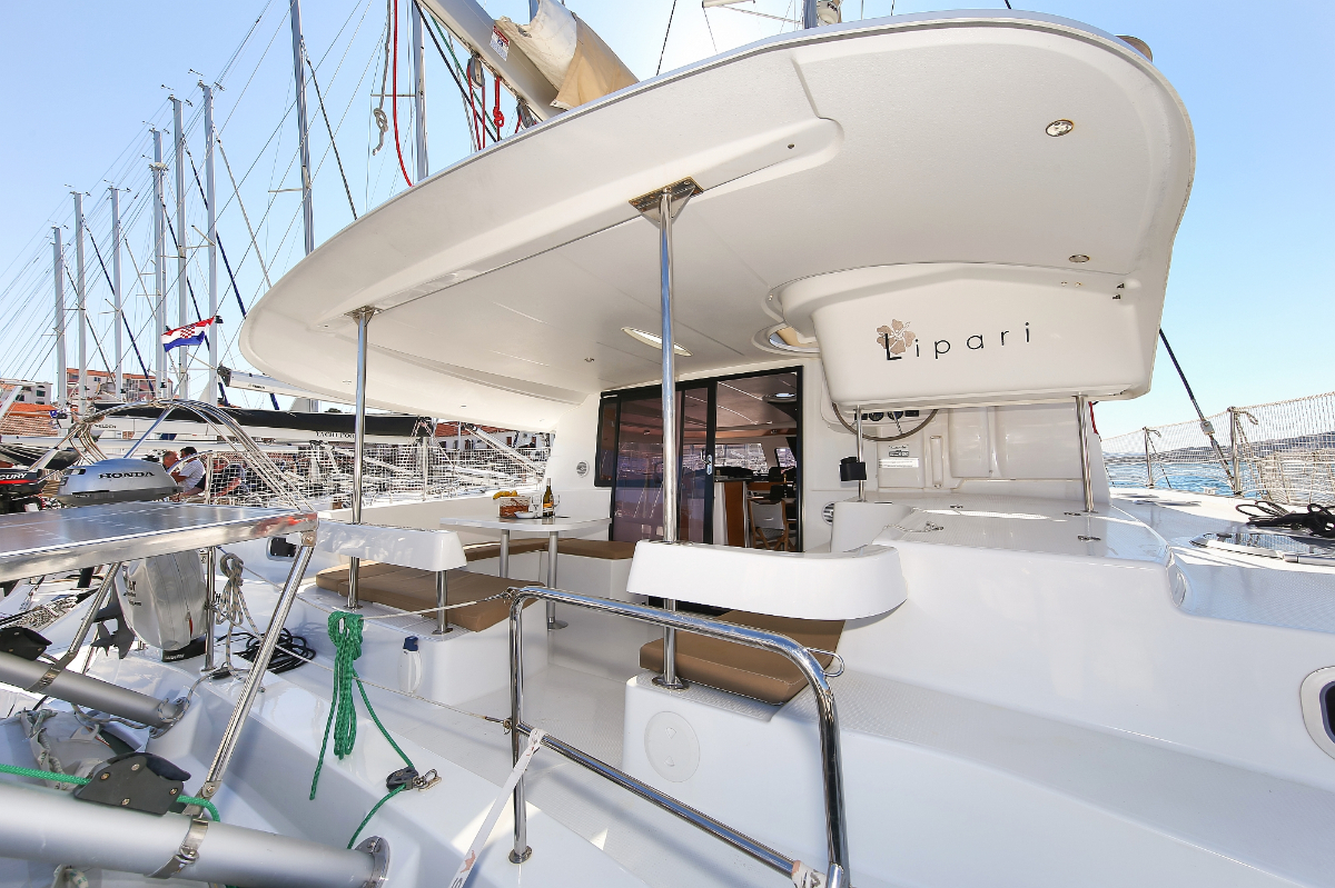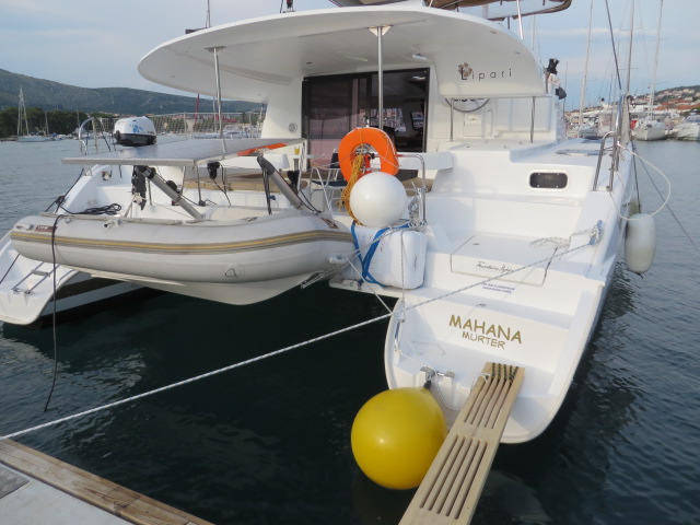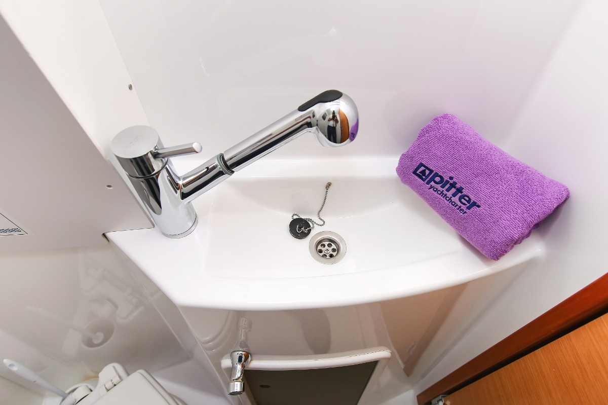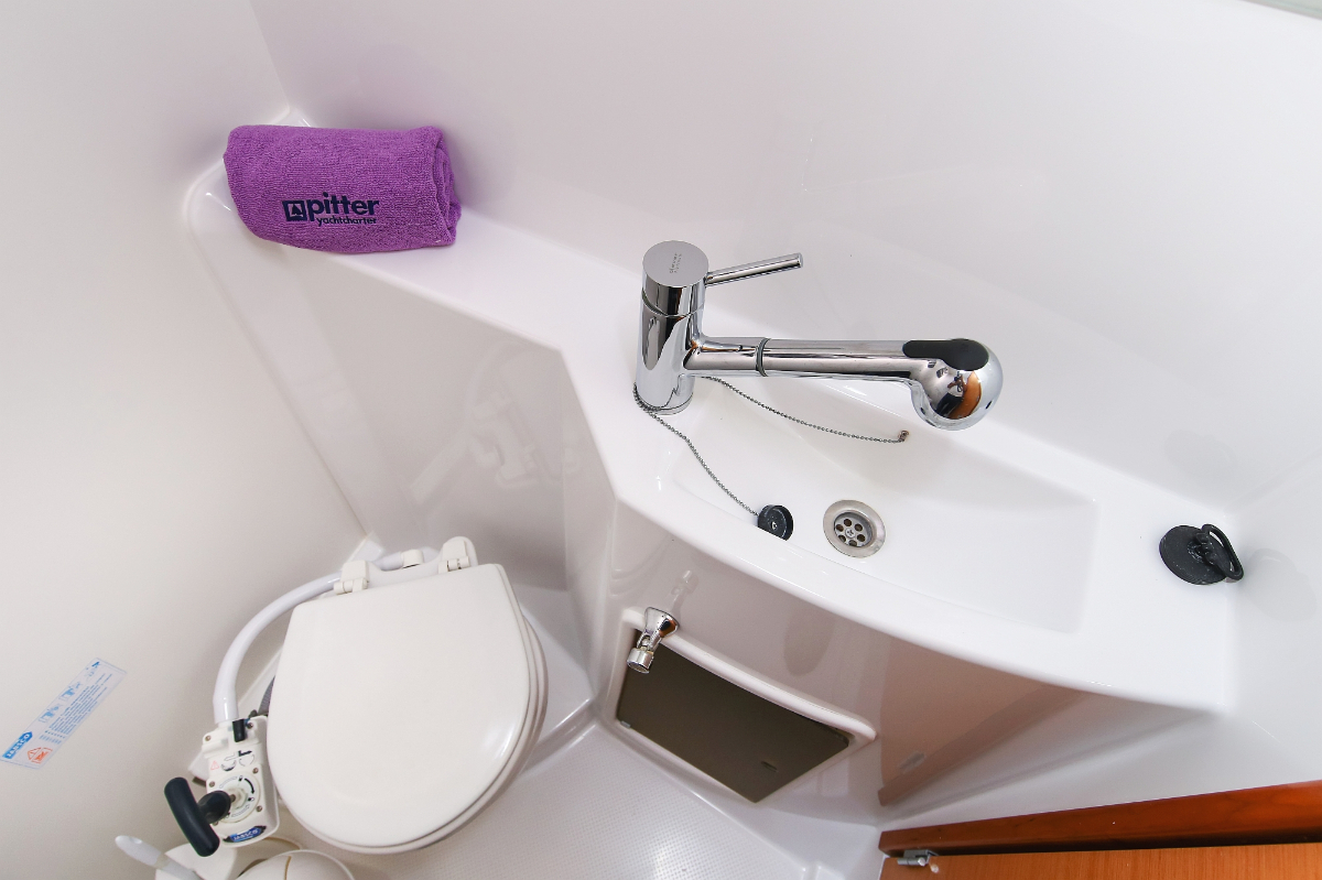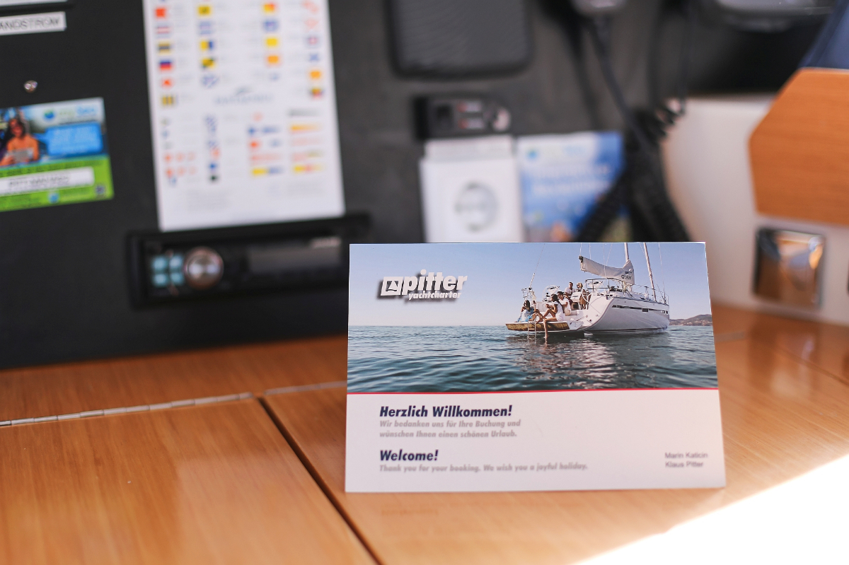| Outside | 220 V-Landanschluss, Anker mit Kette, Ankerwinsch, Badeplattform, Bootshaken, Cockpitdusche, Cockpitlautsprecher, Cockpitpolster, Cockpittisch, Davits, Dieselkanister , elektr. Ankerwinsch, elektr. Genuawinsch, elektr. Winsch, Fender, Festmacherleinen, Gangway, Kugelfender, Kunststoff-Eimer (Pütz), Solaranlage, Wantenschneider, Wasserkanister , Wasserschlauch, Windex |