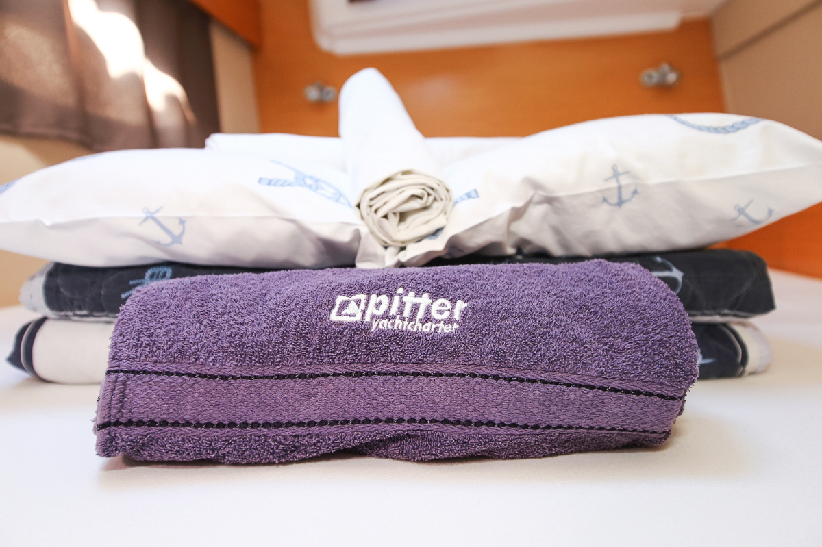 | Safety | Autopilot, Blitzboje, Bootsmannstuhl, Bordapotheke, Bordwerkzeug, Feststoffschwimmwesten, Feuerlöscher, Lifebelts, Motor-Ersatzteile, Nebelhorn, Notsignale, Radarreflektor, Reparaturset für Beiboot, Rettungsinsel, Suchscheinwerfer, Taschenlampe, UKW-Funk, Zweitanker |