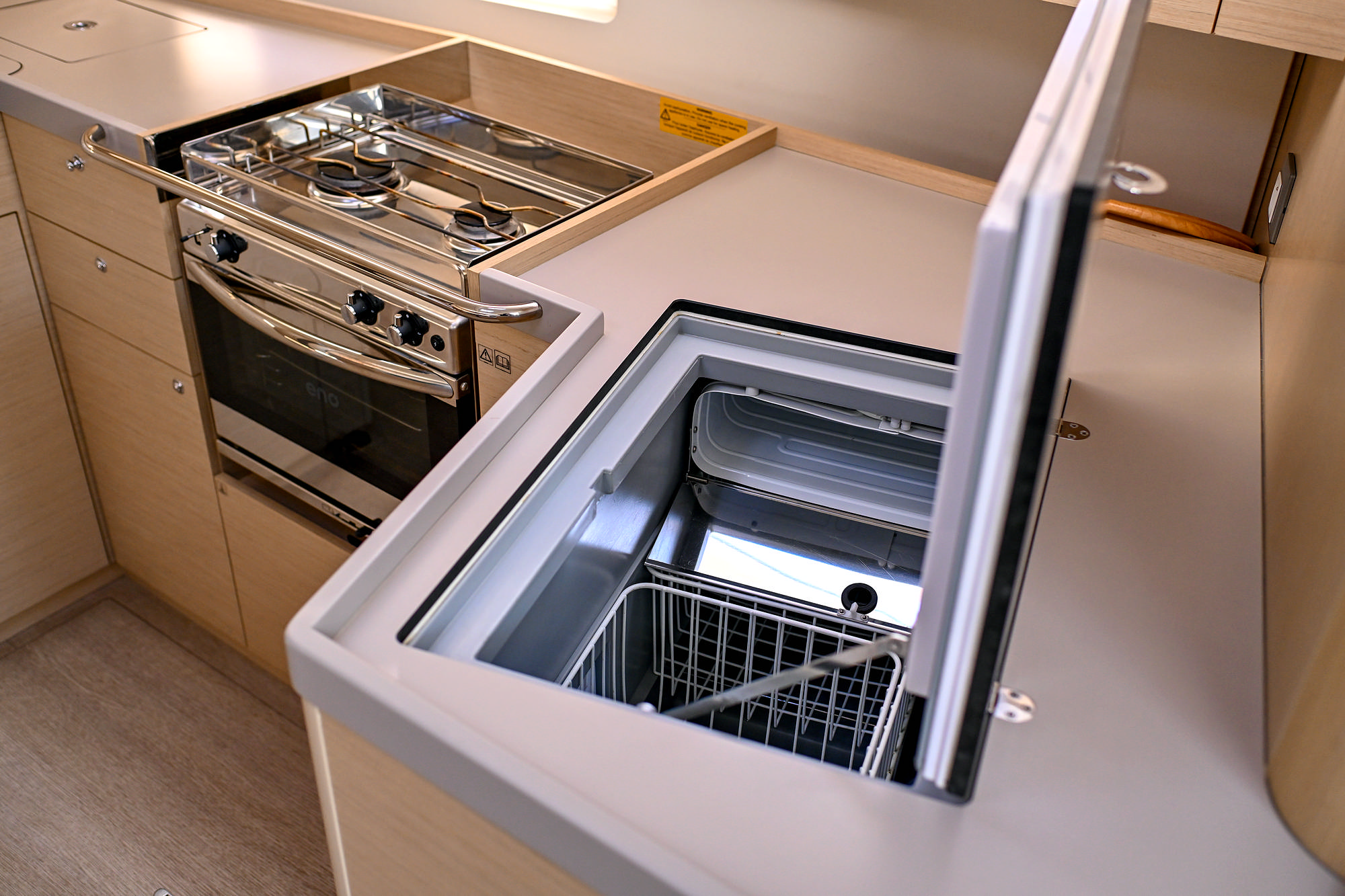 | Inside | Backofen, Gasherd, Generator, Klimaanlage (ohne Landstrombedarf), Kühlschrank, Ladegerät, Radio, Salontisch absenkbar, Ventilatoren in Kabinen, Warmwasser |
