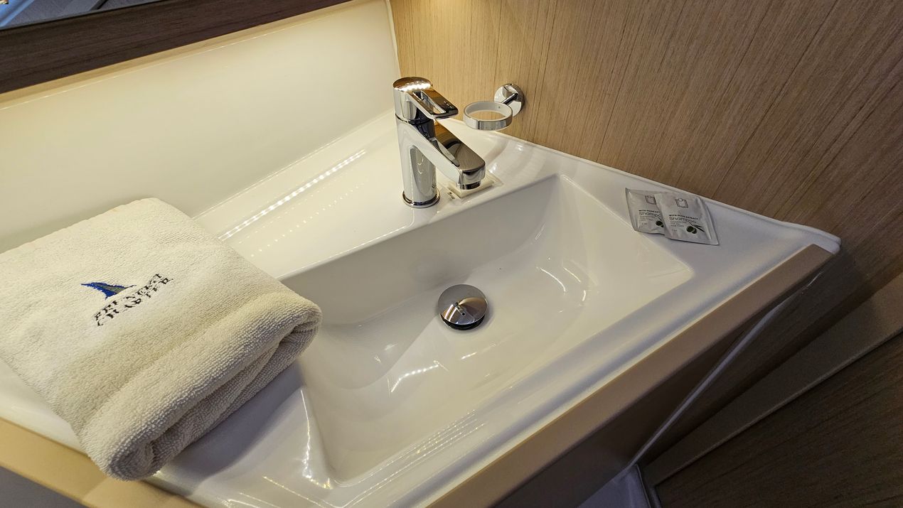 | Outside | 220 V-Landanschluss, Anker mit Kette, Badeleiter, Badeplattform, Biminitop, Cockpitdusche, Cockpitkühlschrank, Cockpitlautsprecher, Cockpitpolster, Cockpittisch, elektr. Ankerwinsch, Fender, Festmacherleinen, Gangway, Solaranlage, Sprayhood, Wasserschlauch, Windex |