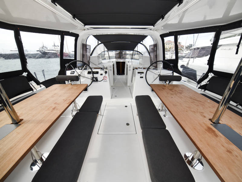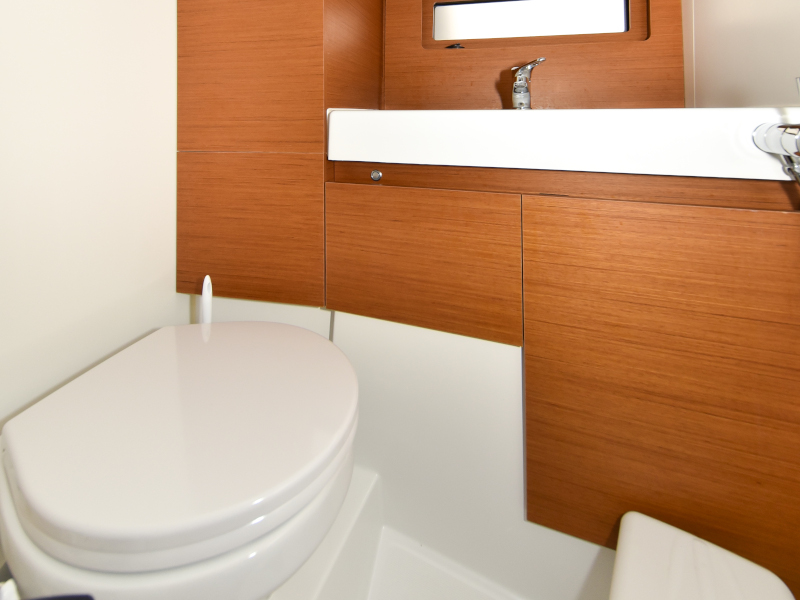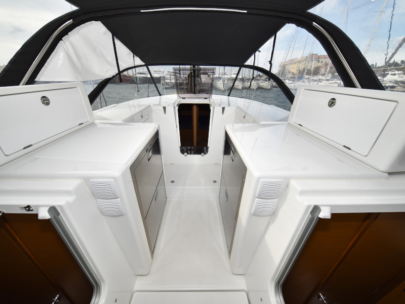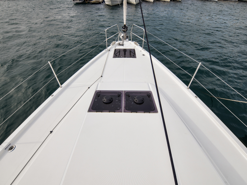 | Outside | 220 V-Landanschluss, Anker mit Kette, Anker mit Kette und Seil, Ankerwinsch, Badeplattform, Biminitop, Bootshaken, Cockpitdusche, Cockpitleuchte, elektr. Ankerwinsch, Fender, Festmacherleinen, Sprayhood, Teak im Cockpit, Wasserschlauch, Windex |