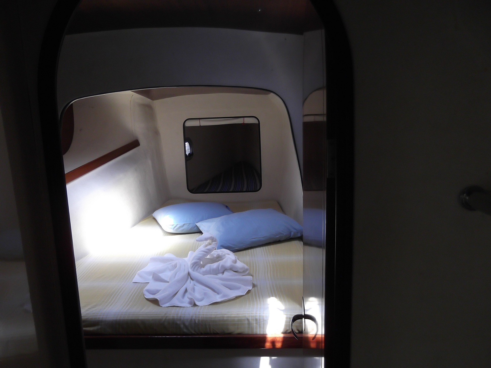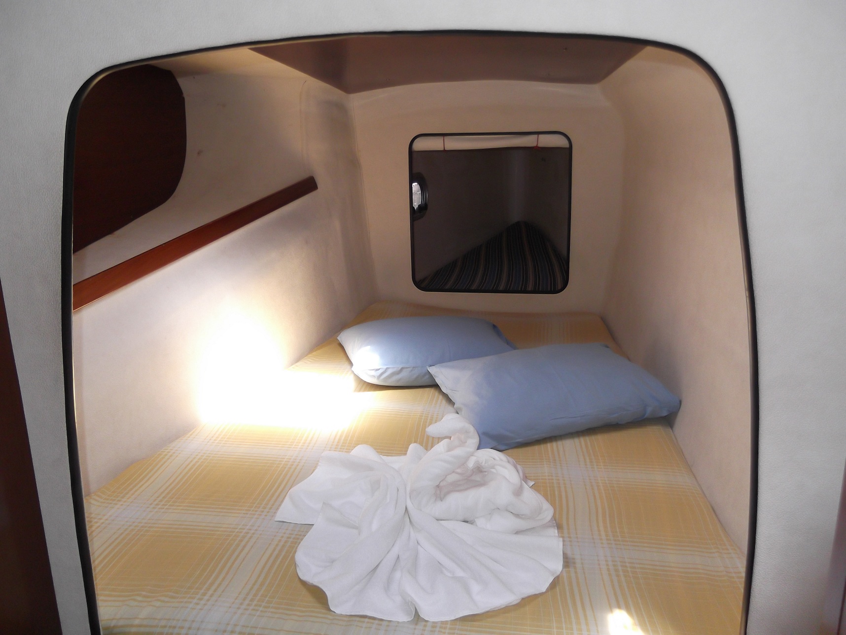 Kabinen in der Vorpiek nur durch die Bugkabine erreichbar. Trennung durch Stoffrollos.