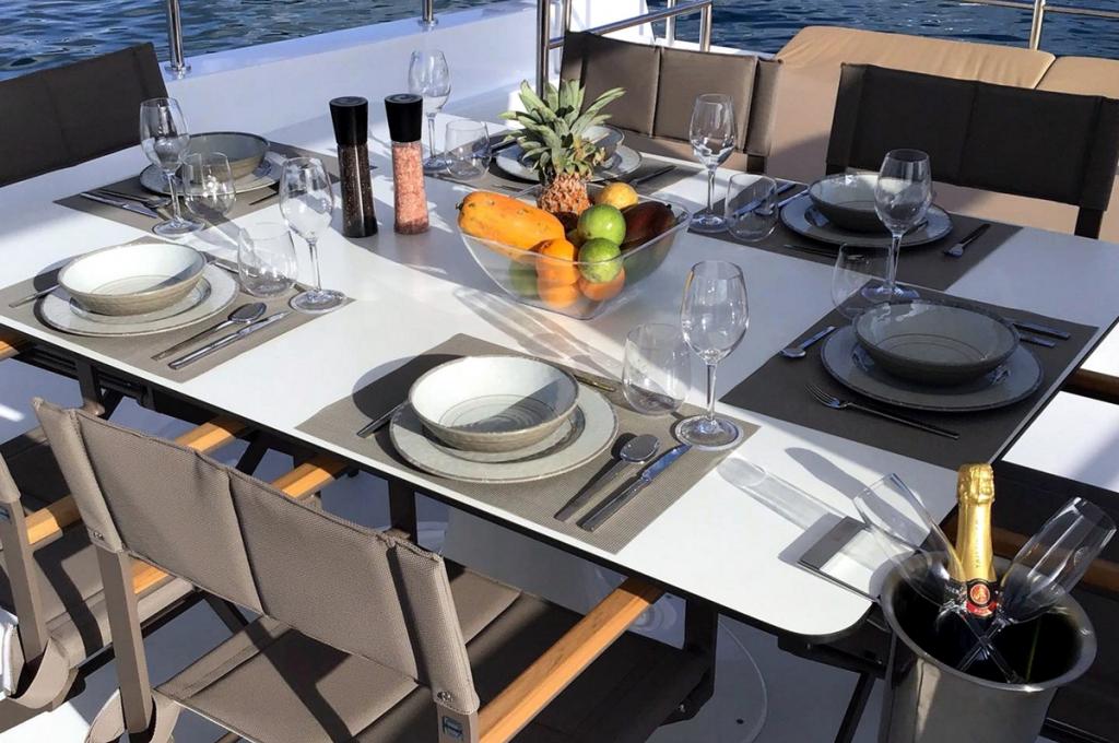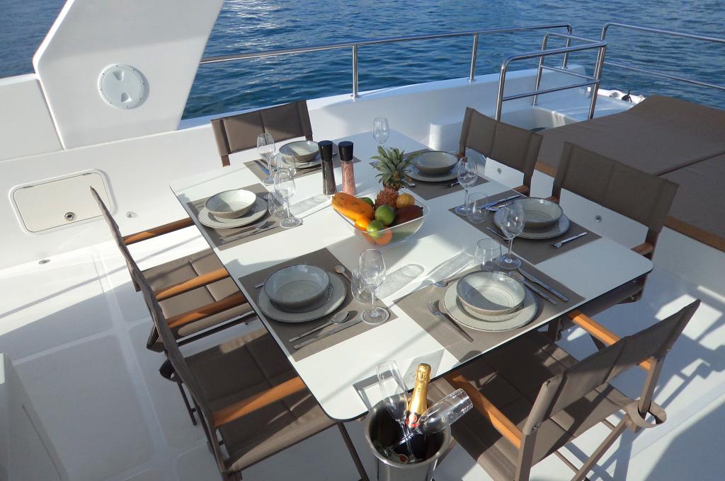 | Inside | Fön, Generator, Inverter 12V/220V, Klimaanlage (ohne Landstrombedarf), Lautsprecher im Salon, Nespresso-Maschine, Watermaker |