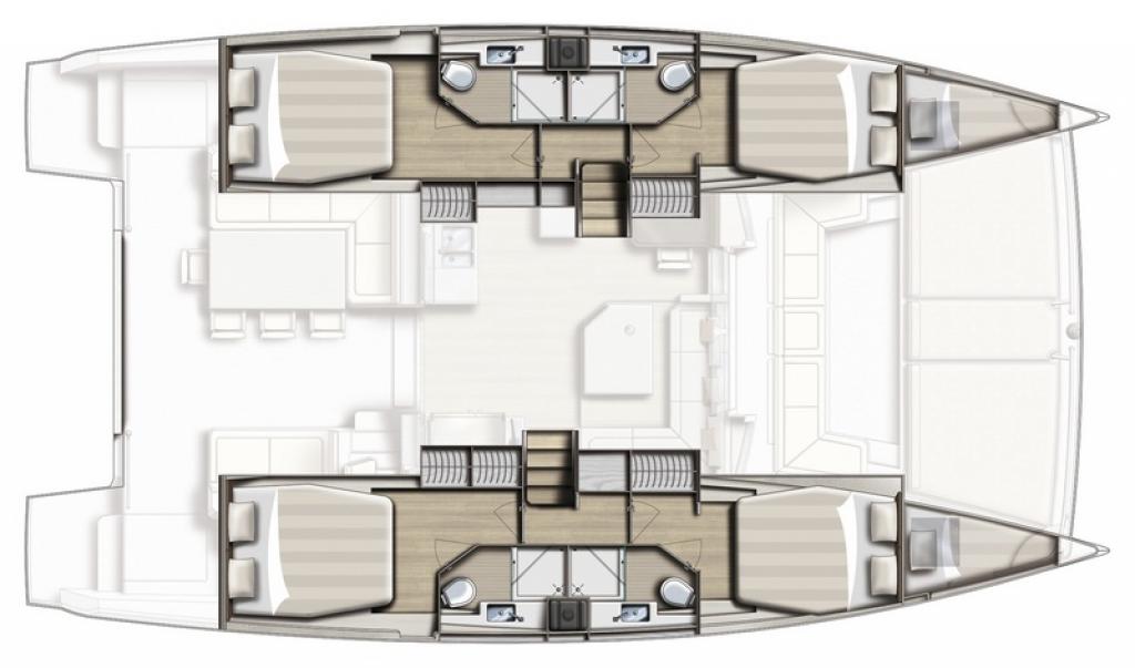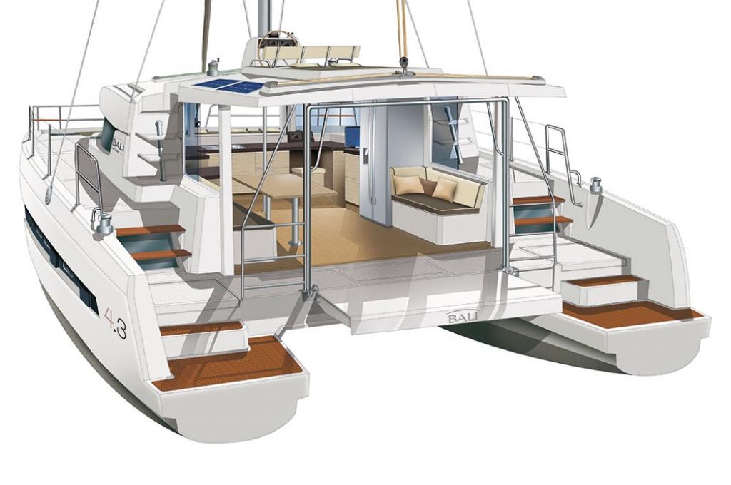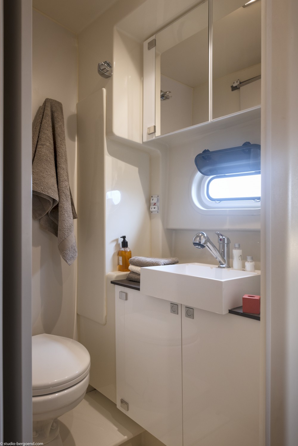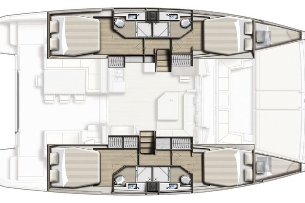 | Inside | Eiswürfelmaschine, Gefrierschrank, Generator, Inverter 12V/220V, Klimaanlage (ohne Landstrombedarf), Kühlschrank, Radio mit Bluetooth, Salontisch absenkbar, Ventilatoren in Kabinen, Watermaker, WC (elektr.) |