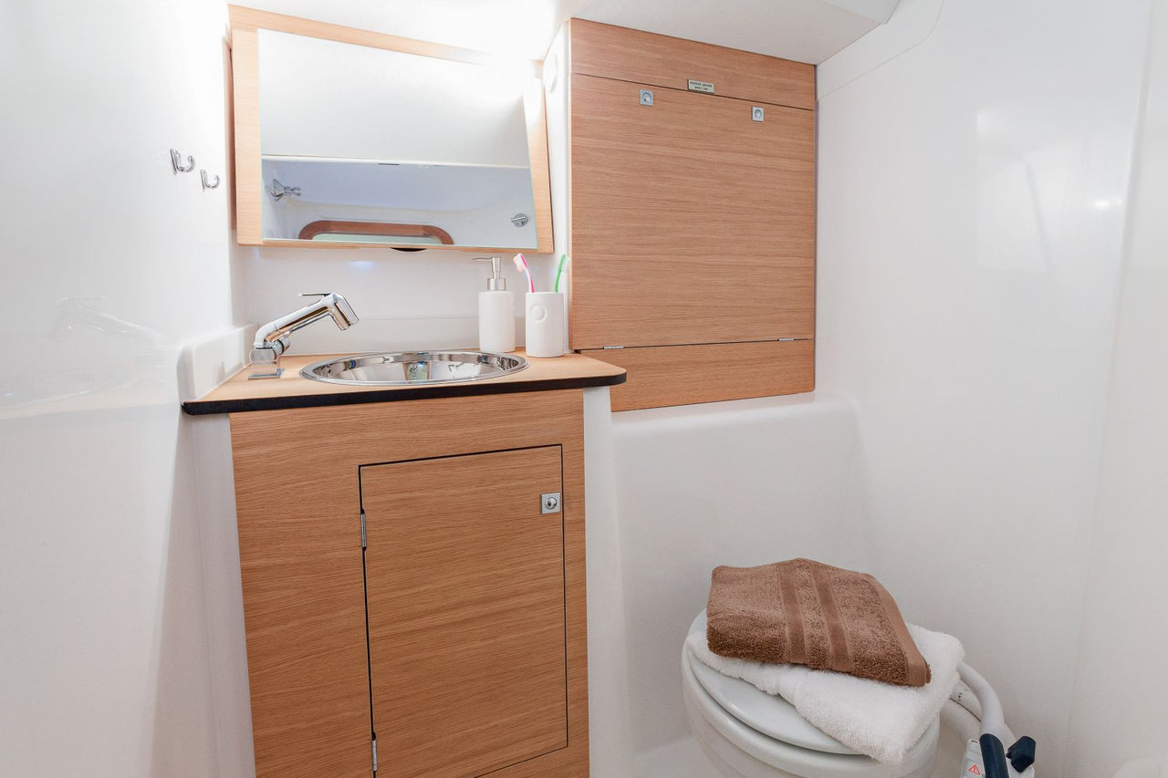 | Outside | 220 V-Landanschluss, Biminitop, Cockpitdusche, Cockpitlautsprecher, Cockpitpolster, Cockpittisch, elektr. Ankerwinsch, Sprayhood |