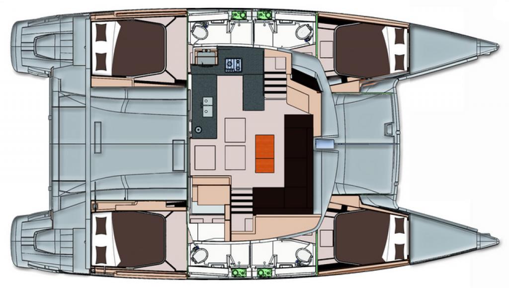 | Inside | 220V Steckdosen, Backofen, Fäkalientank, Inverter 12V/220V, Kühlschrank, Pantryausstattung, Radio mit USB und Bluetooth, Ventilatoren in Salon und Kabinen, Warmwasser, WC |