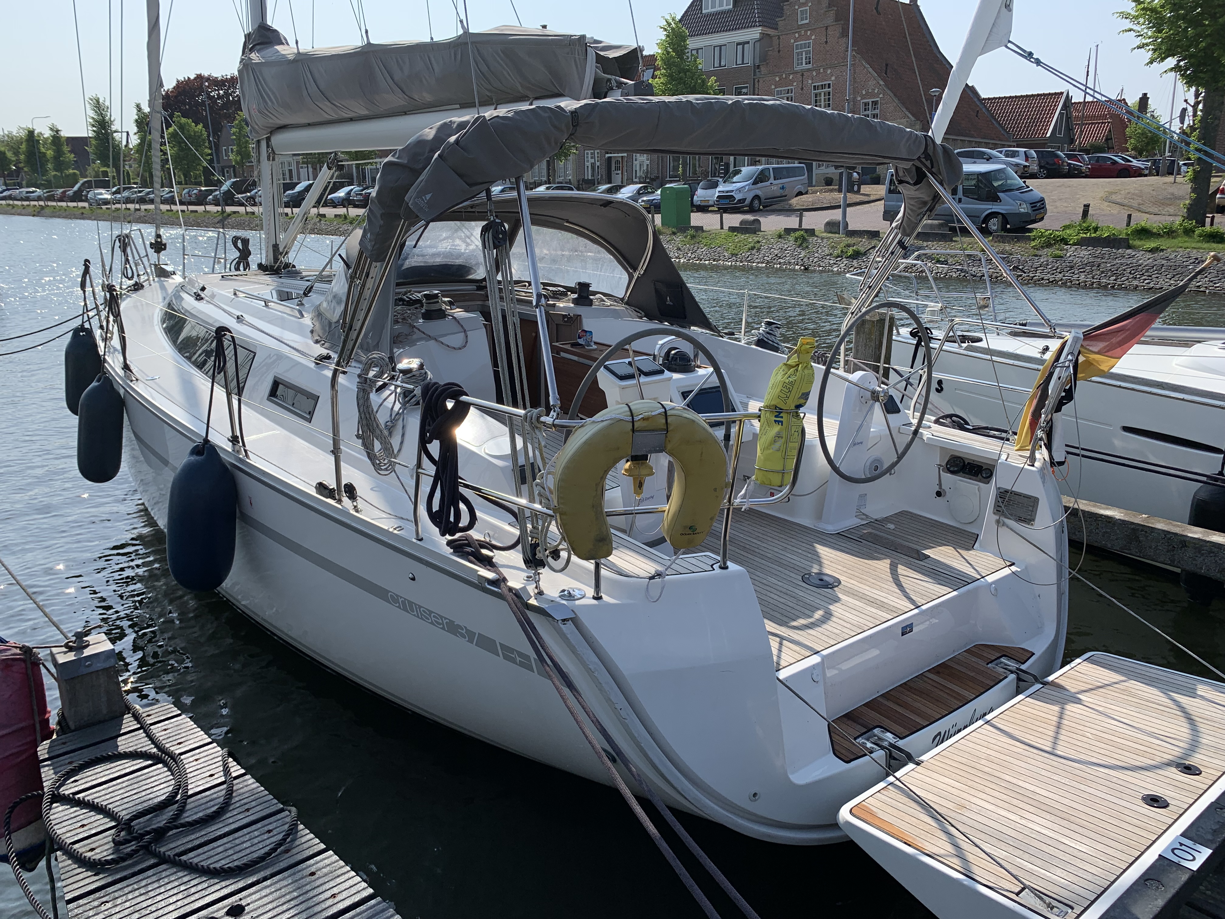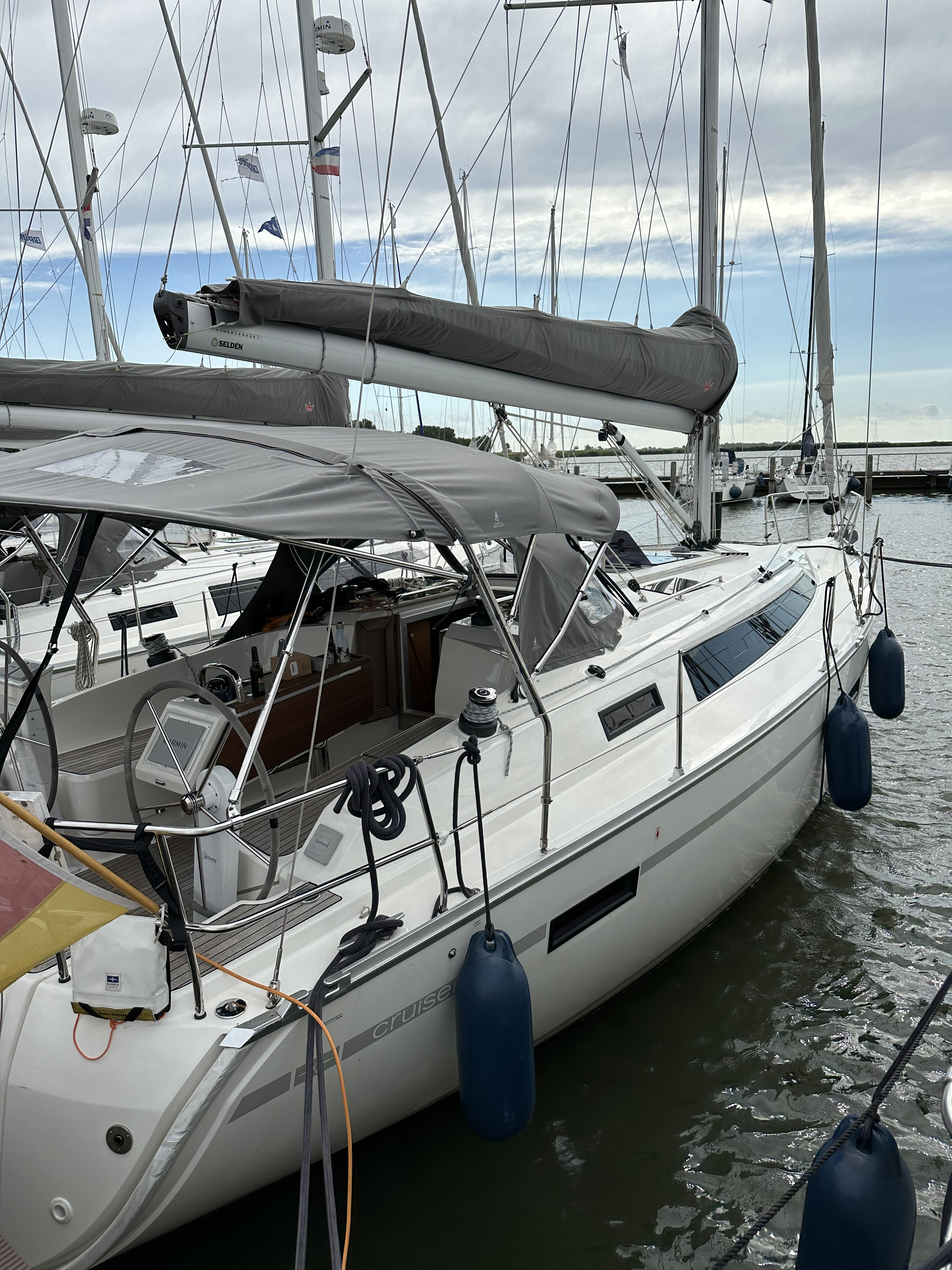 | Outside | 220 V-Landanschluss, Anker mit Kette, Ankerwinsch, Biminitop, Bootshaken, Cockpitdusche, Cockpitlautsprecher, Cockpitpolster, Cockpittisch, elektr. Ankerwinsch, Fender, Festmacherleinen, Kugelfender, Kunststoff-Eimer (Pütz), Sprayhood, Teak im Cockpit, Wantenschneider, Wasserschlauch, Windex |