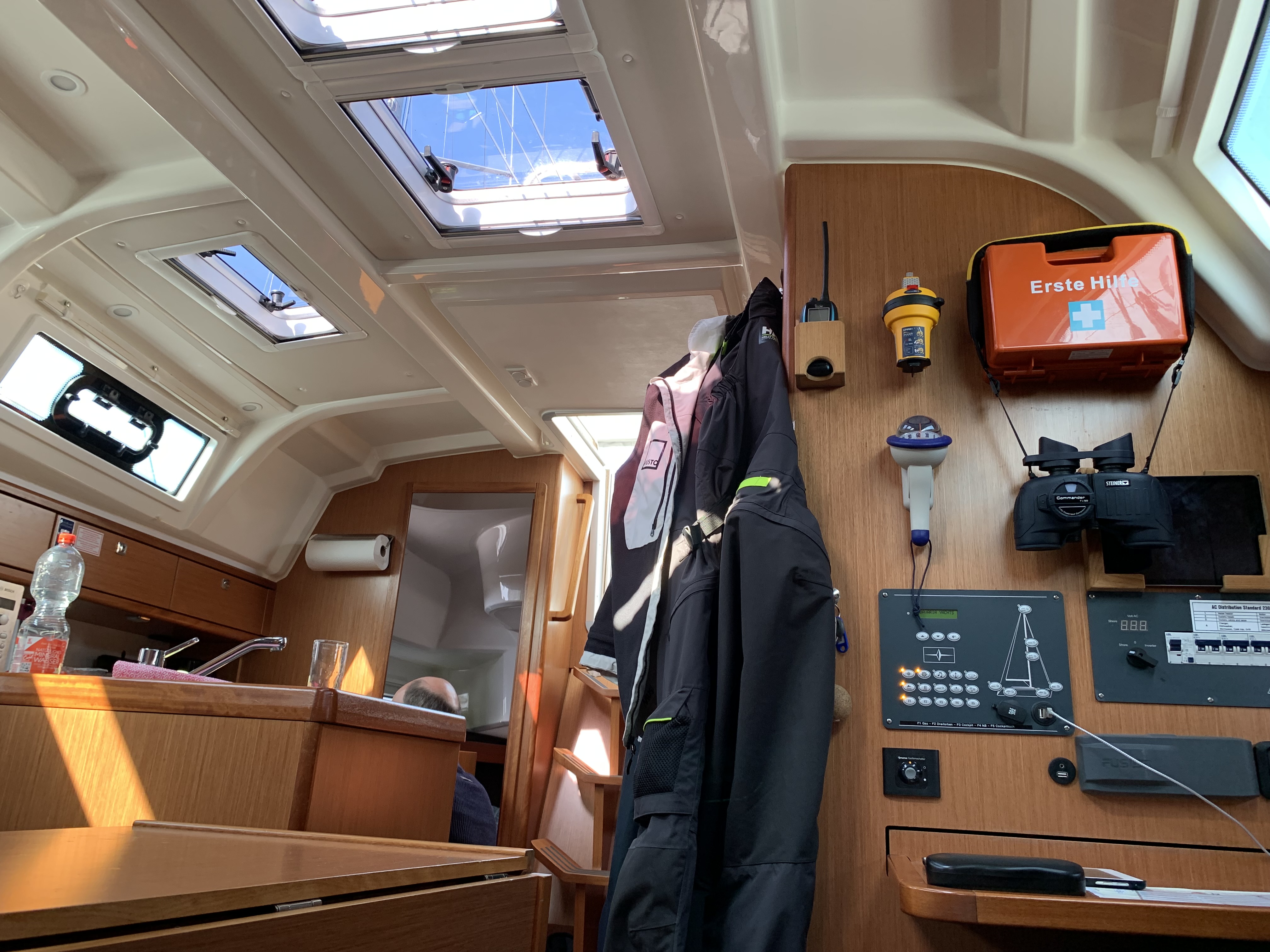 | Navigation | Barometer, Fernglas mit Peilkompass, GPS mit Kartenplotter im Cockpit, Hafenhandbücher, Handpeilkompass, Navigationsbesteck, Seekarten, Tablet-PC am Kartentisch, Tridata (Log, Echolot, Windm.) |