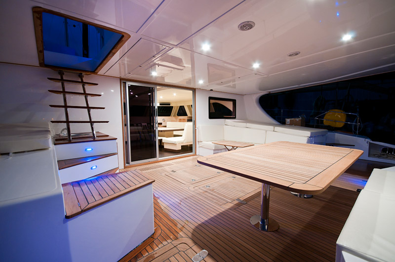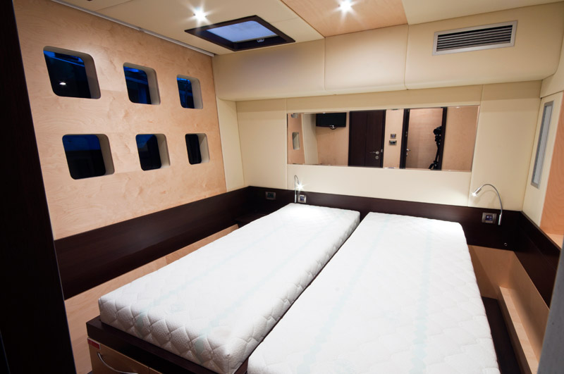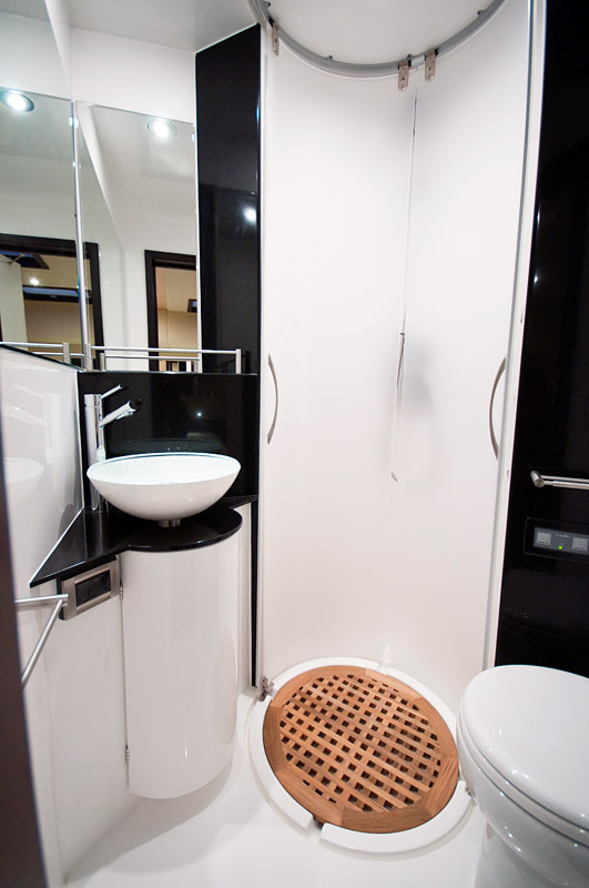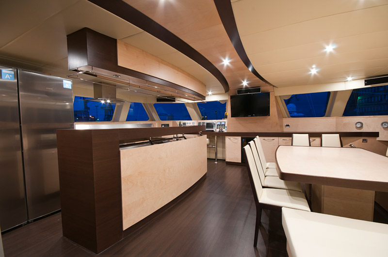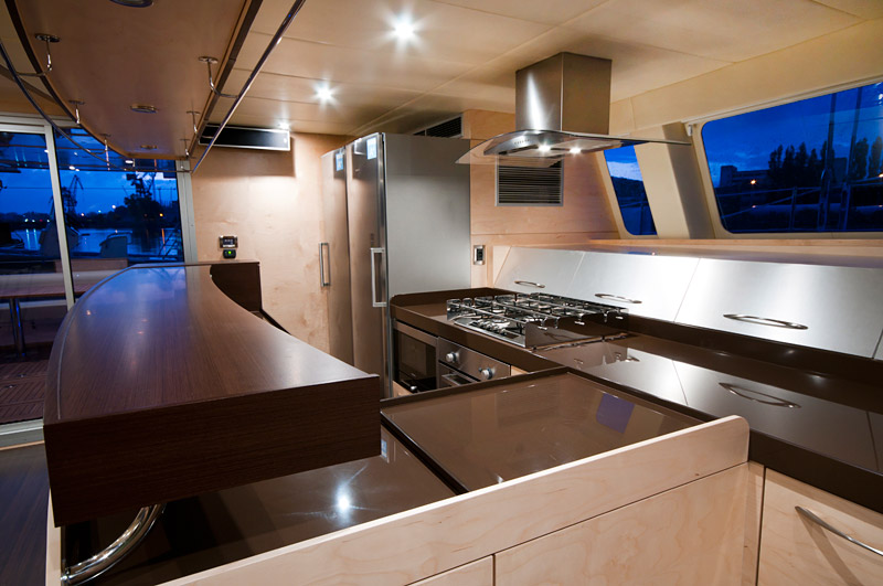 | Inside | Dusche, DVD-Player, Eiswürfelmaschine, Gasherd mit Backofen, Gefrierschrank, Generator, Geschirrspüler, Inverter 12V/220V, Kaffeemaschine, Klimaanlage, Kühlschrank, Mikrowelle, Pantryausstattung, TV, Warmwasser, Watermaker, WC (elektr.), Weinkühlschrank |