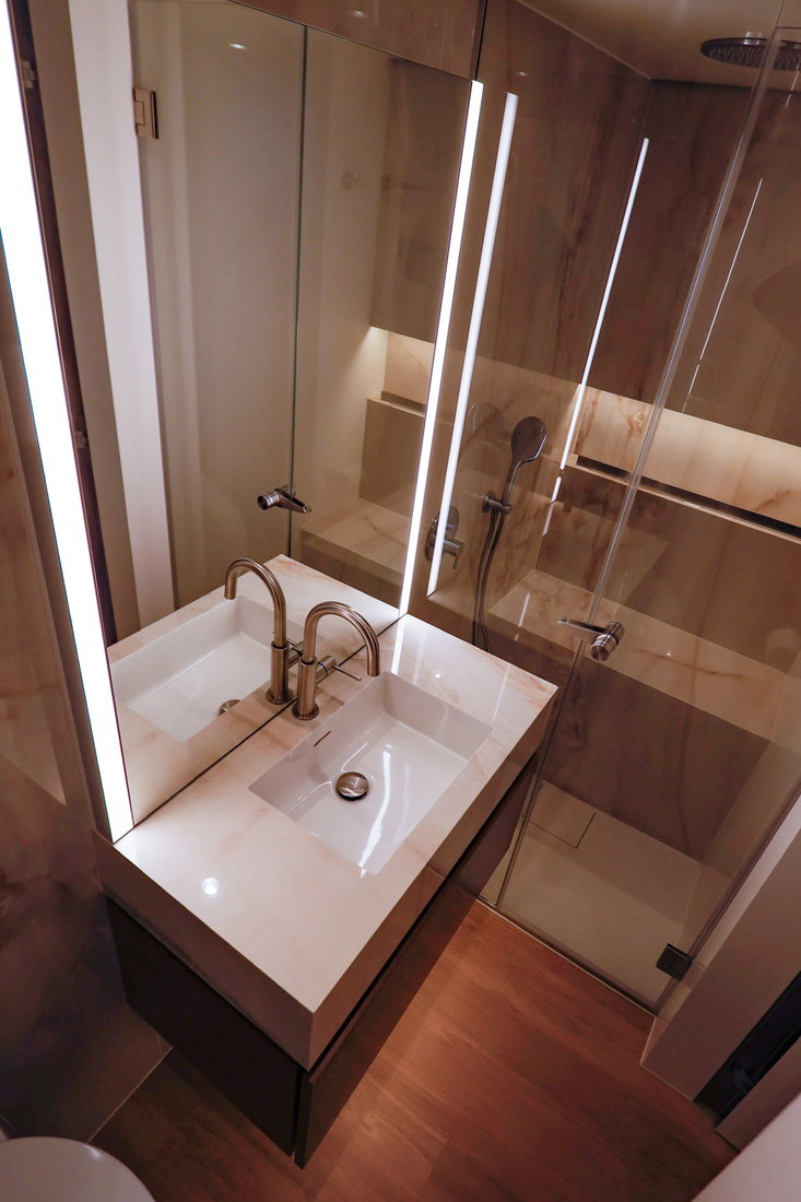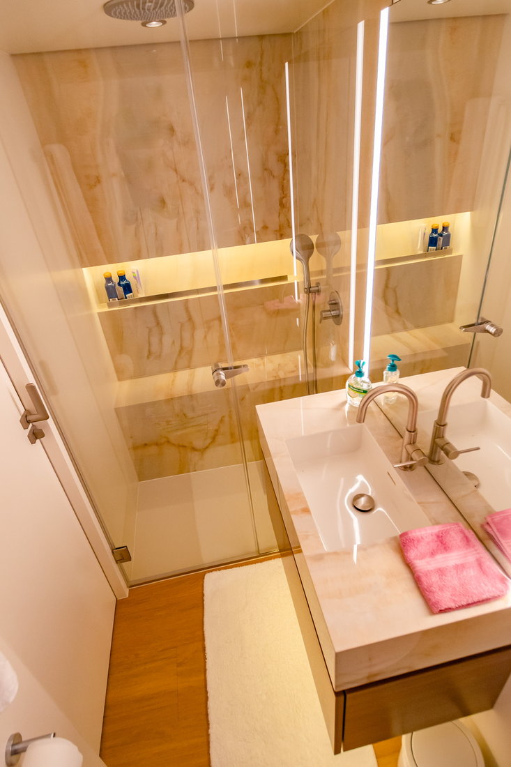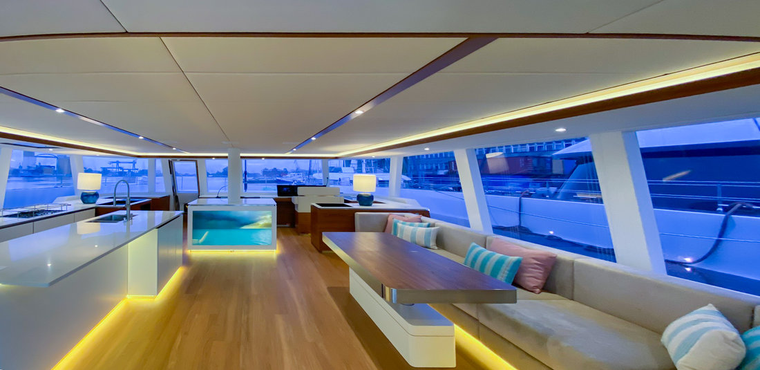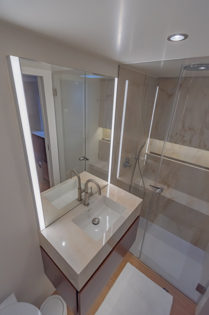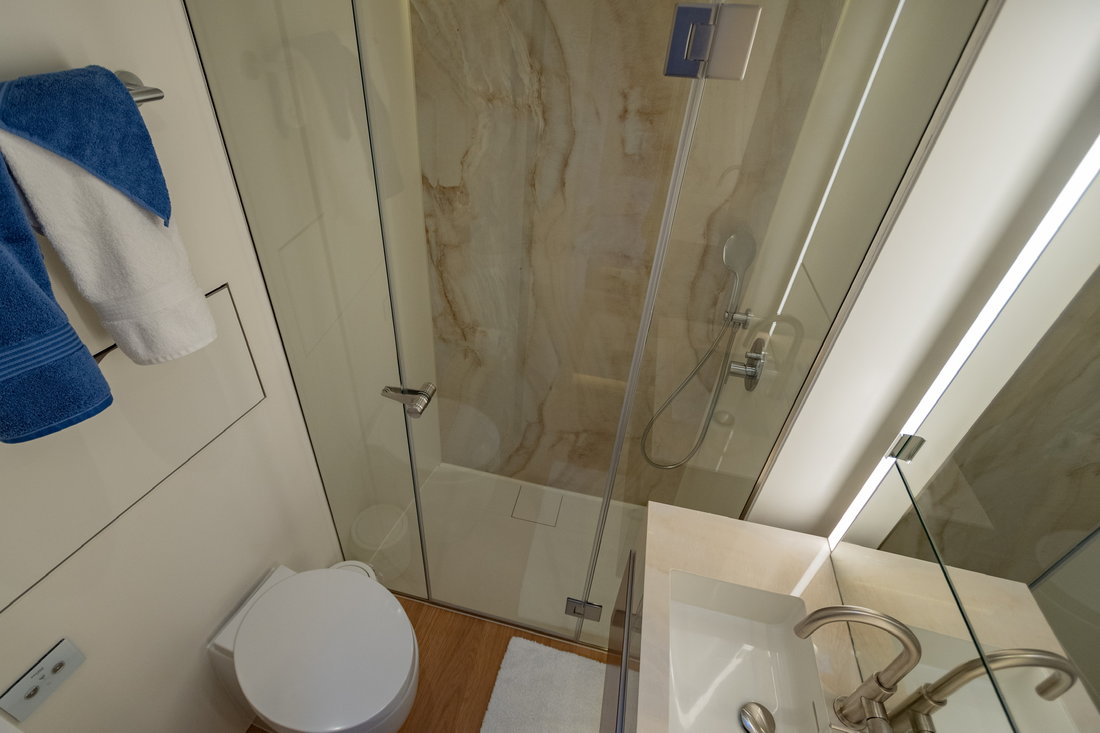 | Inside | Eiswürfelmaschine, Gefrierschrank, Generator, Geschirrspüler, Klimaanlage (ohne Landstrombedarf), Kühlschrank, LCD Fernseher, Sound System, Trockner, Waschmaschine, Watermaker, Weinkühlschrank |