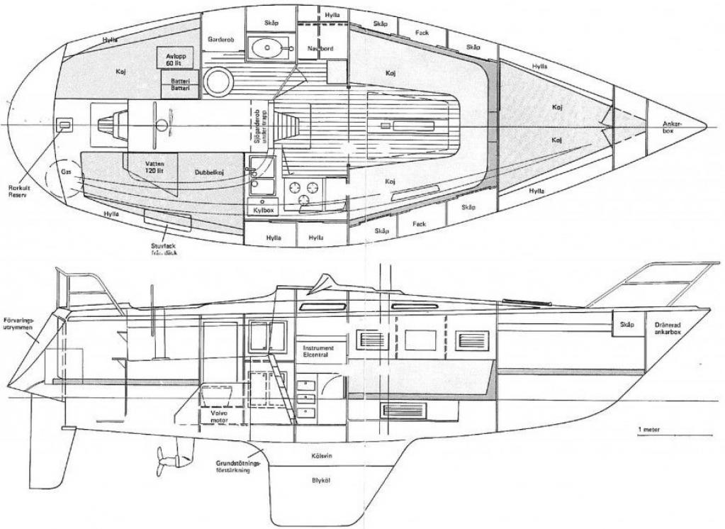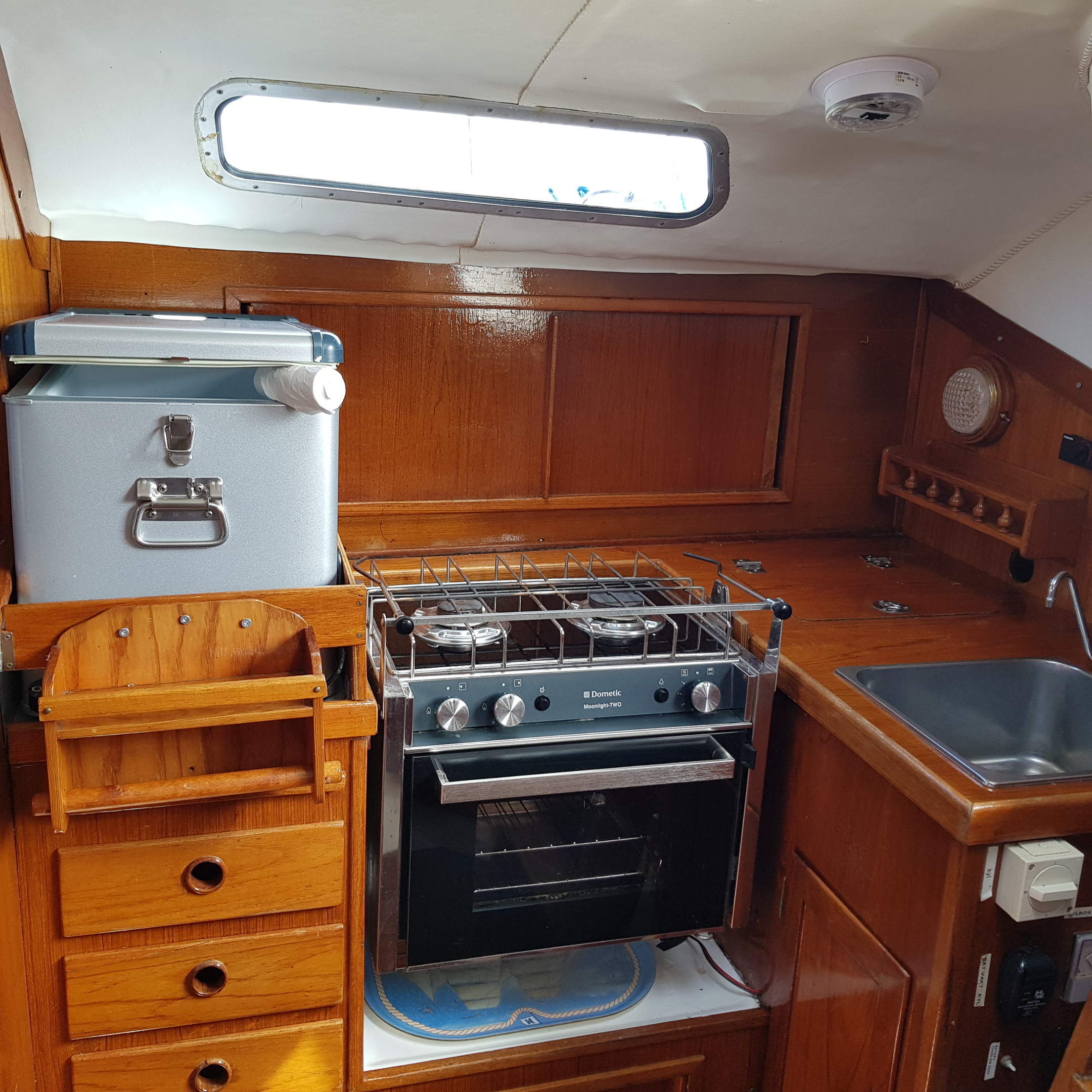 | Outside | Anker mit Kette, Badeleiter, Fender, Festmacherleinen, Solaranlage, Winschen |