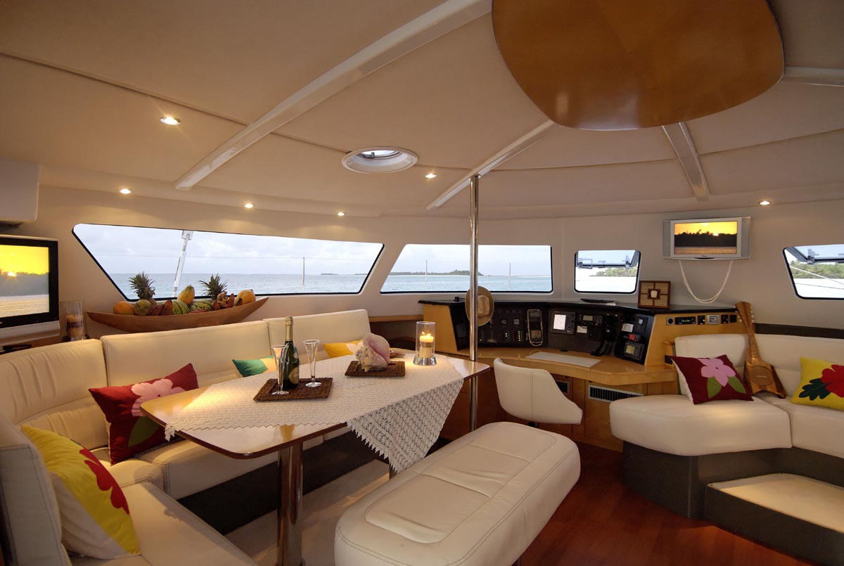 | Inside | 12V/220V-Steckdosen, Backofen, Eisbox, Gasherd, Gefrierschrank, Generator, Geschirrspüler, Inverter 12V/220V, Klimaanlage (ohne Landstrombedarf), Kühlschrank, Ladegerät, Mikrowelle, Pantryausstattung, Radio mit CD, TV + DVD, Warmwasser, Watermaker, WC (elektr.) |