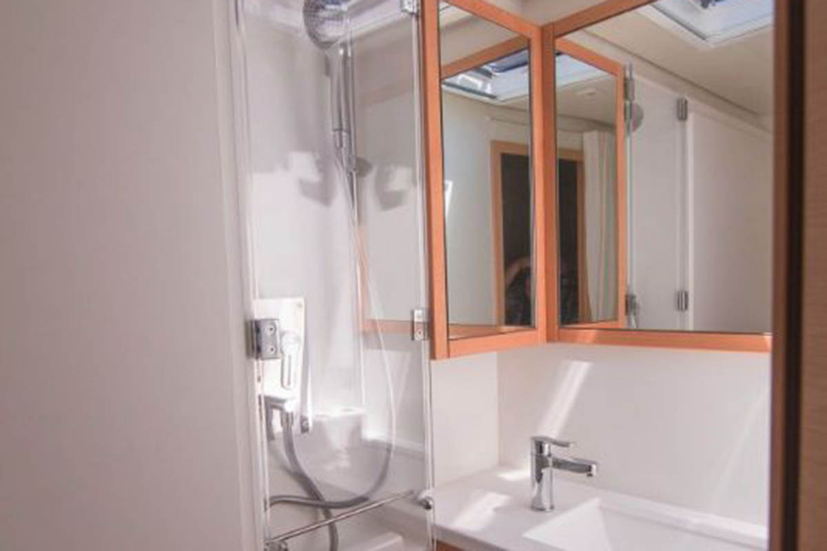 2. Kühlschrank, 220V Steckdosen, Backofen, CD-Player, Fäkalientank, Gasherd, Gefrierschrank, Generator, Geschirrspüler, Heizung, Inverter 12V/220V, Klimaanlage (ohne Landstrombedarf), Kühlschrank, Ladegerät, Lautsprecher im Salon, Mikrowelle, Mokkakanne, Pantryausstattung, Radio mit CD und USB, Toaster, Wasserkocher, Watermaker, WC (elektr.) |