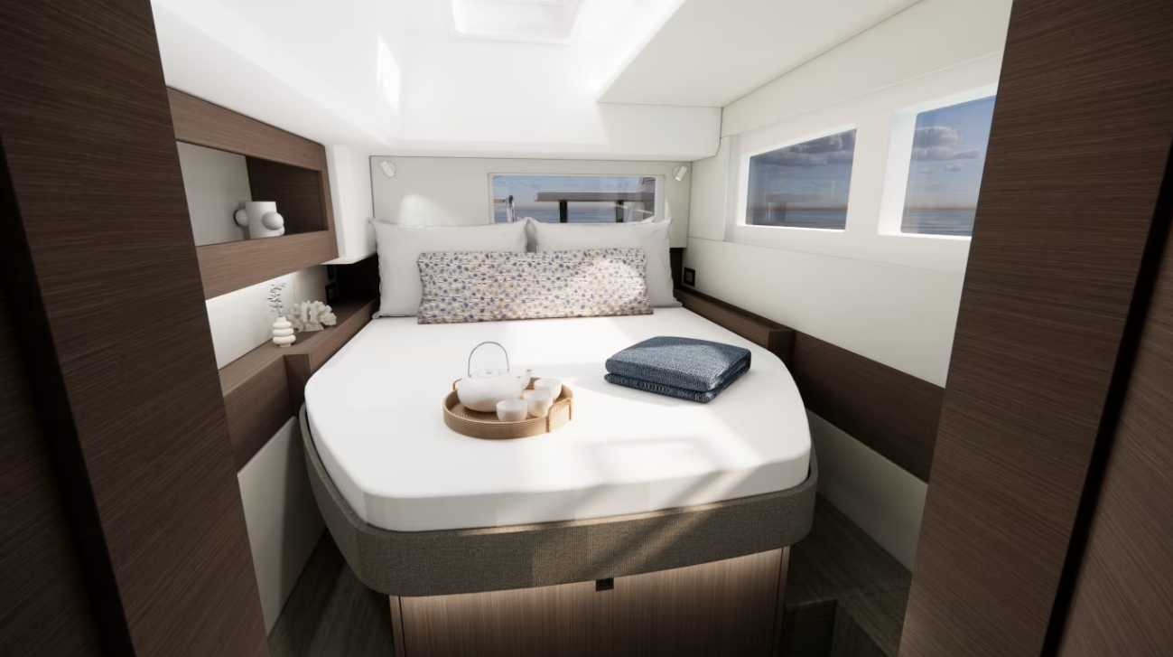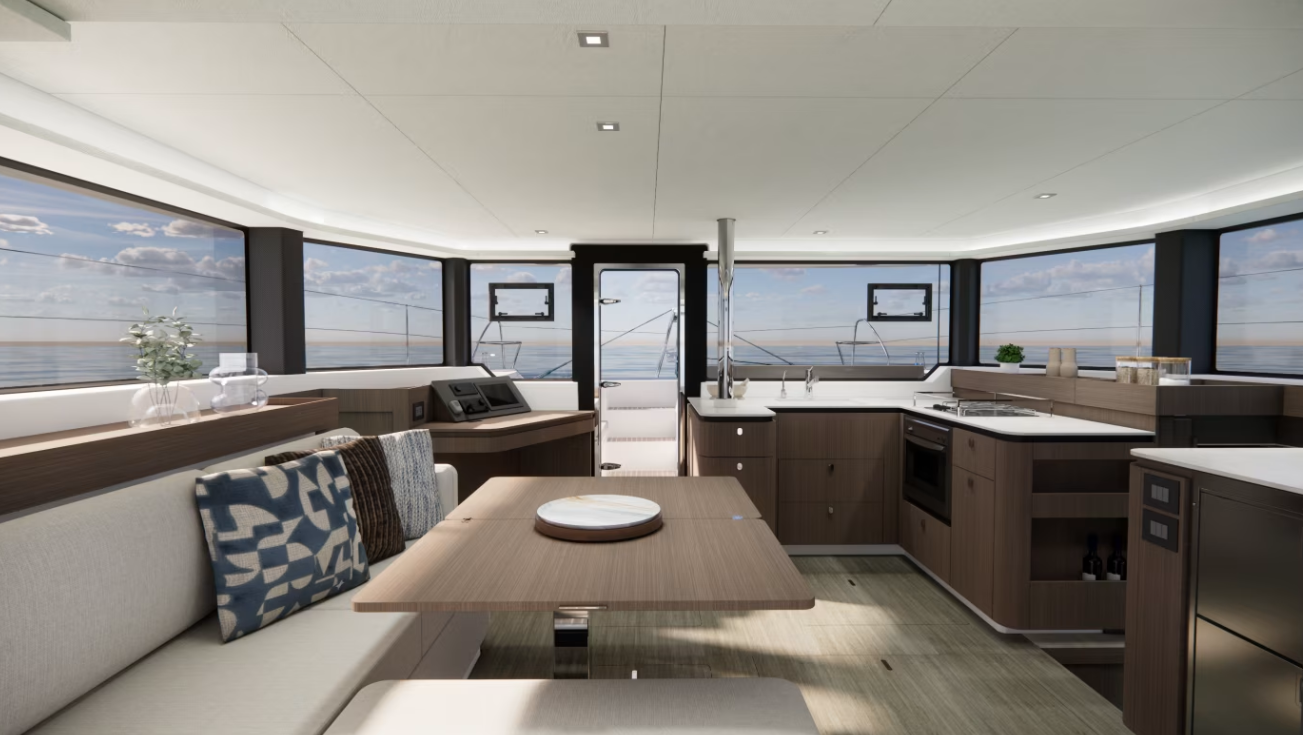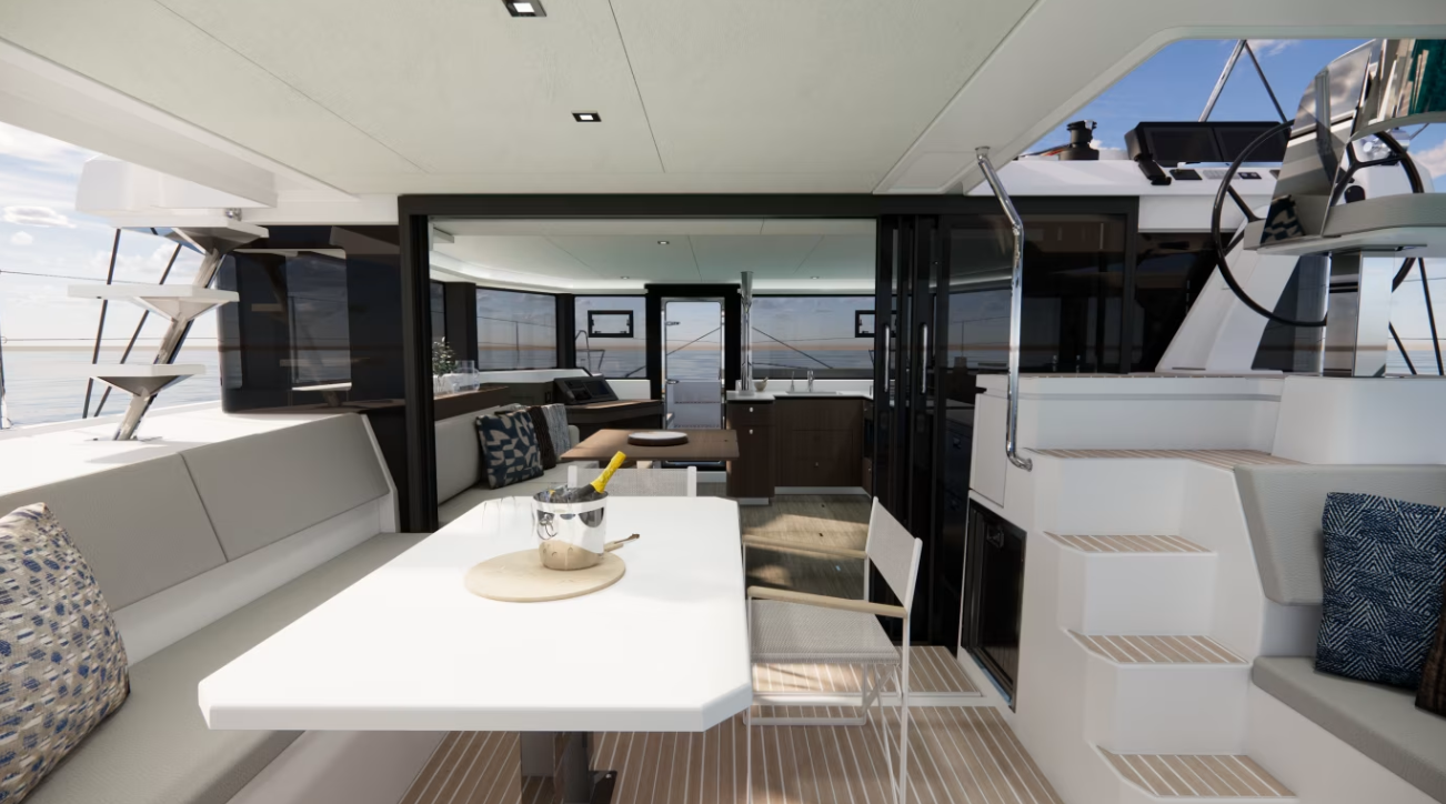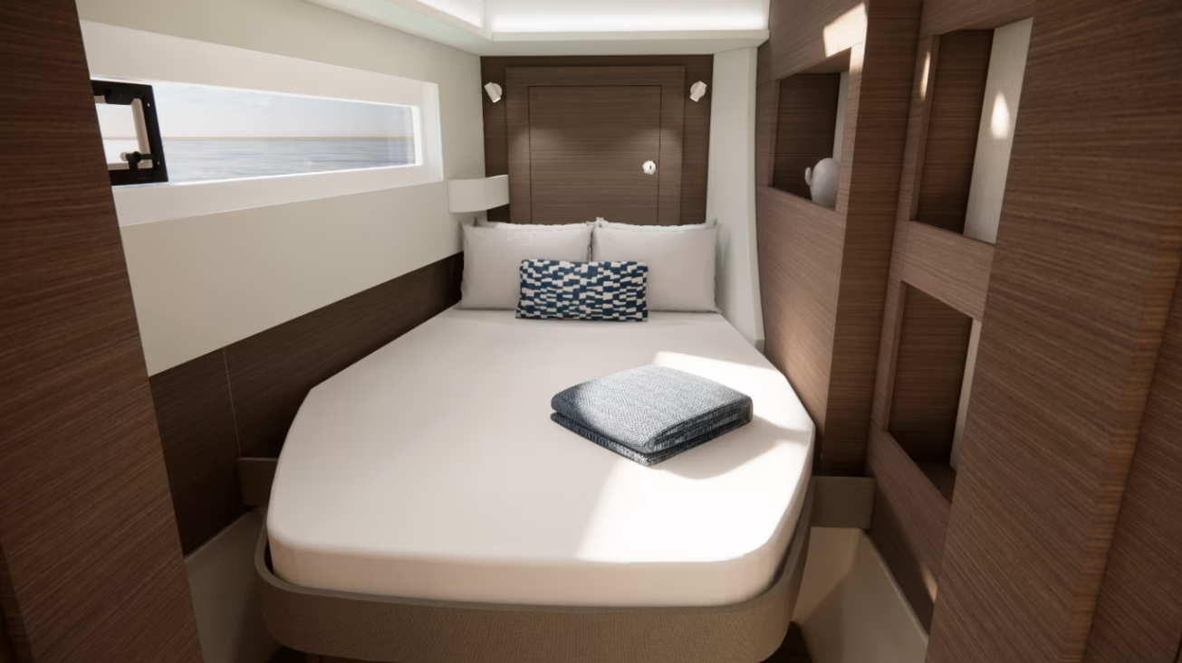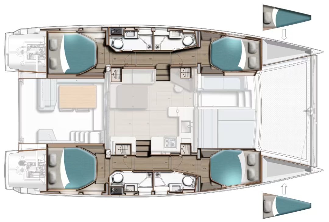 | Inside | Gasherd mit Backofen, Generator, Inverter 12V/220V, Klimaanlage (ohne Landstrombedarf), Kühlschrank mit Gefrierfach, Landstromkabel, LED-Innenleuchten, Pantryausstattung, Spülbecken, TV, Ventilatoren in Kabinen, Watermaker, WC (elektr.) |