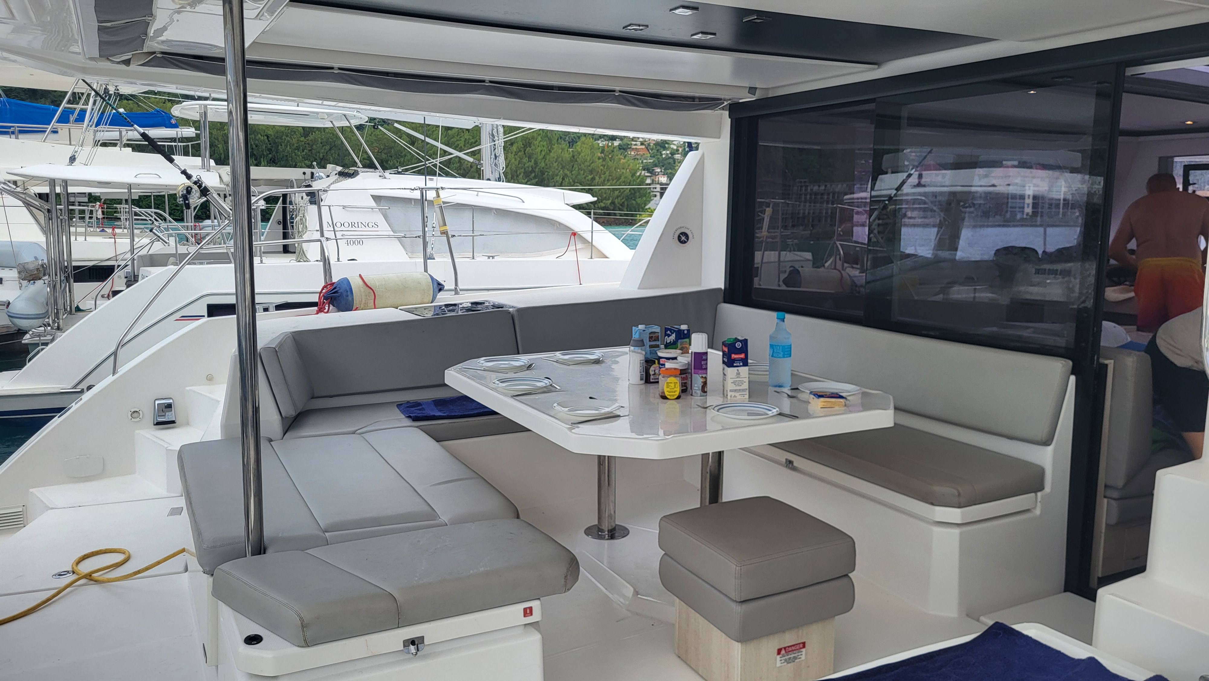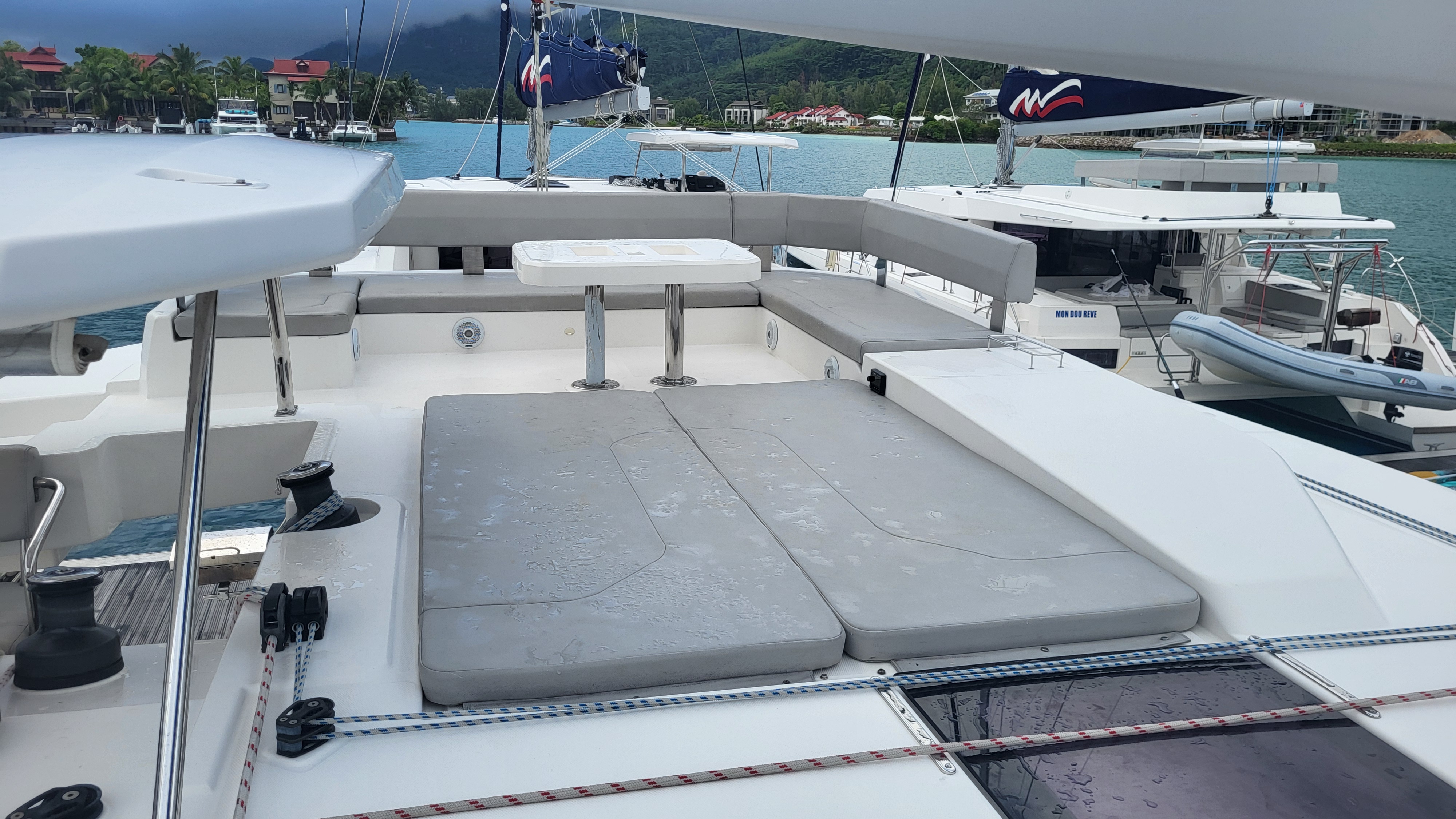 | Inside | 3-flammiger Gasherd, FUSION Sound System, Gefrierschrank, Generator, Klimaanlage (ohne Landstrombedarf), Kühlschrank, Ladegerät, LED-Innenleuchten, Mikrowelle, Pantryausstattung, Radio mit CD, Safe für Wertsachen, Salontisch absenkbar, USB Steckdosen in den Kabinen, Warmwasser |