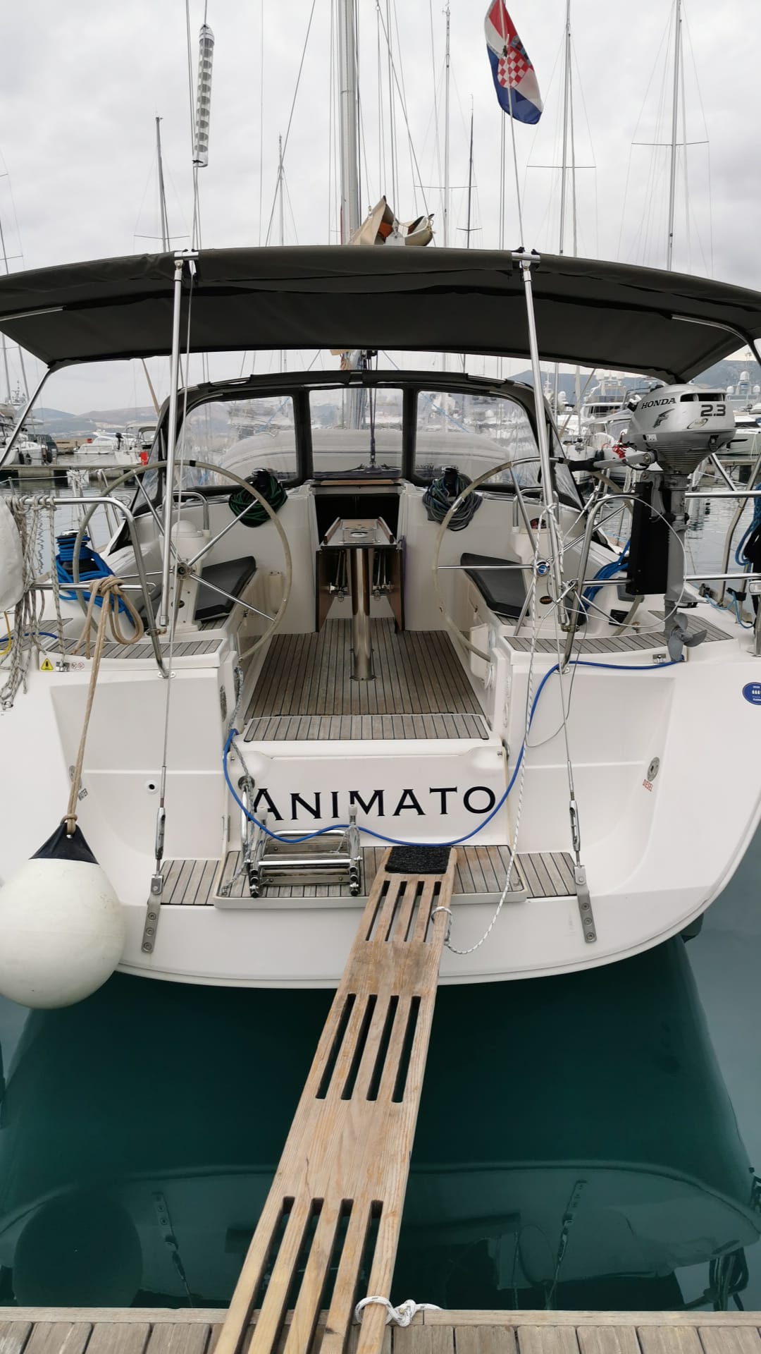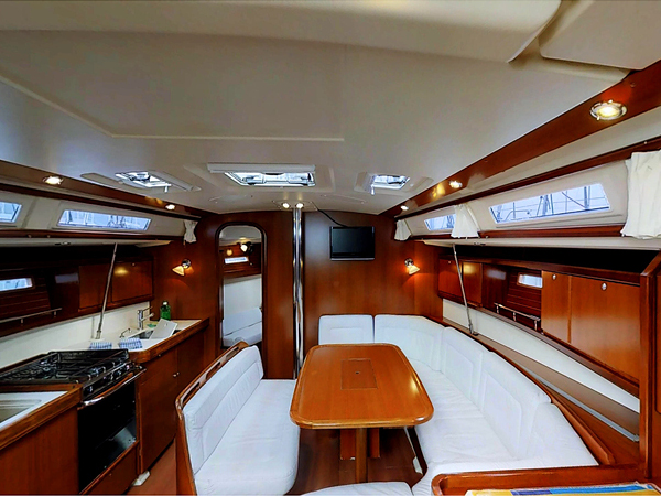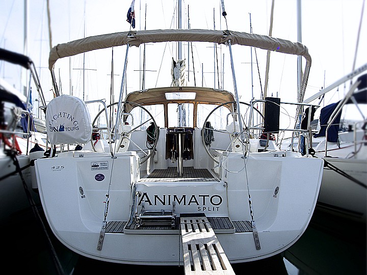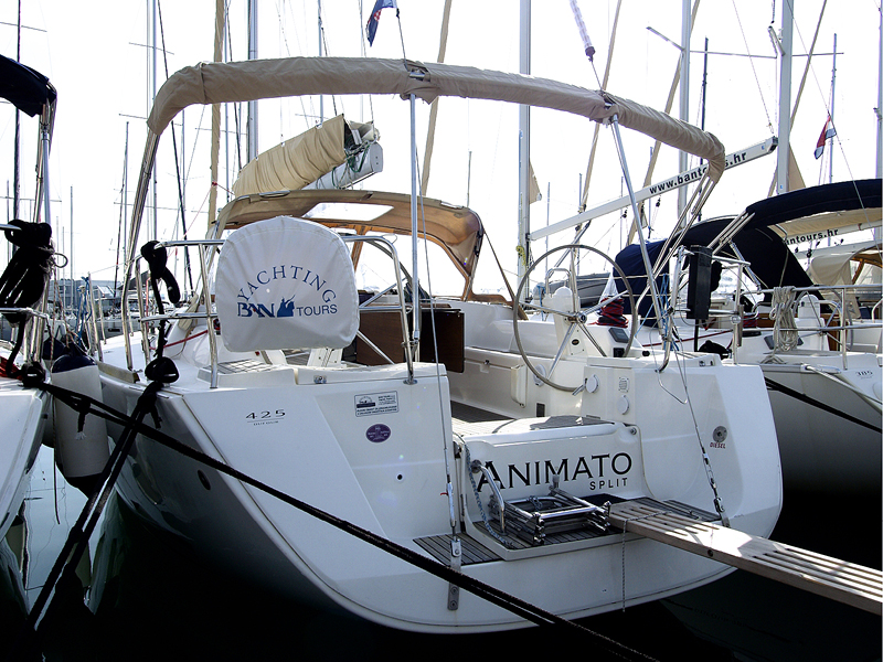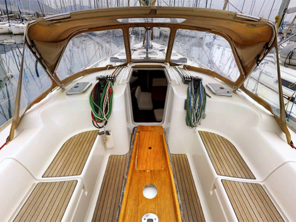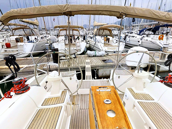 | Outside | Biminitop, Cockpitdusche, Cockpitlautsprecher, Cockpitpolster, Cockpittisch, elektr. Ankerwinsch, Sprayhood, Teak im Cockpit |