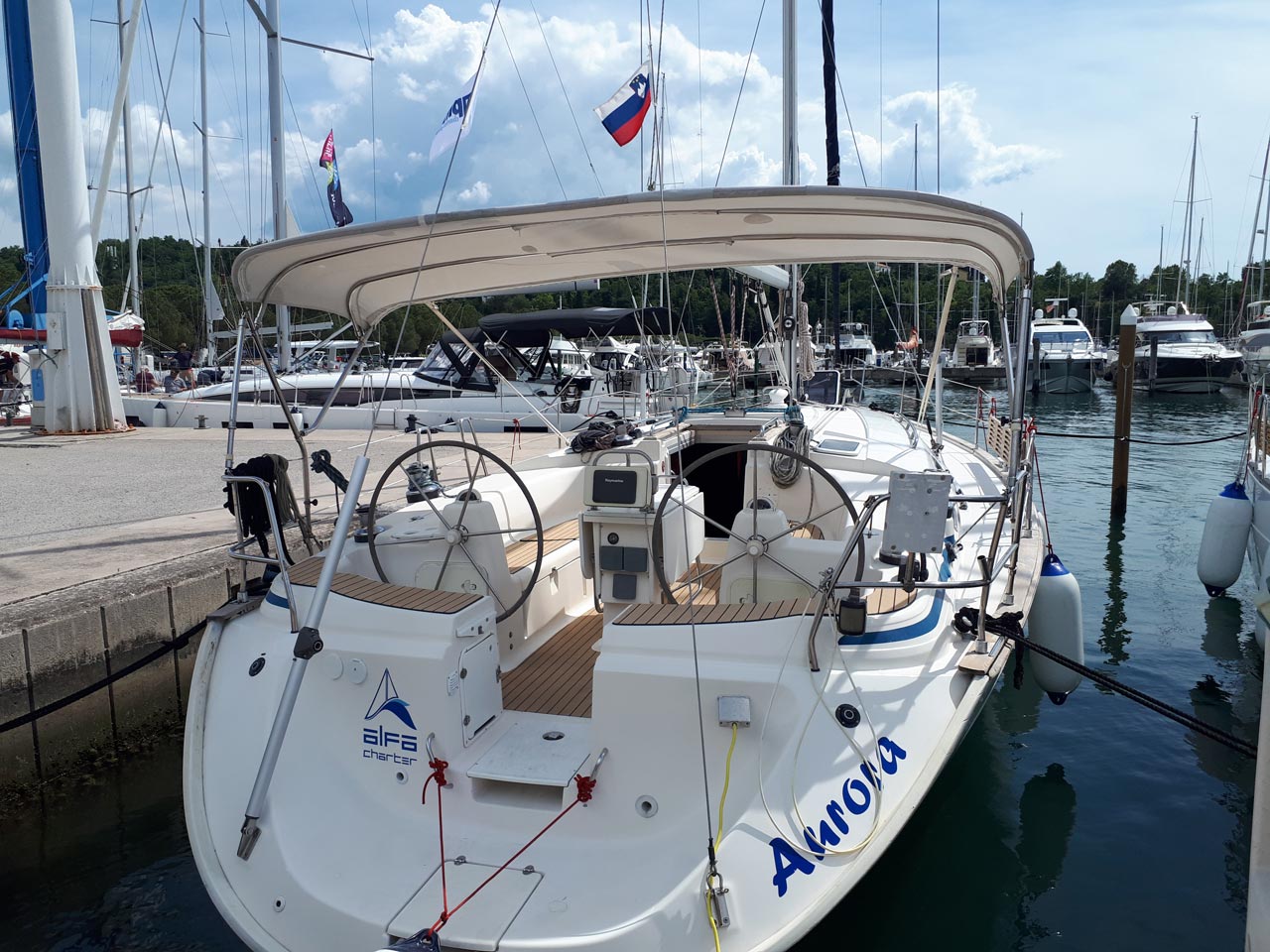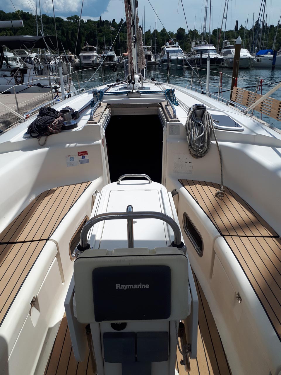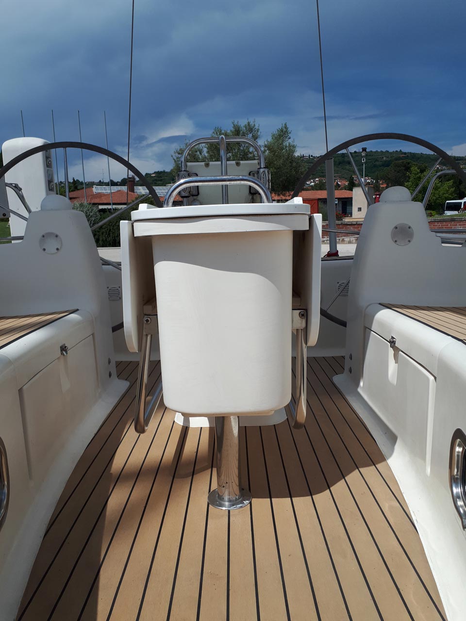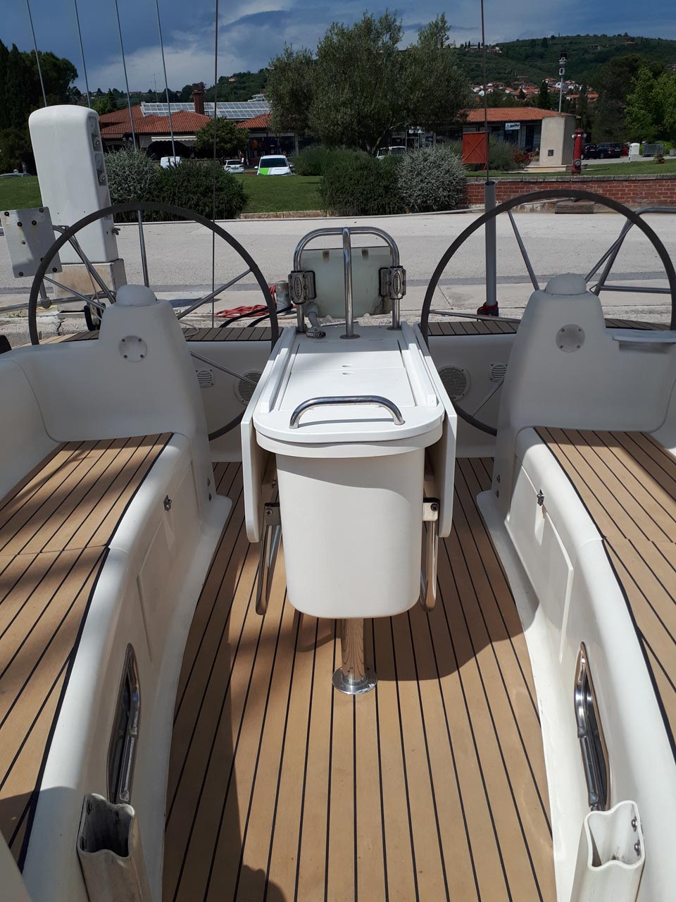 | Outside | 220 V-Landanschluss, Anker mit Kette, Biminitop, Bootshaken, Cockpitdusche, Cockpittisch, Dieselkanister , elektr. Ankerwinsch, Fender, Festmacherleinen, Gangway, Kugelfender, Kunststoff-Eimer (Pütz), Teak im Cockpit, Wantenschneider, Wasserkanister , Wasserschlauch, Windex |