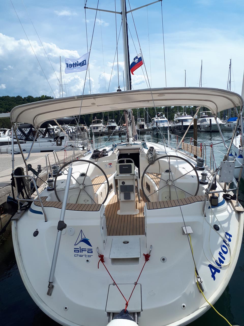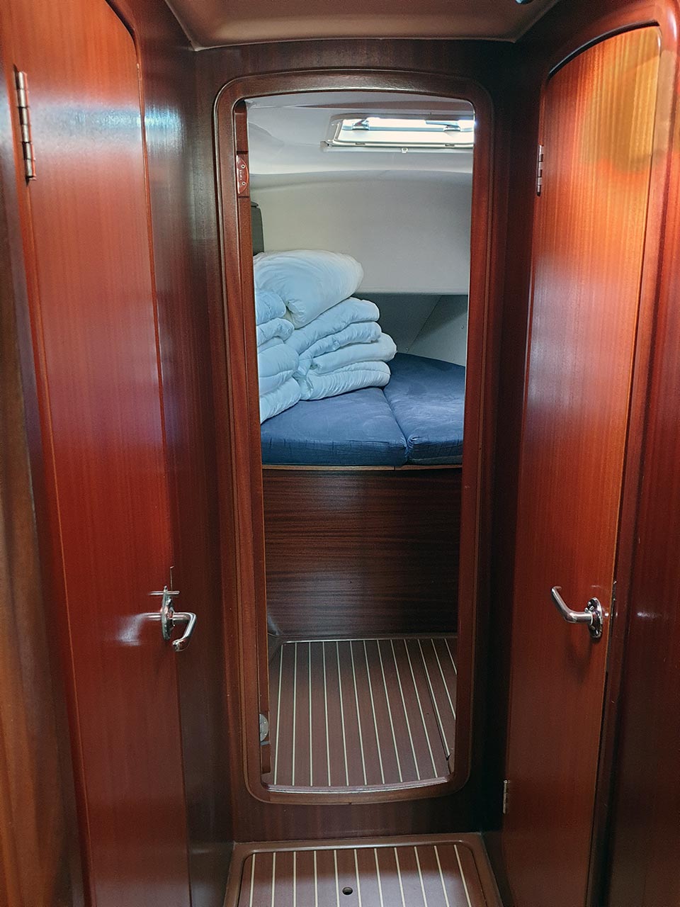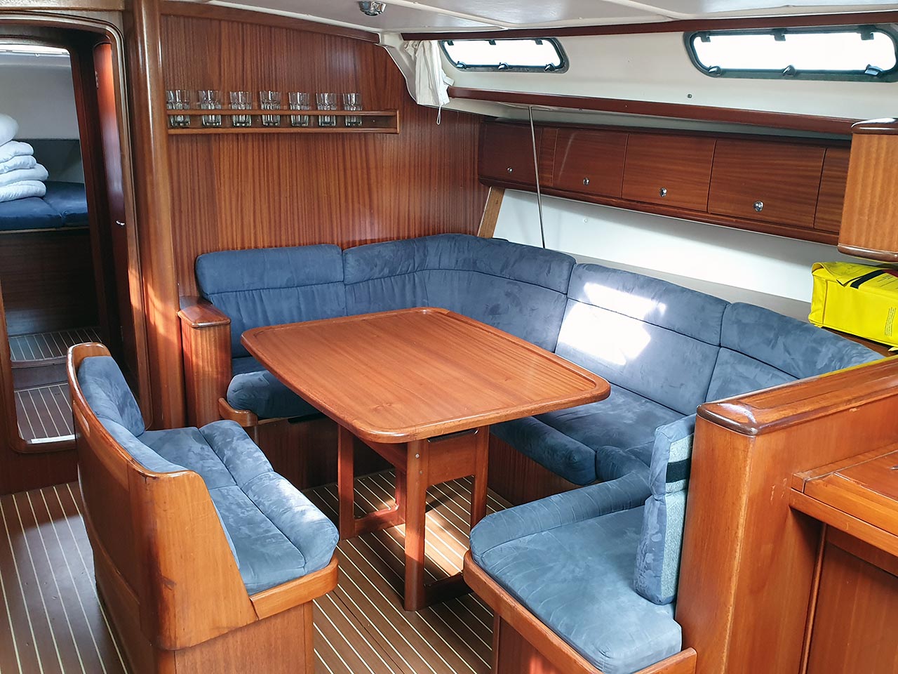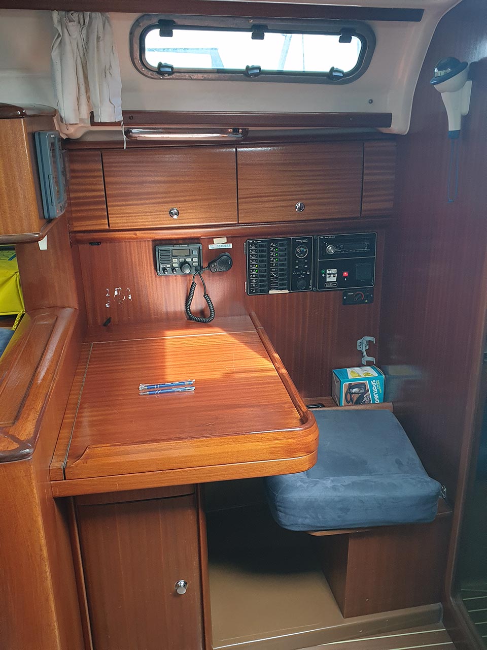 | Navigation | Barometer, Fernglas, GPS mit Kartenplotter im Cockpit, Hafenhandbücher, Handpeilkompass, Navigationsbesteck, Radar, Seekarten, Tridata (Log, Echolot, Windm.) |