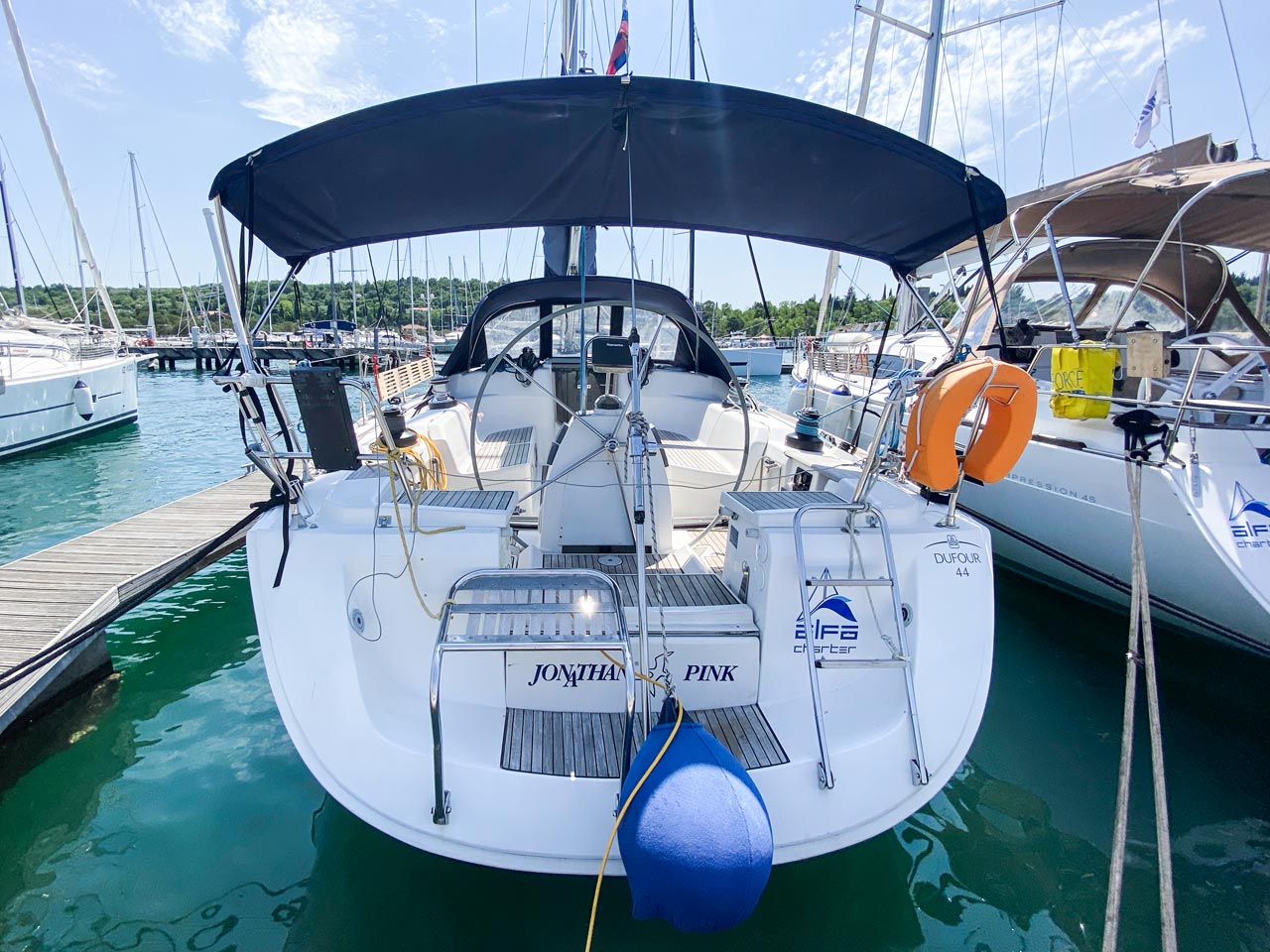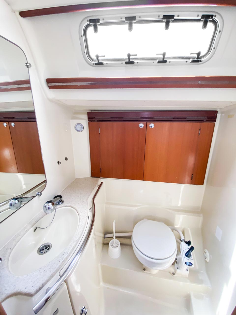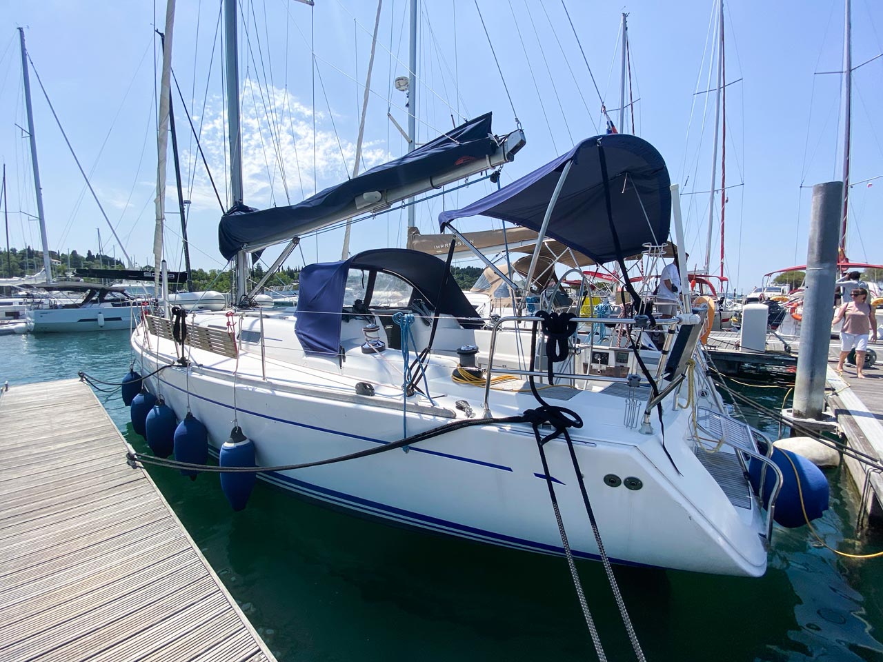 | Outside | 220 V-Landanschluss, Anker mit Kette, Ankerwinsch, Biminitop, Bootshaken, Cockpitdusche, Cockpitlautsprecher, Cockpittisch, Dieselkanister , elektr. Ankerwinsch, Fender, Festmacherleinen, Gangway, Kugelfender, Kunststoff-Eimer (Pütz), Sprayhood, Teak im Cockpit, Wantenschneider, Wasserkanister , Wasserschlauch, Windex |