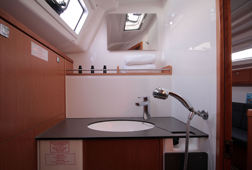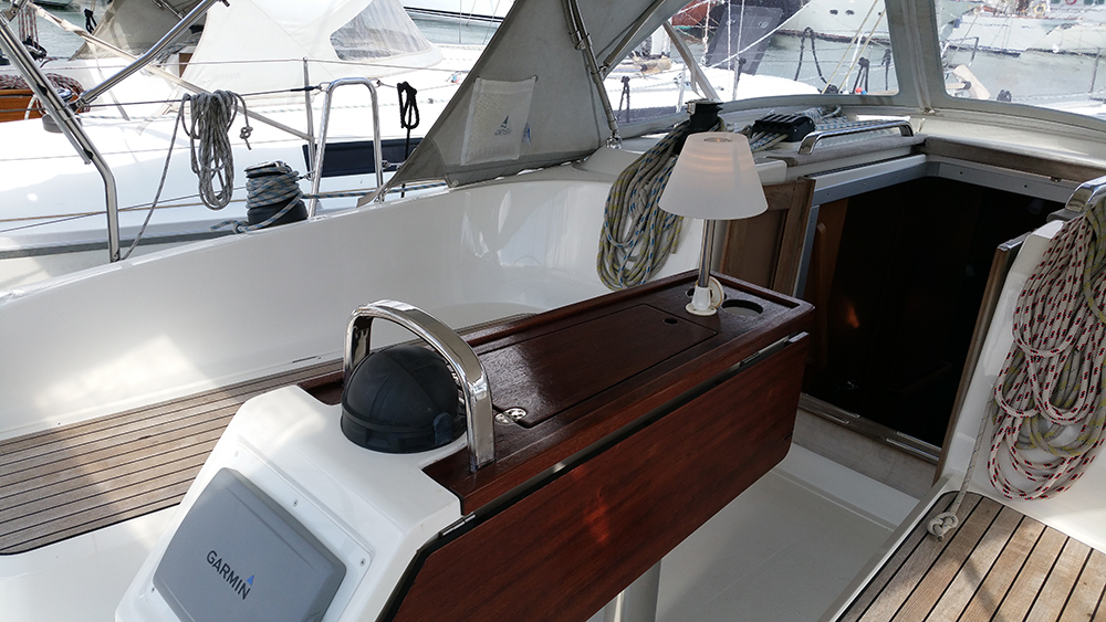 | Outside | 12 V-Anschluss, 220 V-Landanschluss, Badeleiter, Badeplattform, Benzinkanister, Biminitop, Cockpitdusche, Cockpitlautsprecher, Cockpittisch, elektr. Ankerwinsch, Fender, Gangway, Kugelfender, Sprayhood, Teakdeck, Treibanker, Windex |
