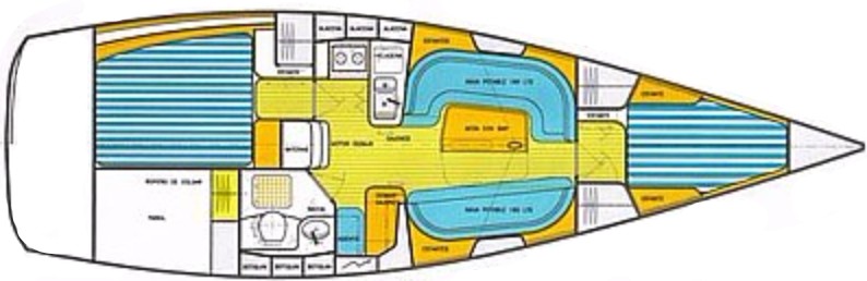 | Safety | AIS Empfänger, Autopilot, Bordapotheke, elektr. Bilgepumpe, Epirb, Feststoffschwimmwesten, Leuchtboje, Navigationslichter, Notpinne, Notsignale, Rettungsinsel, Sicherheitsgurt, Taschenlampe, UKW-Funk |