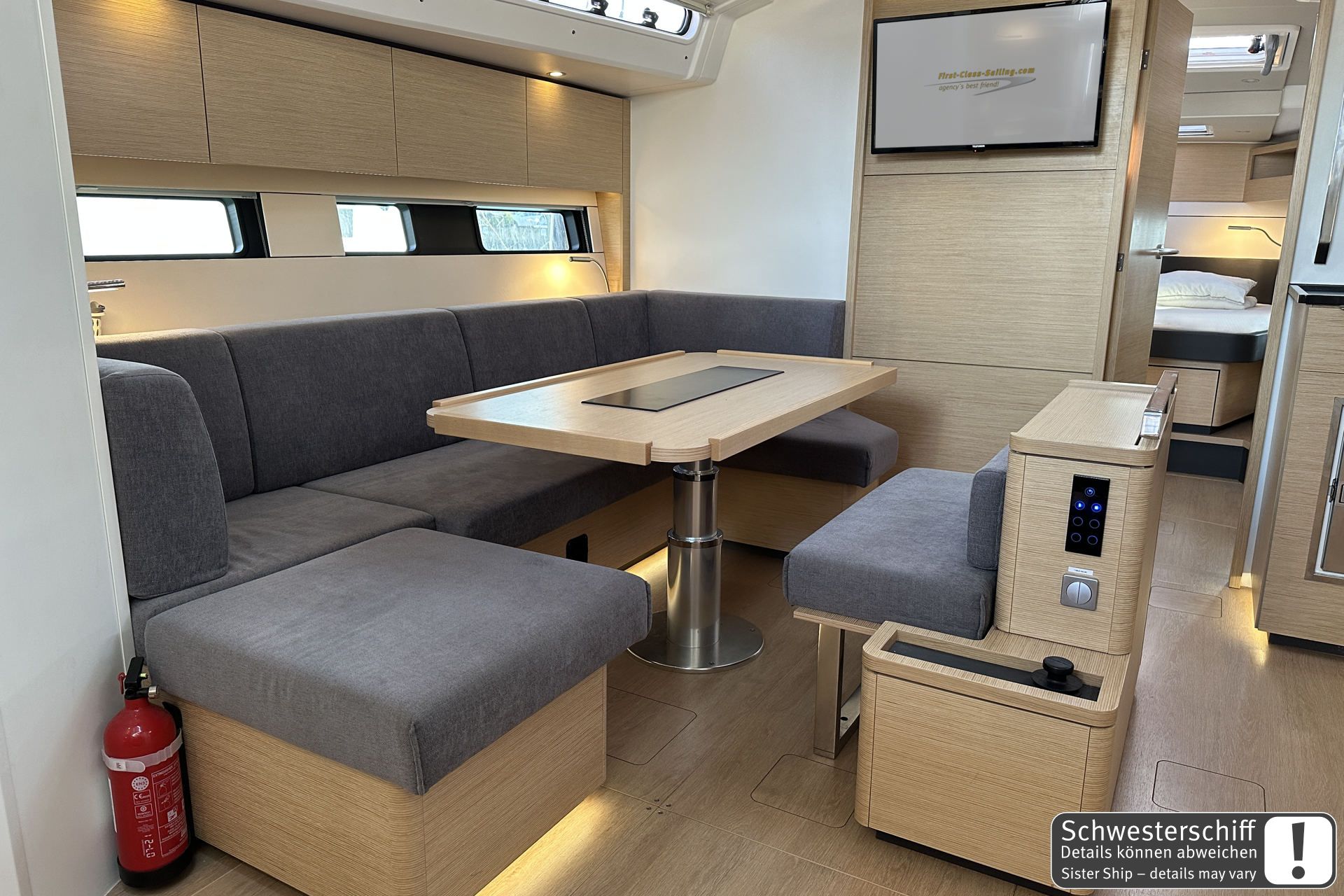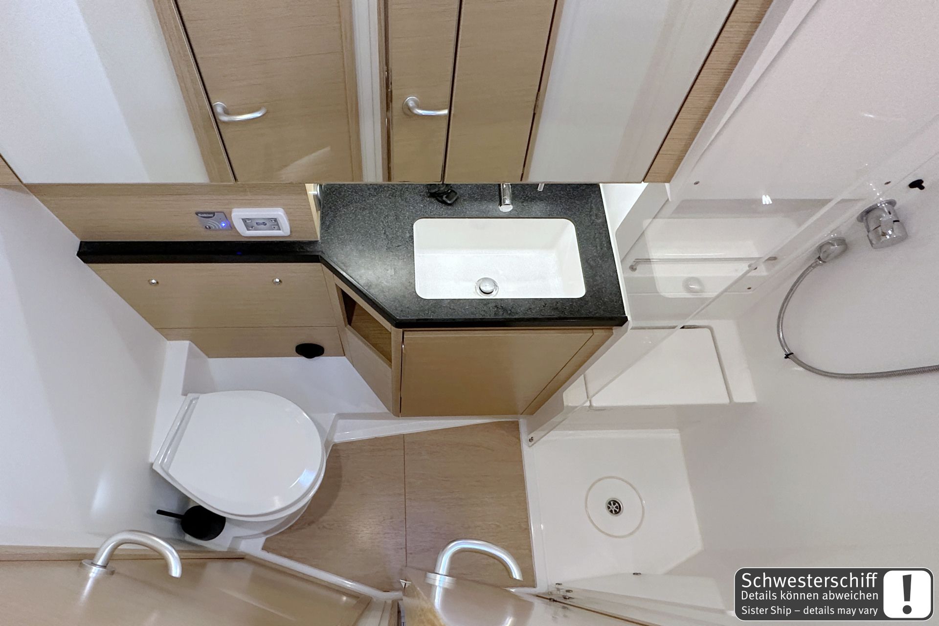 | Outside | 12 V-Anschluss, 220 V-Landanschluss, Anker mit Kette, Badeleiter, Badeplattform, Biminitop, Bootshaken, Cockpitdusche, Cockpitlautsprecher, Cockpitpolster, Cockpittisch, Davits, Deckbürste, Dieselkanister , elektr. Ankerwinsch, elektr. Winsch, Fallwinschen, Faltpropeller, Fender, Festmacherleinen, Kunststoff-Eimer (Pütz), Seereling, Sprayhood, Teak im Cockpit, Teakdeck, Wantenschneider, Windex |