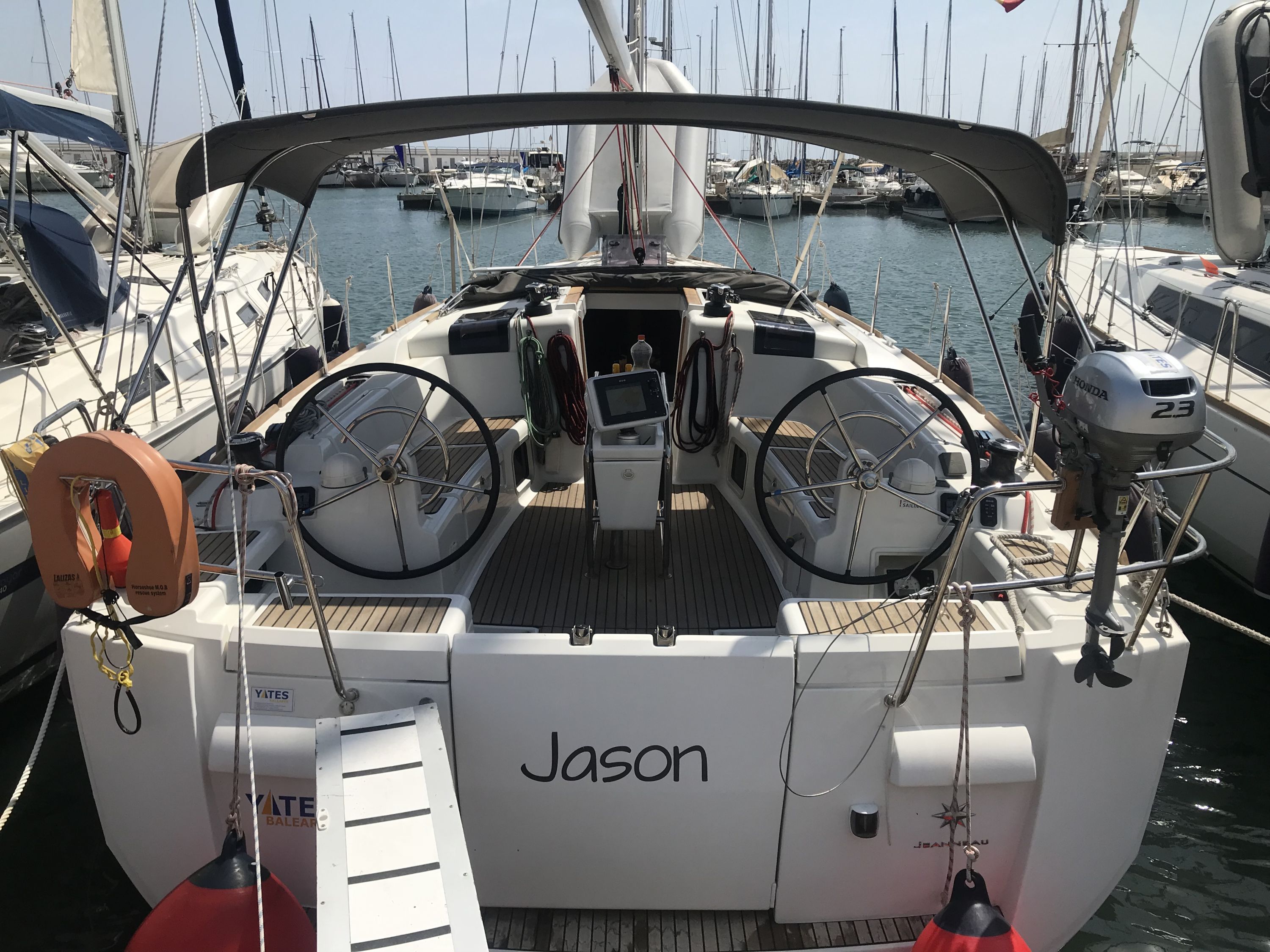 | Safety | AIS Empfänger, Automatikwesten, Autopilot, Bootsmannstuhl, Bordapotheke, Bordwerkzeug, Bugstrahlruder, elektr. Bilgepumpe, Epirb, Leuchtboje, Navigationslichter, Notpinne, Notsignale, Rettungsinsel, Rettungskragen, Sicherheitsgurt, Sicherheitsnetz, Taschenlampe, UKW-Funk m. DSC |
