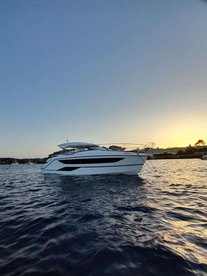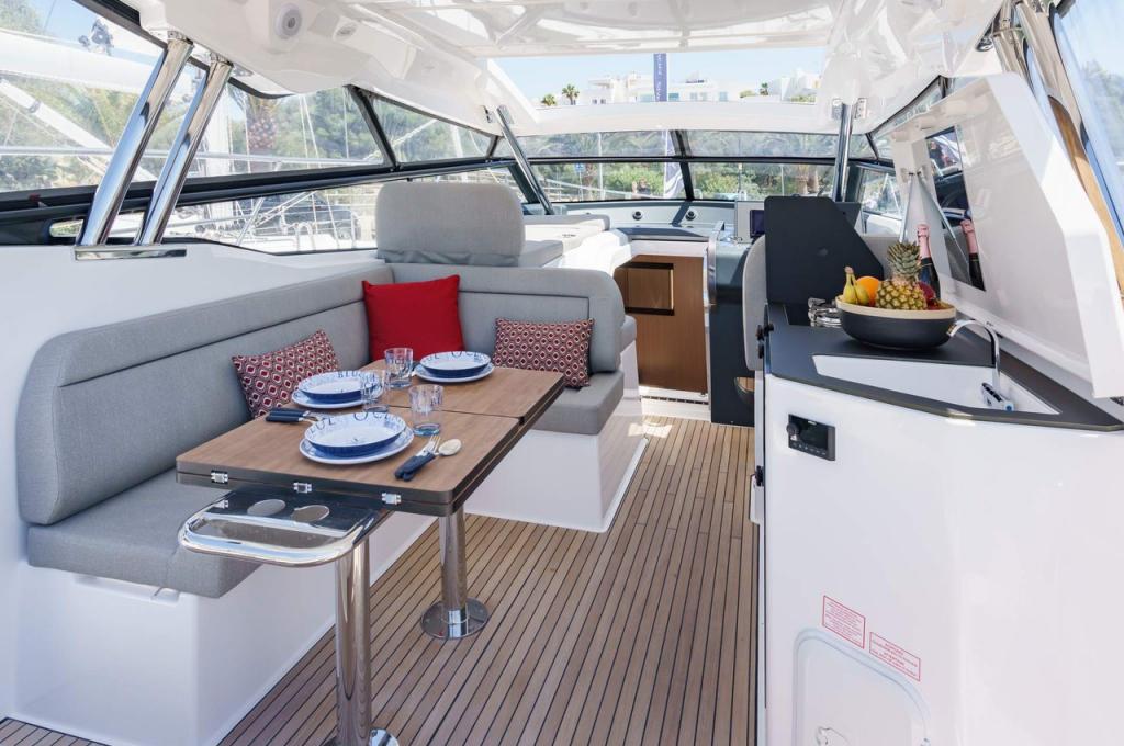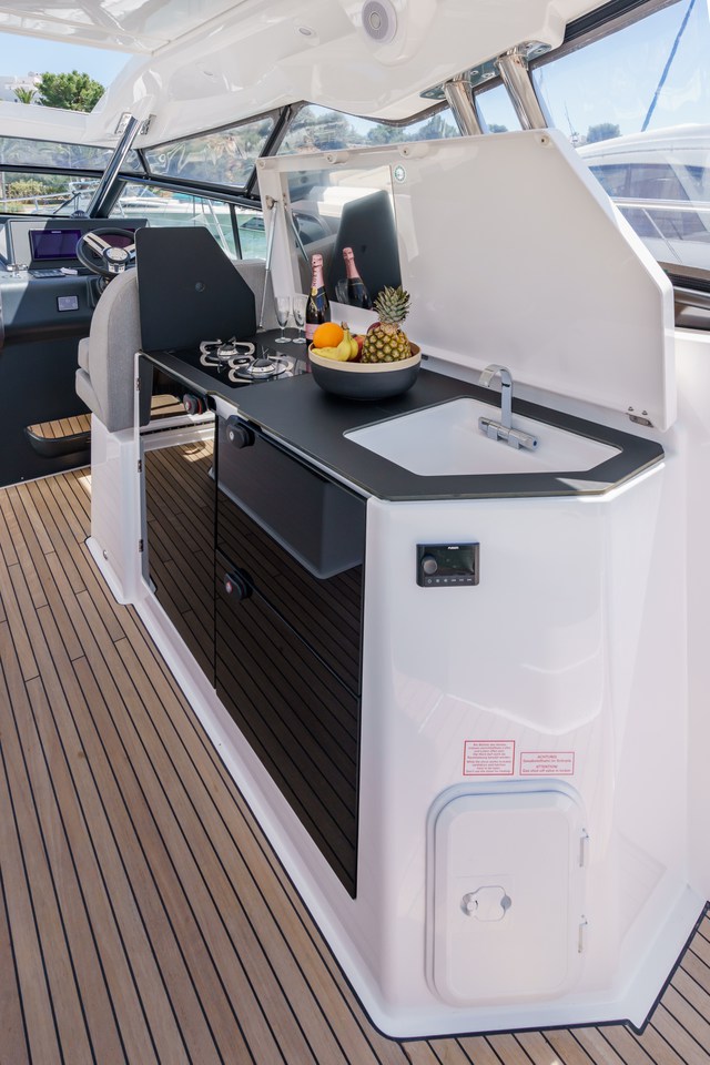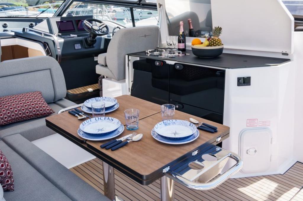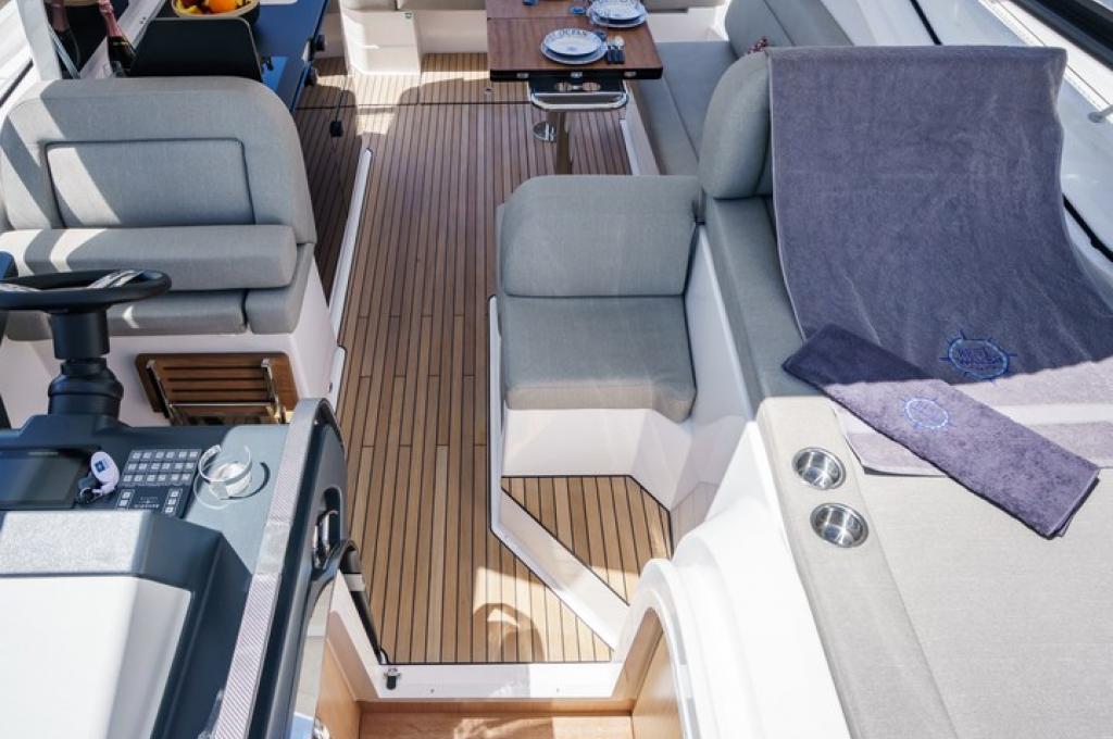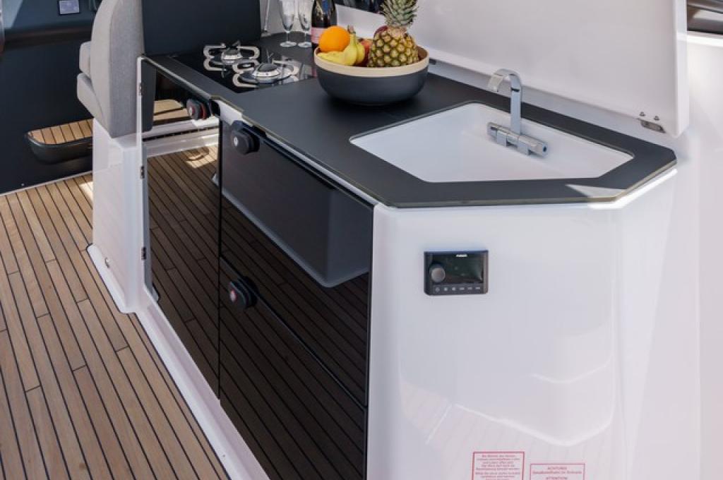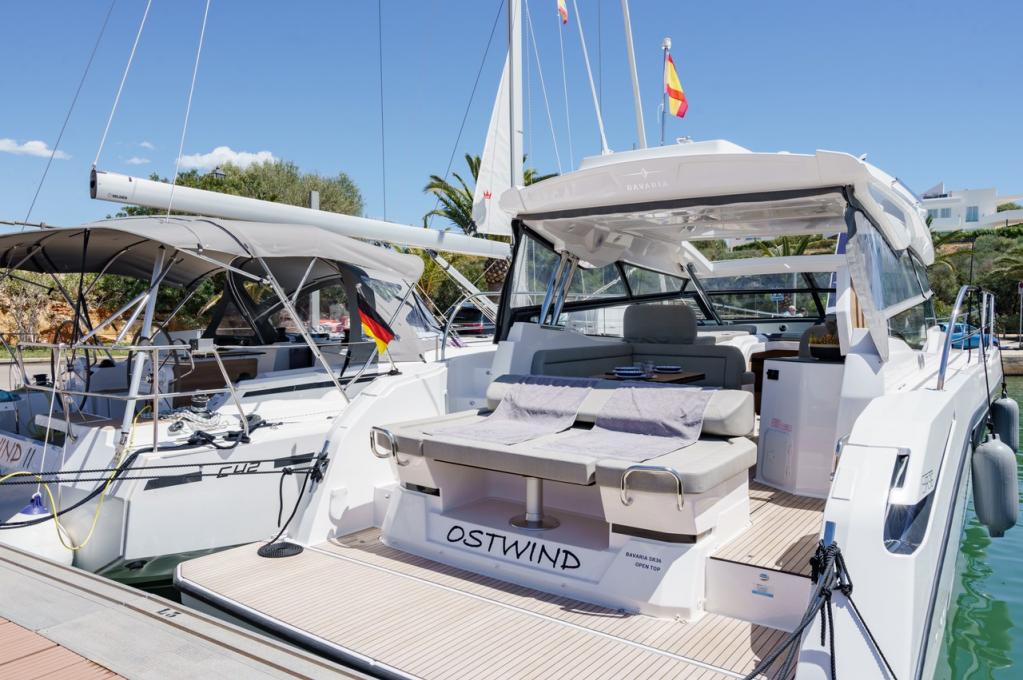 | Outside | Anker mit Kette, Badeplattform, Biminitop, Bootshaken, Cockpitdusche, Cockpitlautsprecher, Cockpittisch, Deckbeleuchtung, Delta-Anker, elektr. Ankerwinsch, Fender, Festmacherleinen, Kugelfender, Kunststoff-Eimer (Pütz), Sprayhood, Teakdeck |