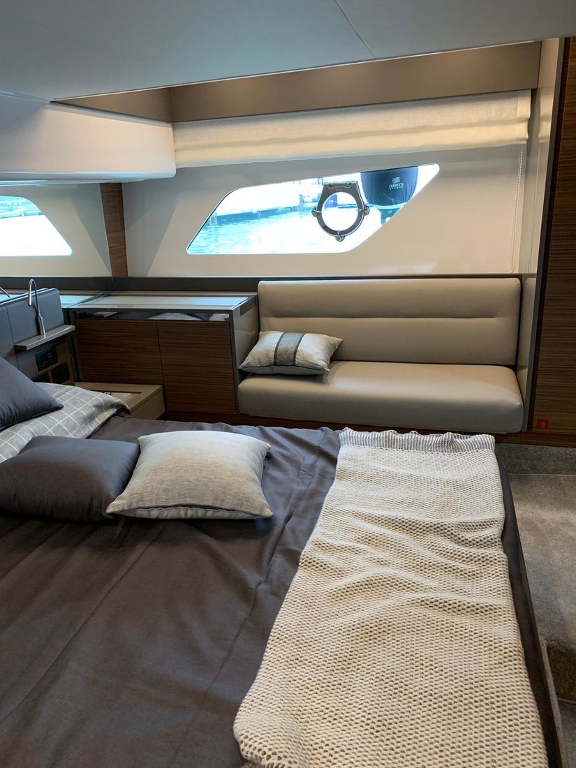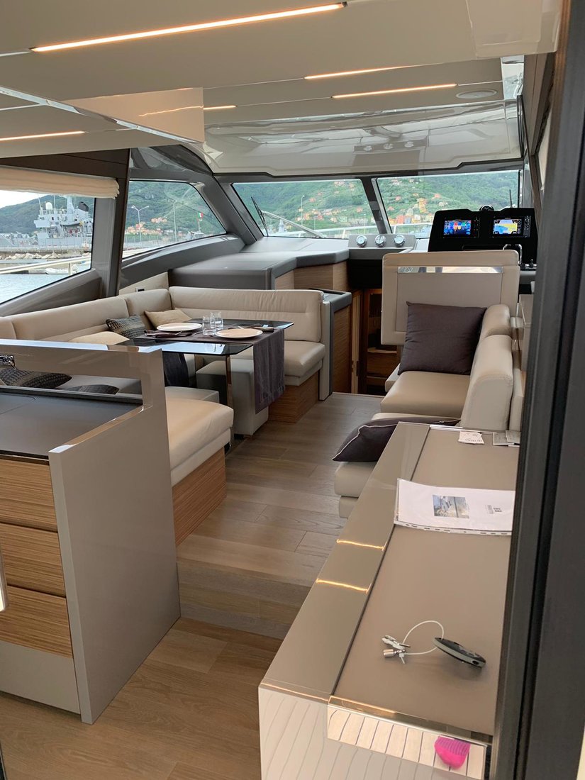 | Outside | 12 V-Anschluss, 220 V-Landanschluss, Anker mit Kette, Badeleiter, Badeplattform (hydr.), Biminitop, Cockpitdusche, Cockpitlautsprecher, Cockpittisch, elektr. Ankerwinsch, Flybridge, Gangway, Grill, Sonnensegel, Teakdeck |