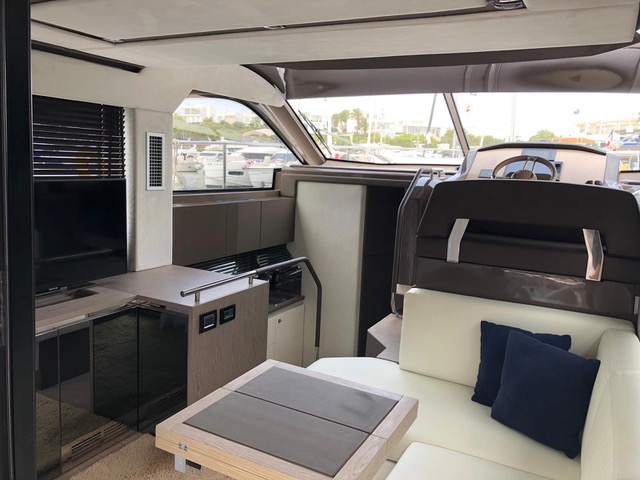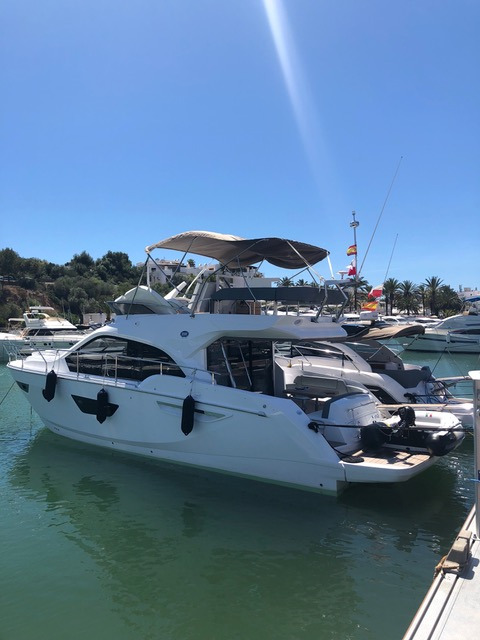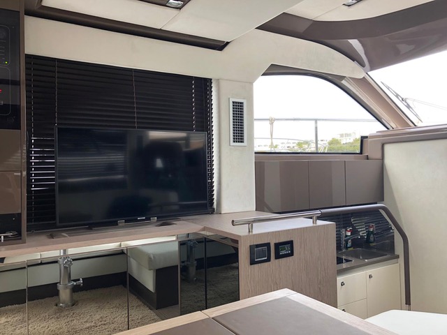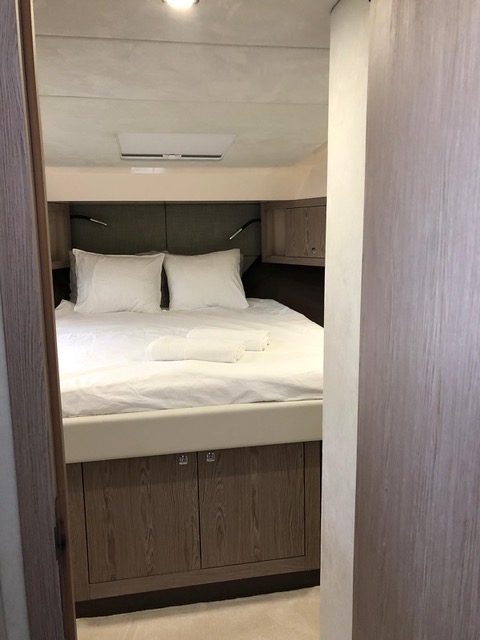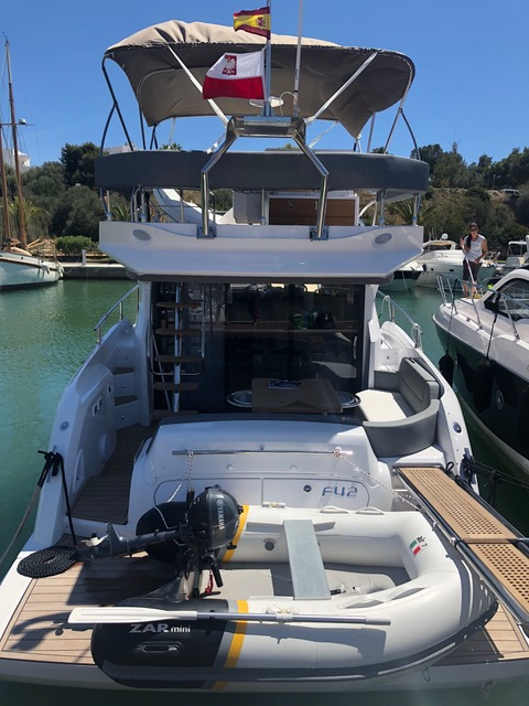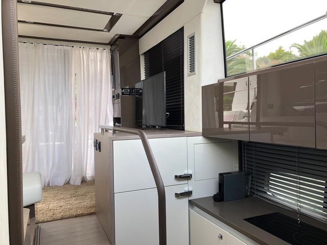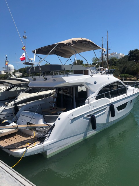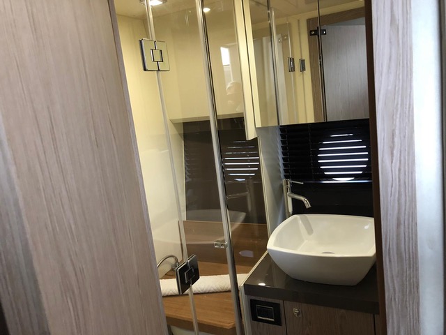 | Outside | 12 V-Anschluss, 220 V-Landanschluss, Anker mit Kette, Badeleiter, Badeplattform (hydr.), Biminitop, Cockpitdusche, Cockpitlautsprecher, Cockpittisch, elektr. Ankerwinsch, Flybridge, Gangway, Grill, Sonnensegel, Teakdeck |