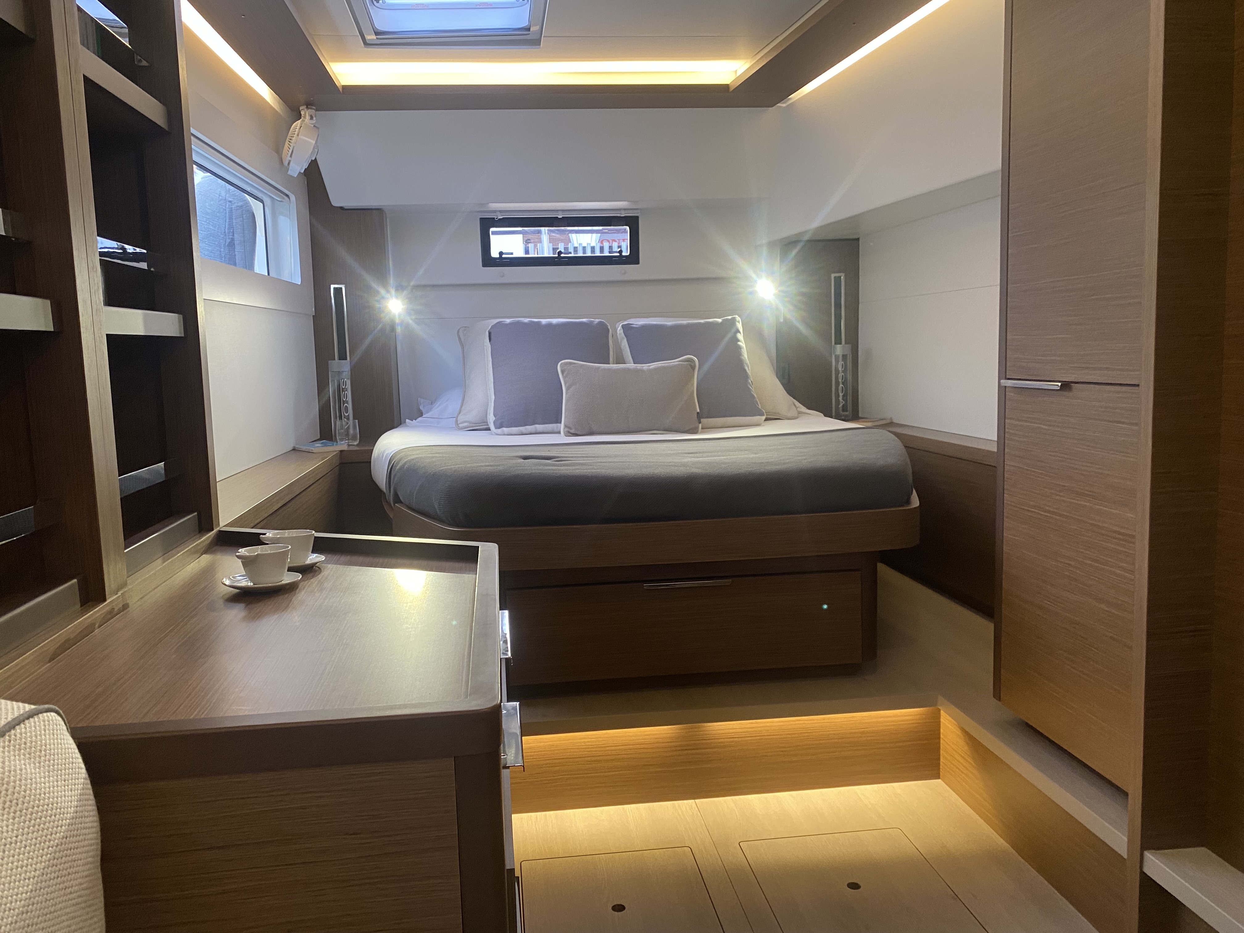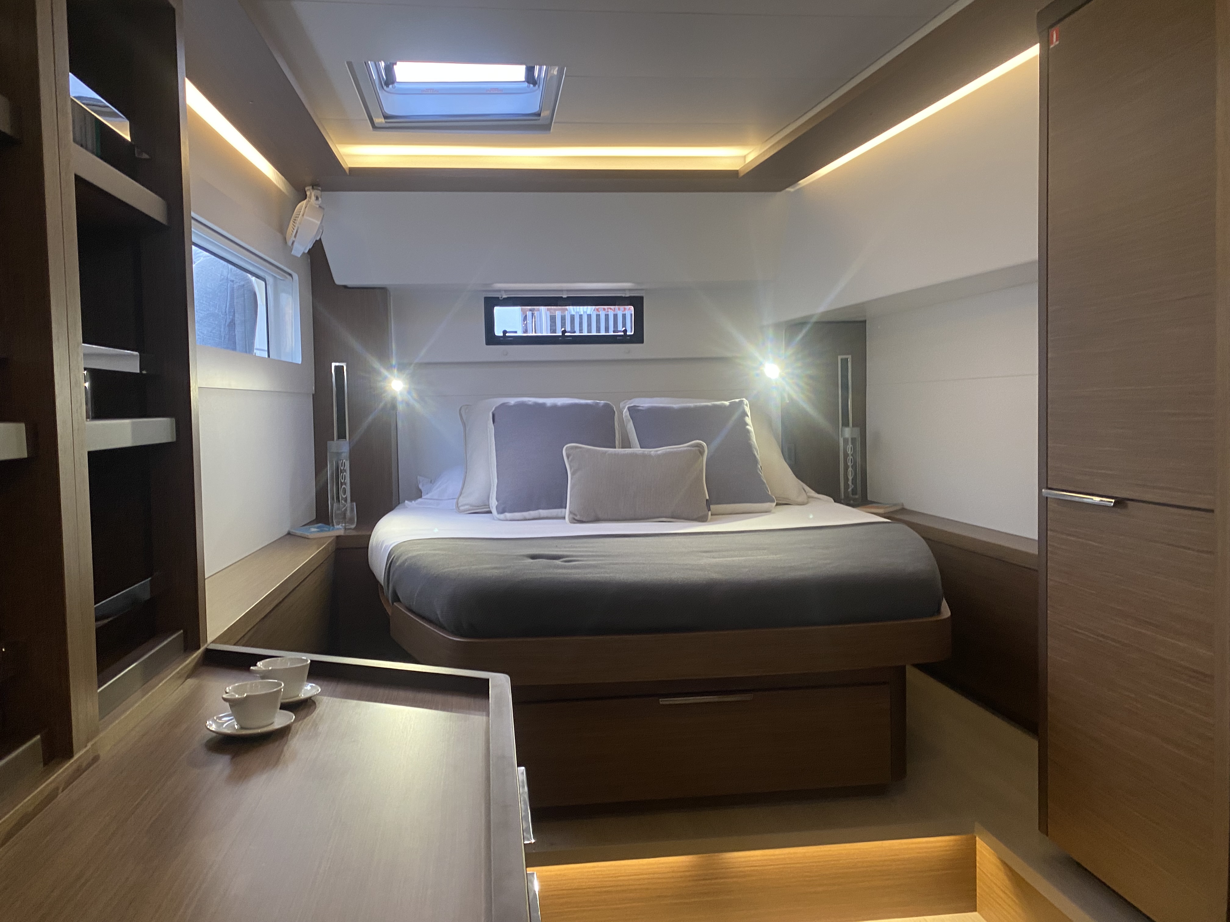 | Inside | Backofen, Gefrierschrank, Generator, Klimaanlage (ohne Landstrombedarf), Kühlschrank, Mikrowelle, TV, Ventilatoren in Salon und Kabinen, Watermaker, WC (elektr.) |