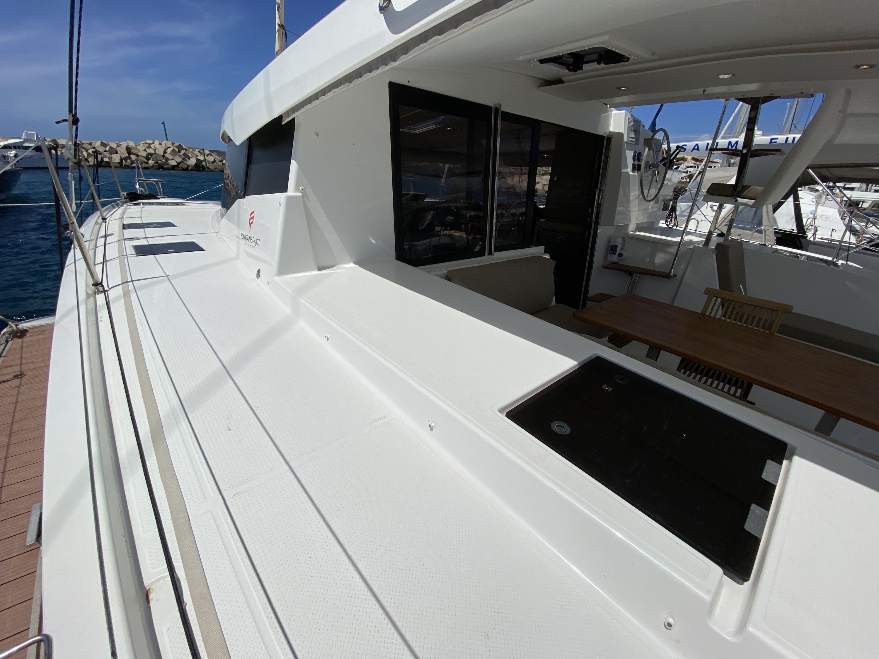 | Outside | Badeleiter, Biminitop, Cockpitdusche, Fender, Fernsteuerung für elektr. Ankerwinsch, Festmacherleinen, Solaranlage, Winschen |