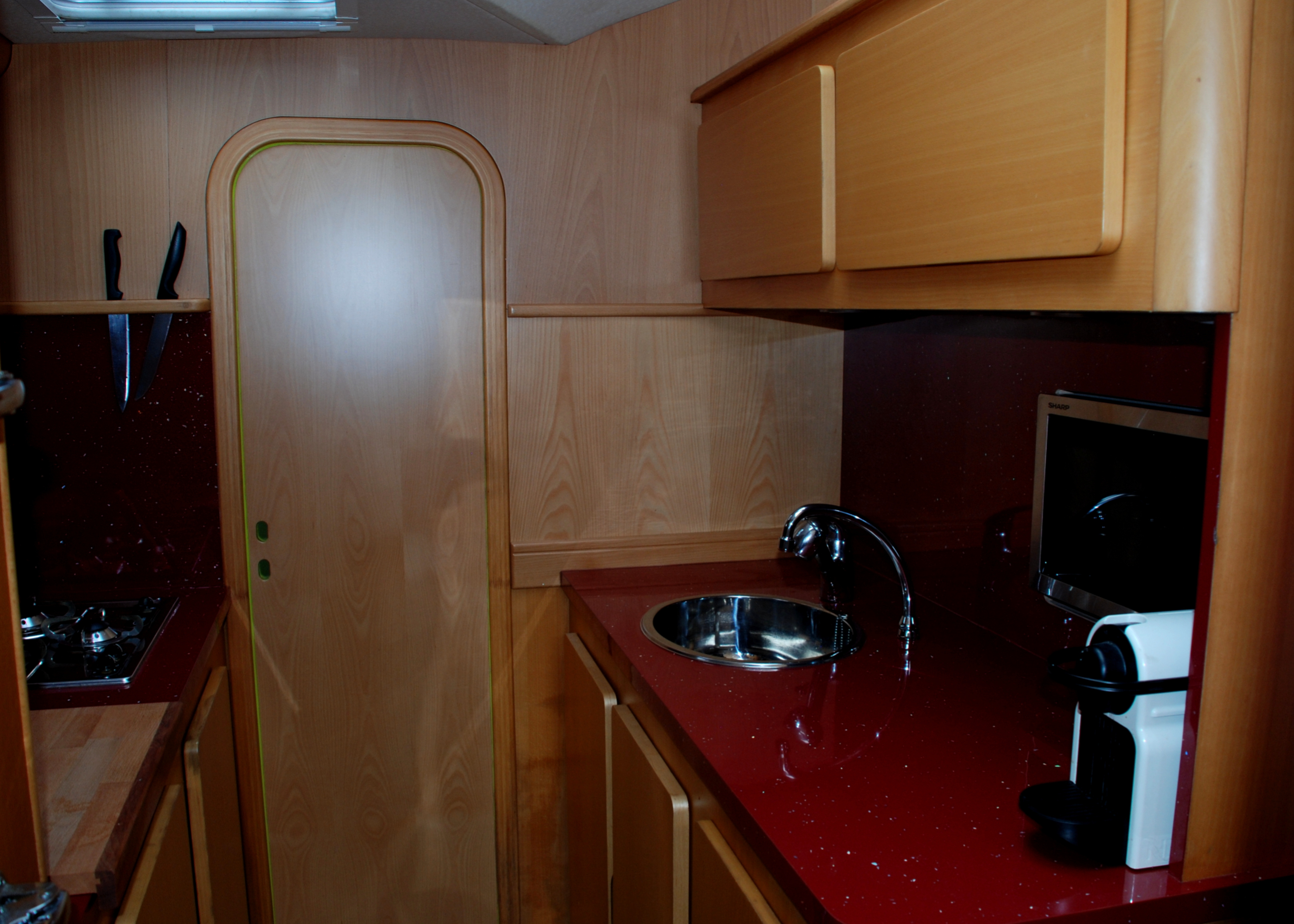 | Inside | Gasherd mit Backofen, Gefrierschrank, Generator, Kaffeemaschine, Klimaanlage (ohne Landstrombedarf), Kühlschrank, Mikrowelle, Waschmaschine |
